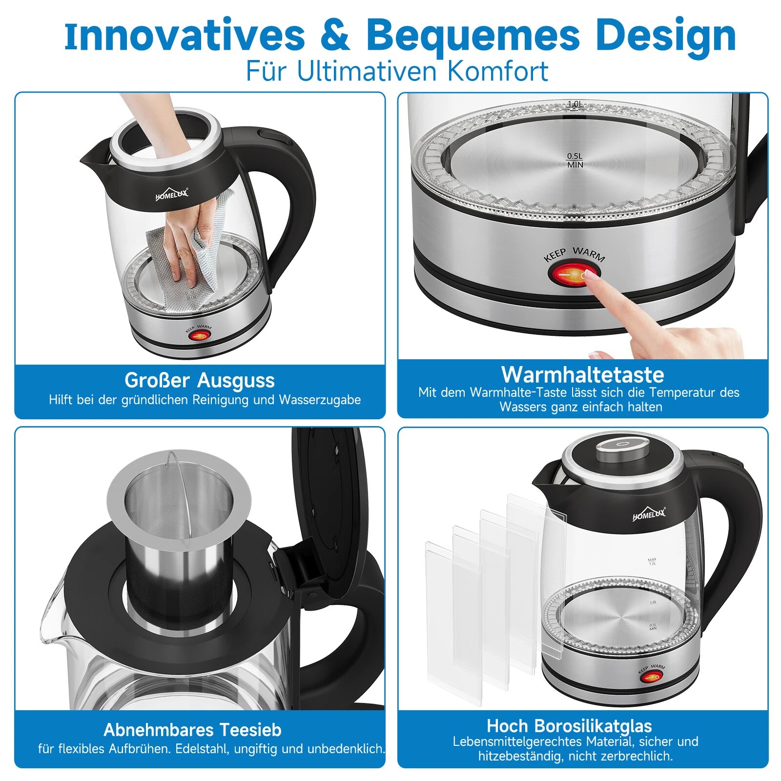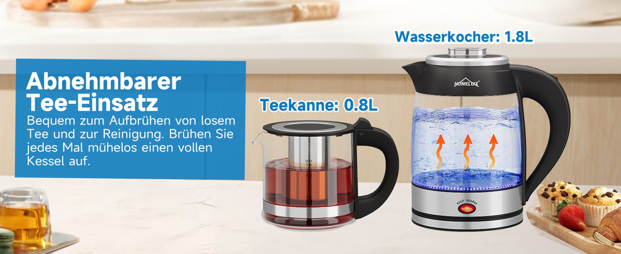 HOMELUX Electric Tea Maker serves as both a 1.8 liter kettle and a 0.8 liter tea maker. With our glass teapot, you can effortlessly boil water or prepare a variety of teas - ideal for all tea lovers.