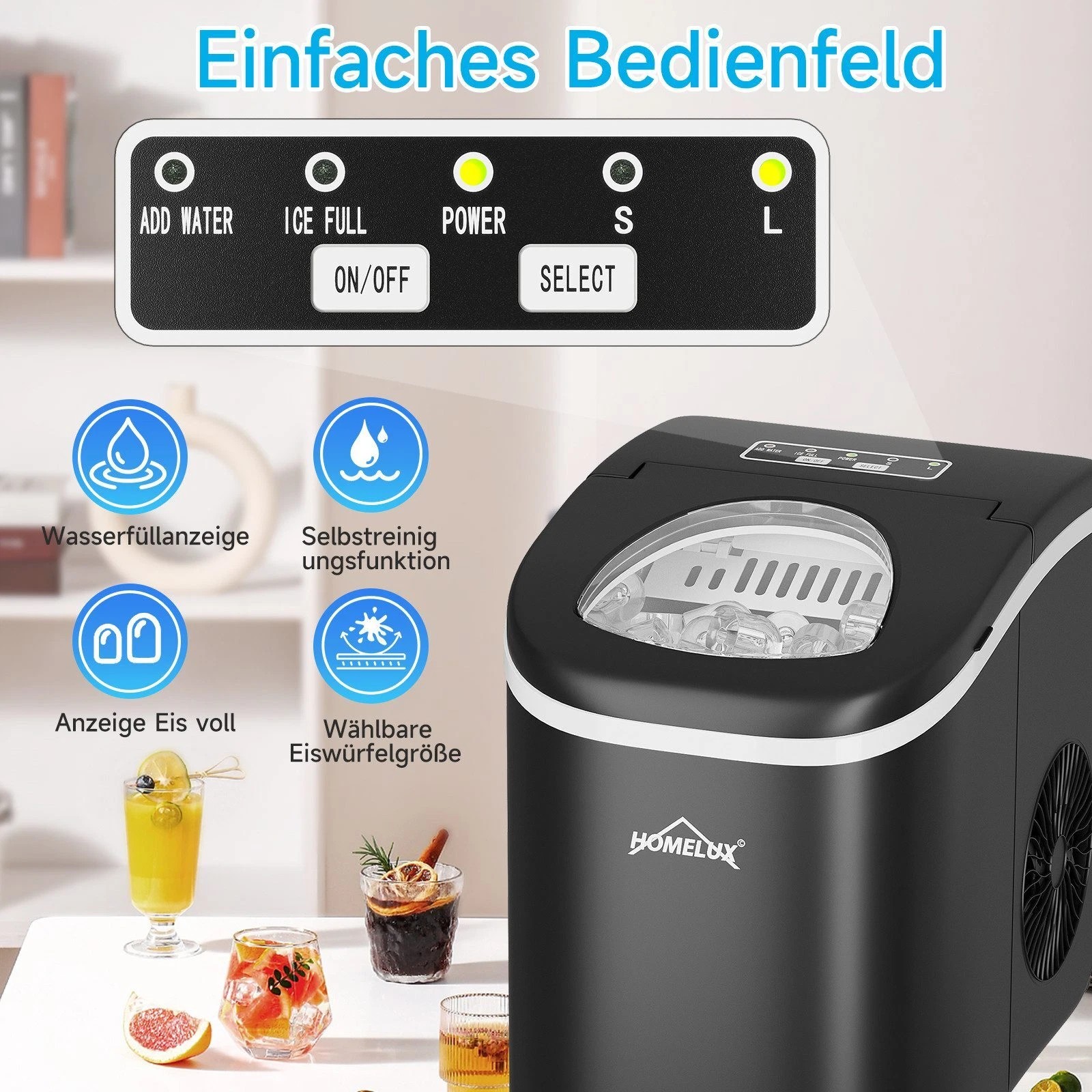 The Homelux ice cube machine is equipped with a practical self-cleaning function. It is activated simply by pressing the POWER button for 3 seconds, which starts the cleaning mode with four indicator lights flashing alternately. For optimum performance, it is recommended to regularly clean the interior of the ice cube machine with a solution of vinegar or baking soda diluted with water.