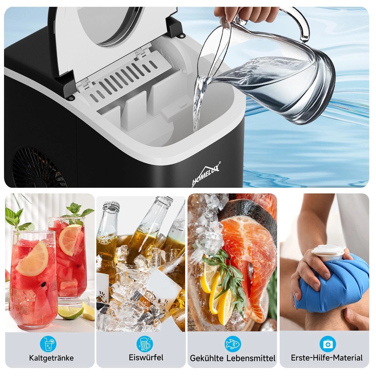 The portable ice cube maker from Homelux comes in a versatile and compact design measuring 26(D)*22(W)*28.5(H) cm. The sturdy handle allows effortless transportation with just one hand. Ideal for various occasions, such as kitchen use, at home, when camping, on motorhome trips and at parties, this ice cube maker offers ice enjoyment anytime and anywhere.