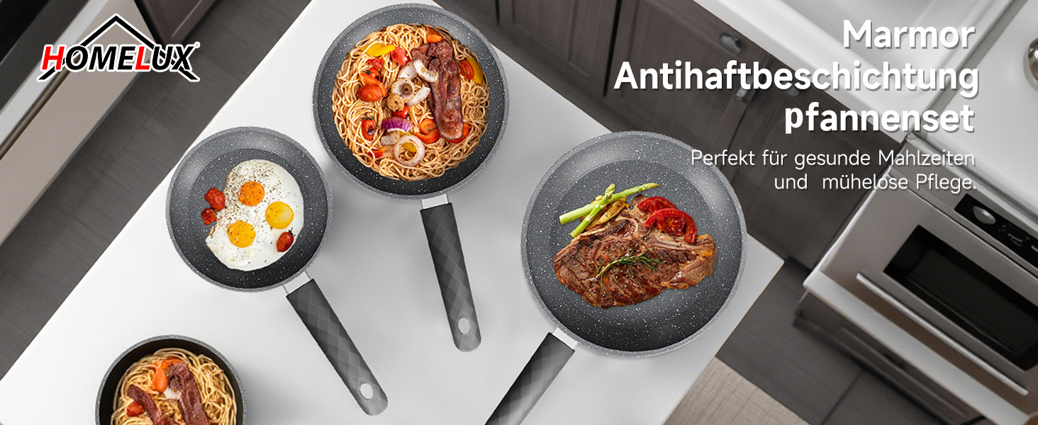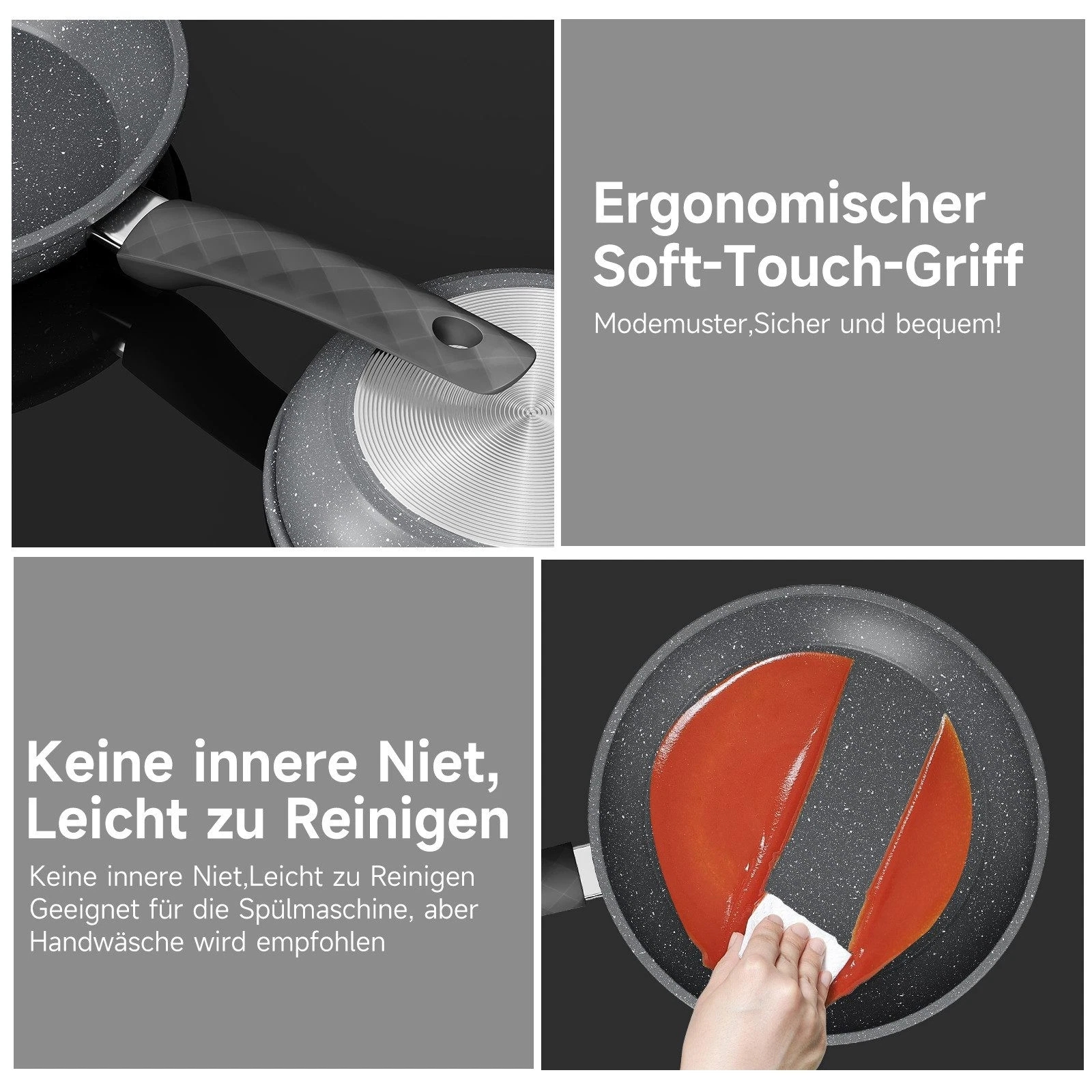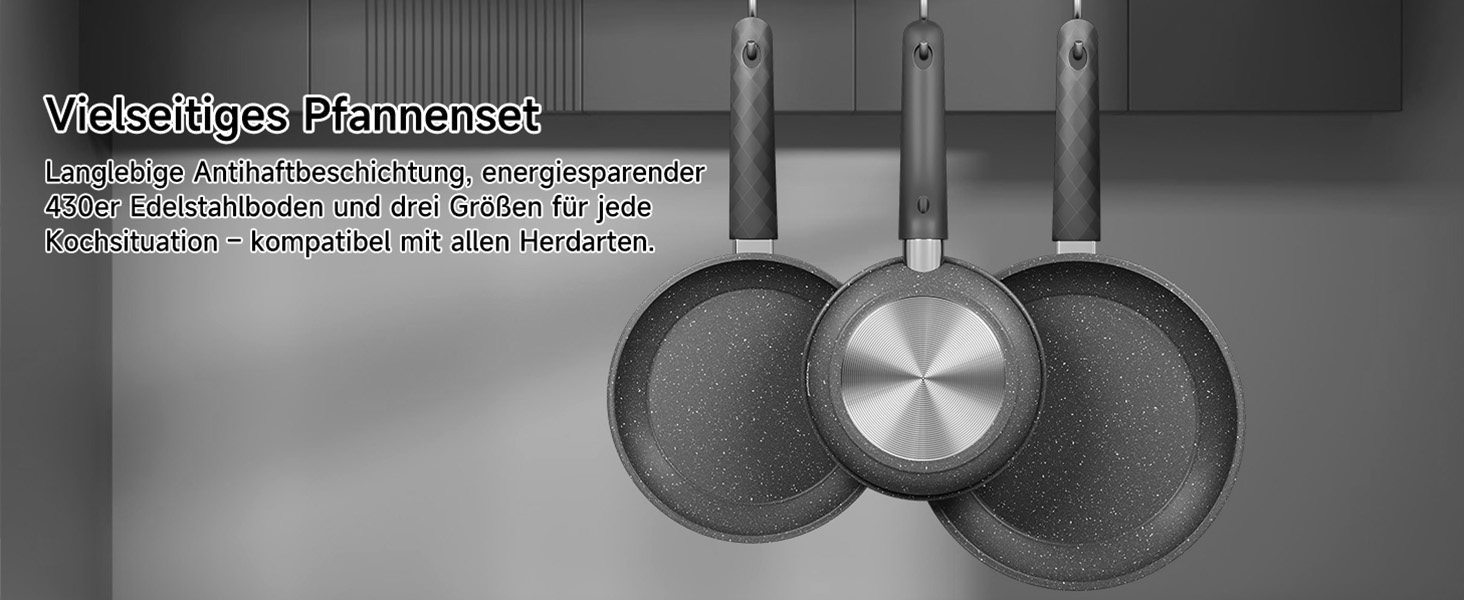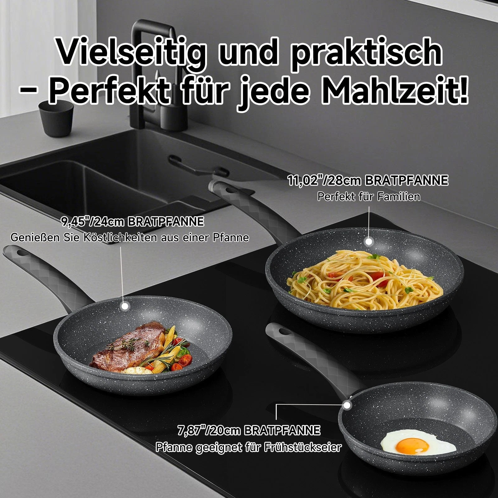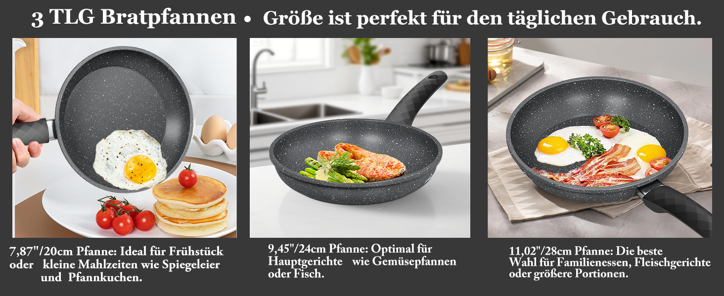 The pan set includes three frying pans with diameters of 20 cm, 24 cm, and 28 cm – particularly versatile: from small breakfast dishes to large family meals. The 28 cm pan is perfect for stir-fries, roasts, or vegetables – a true all-rounder in any kitchen.
