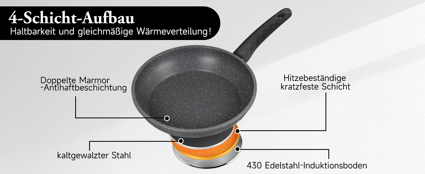 The pan features a two-layer marble non-stick coating with white speckles (PTFE), making cooking and cleaning particularly easy. Thanks to the high-quality coating technology, nothing sticks—ideal for low-fat frying. Free from harmful chemicals for safe and healthy food preparation.