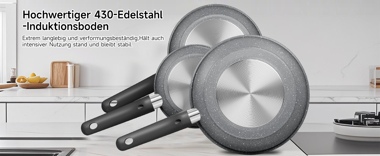 This pan set made of cold-rolled steel with a double-layer heat-protection coating and an induction base made of 430 stainless steel ensures optimal heat distribution and heat retention. This allows you to achieve perfect frying results with minimal energy consumption.