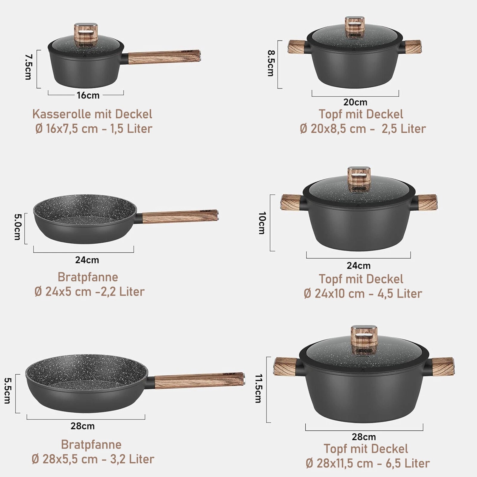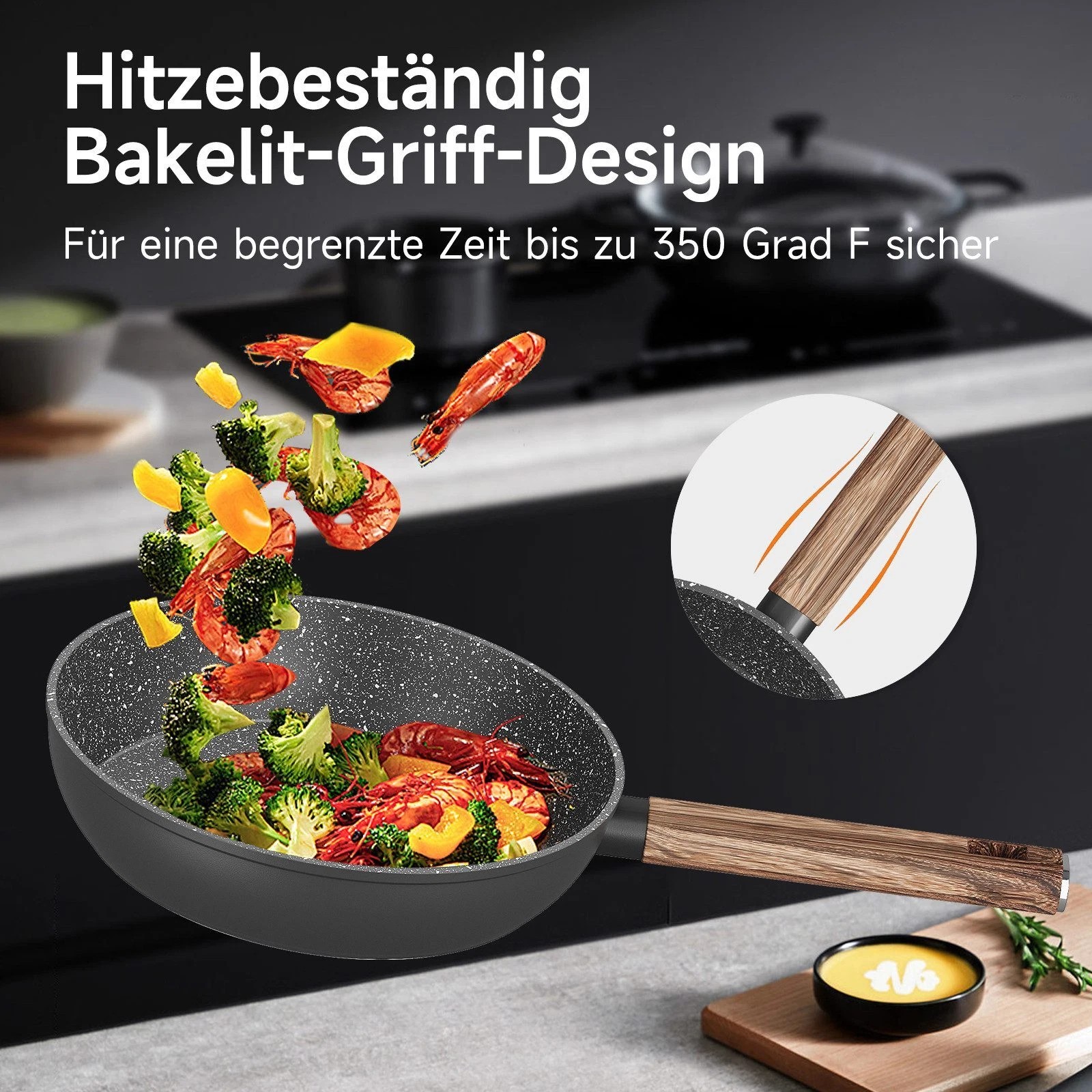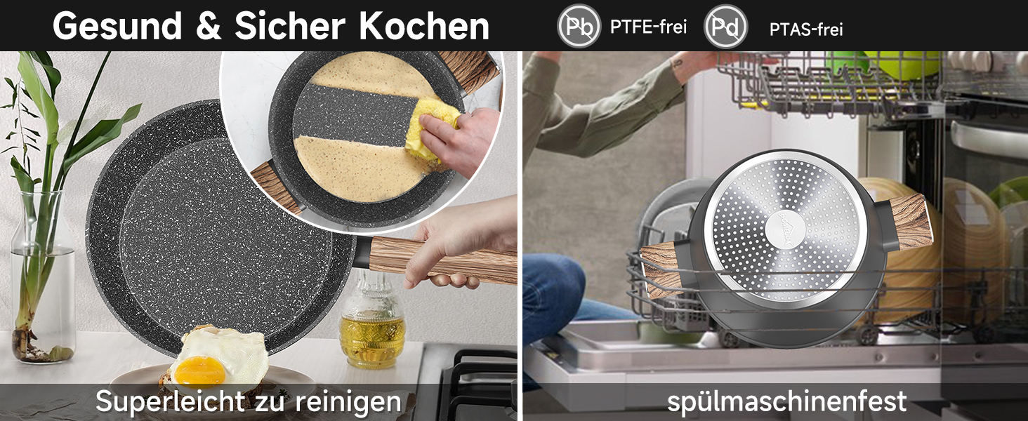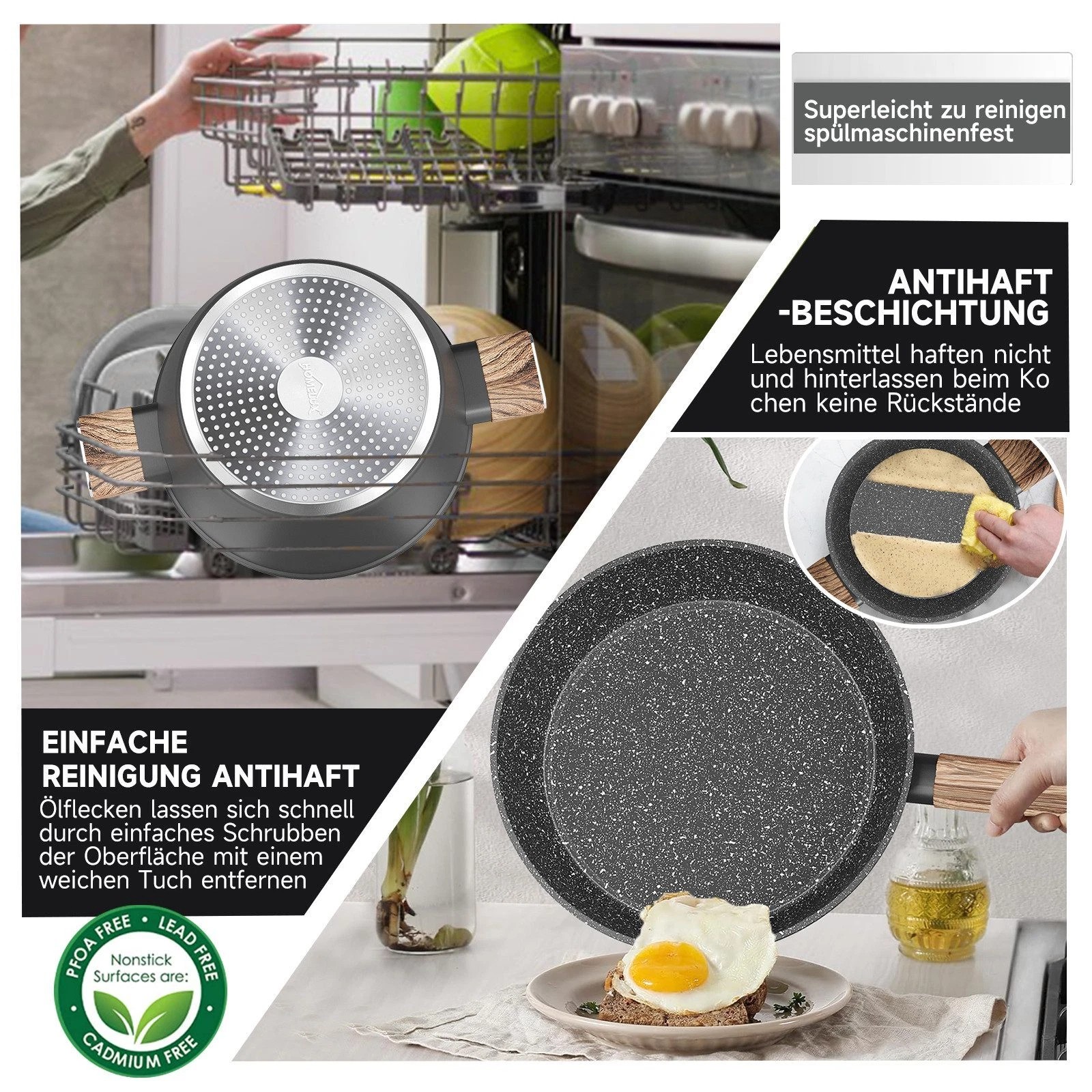The surface of the pot and pan set with lid is made of a granite non-stick coating, 100% contains no harmful substances such as PFOA, lead and cadmium, ideal for healthy cooking.