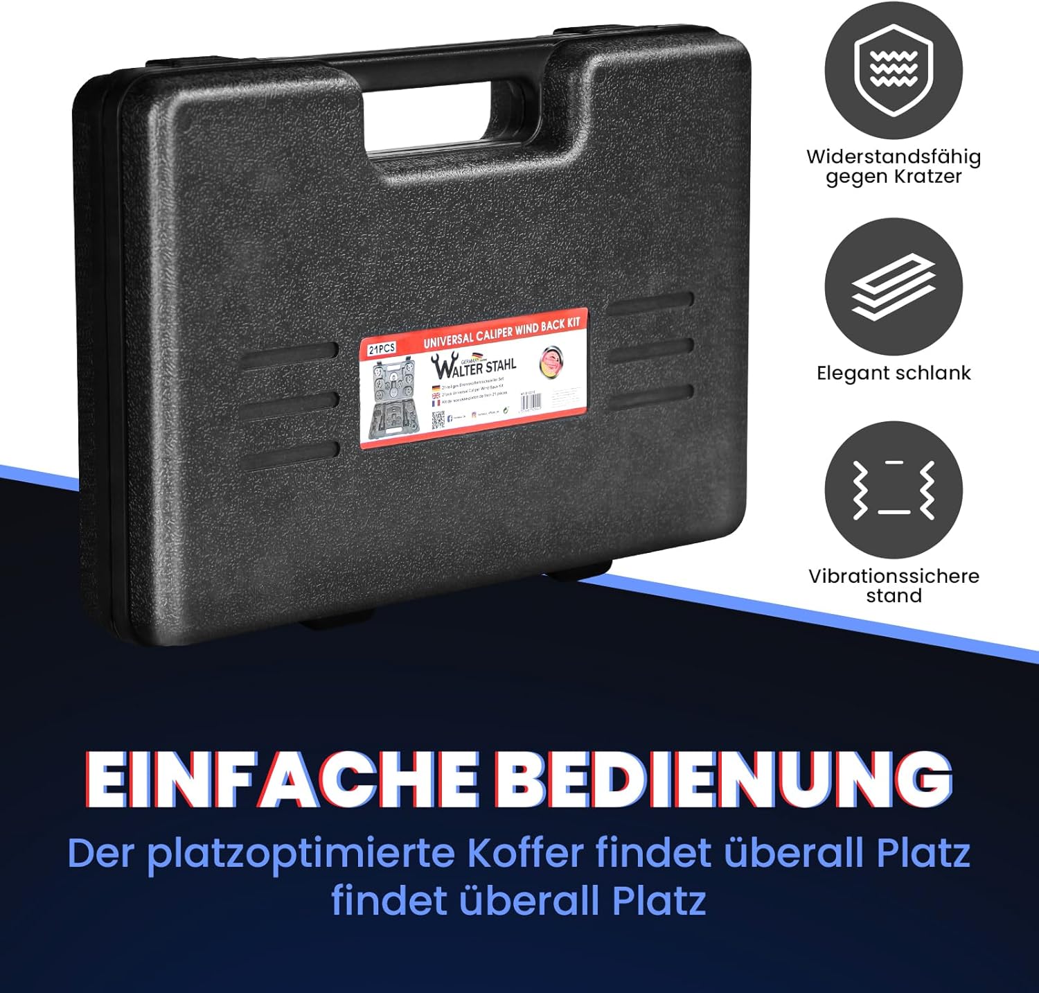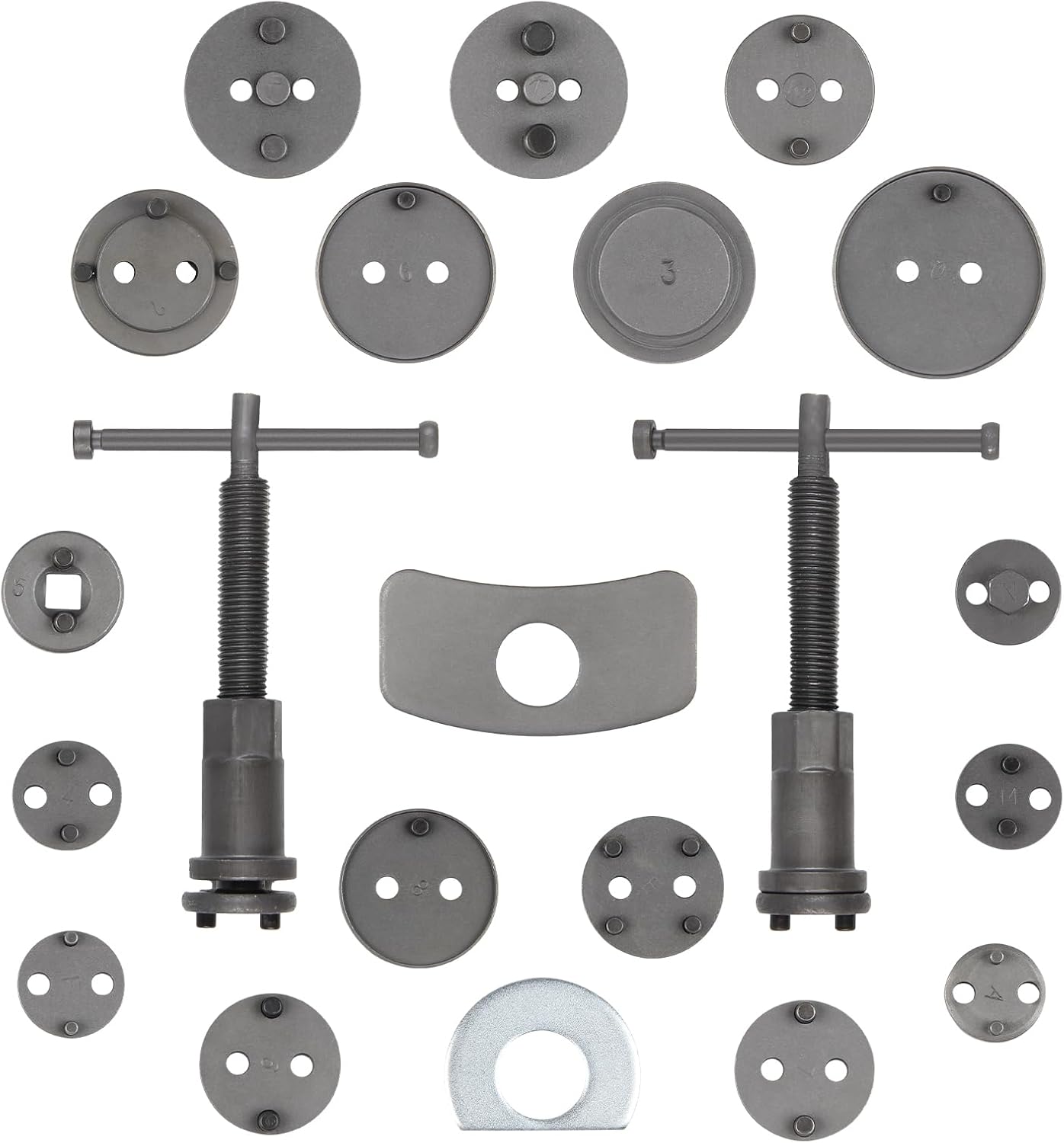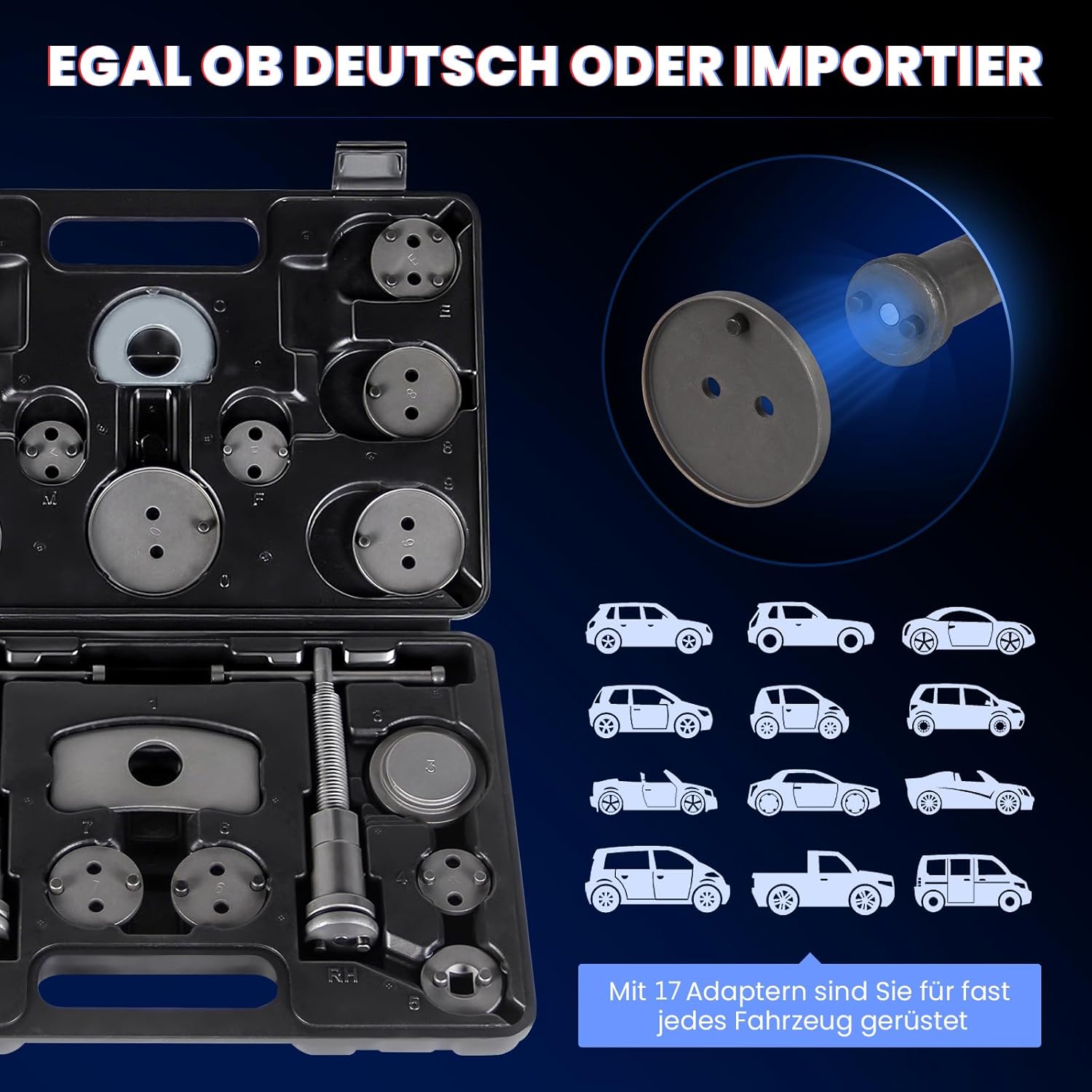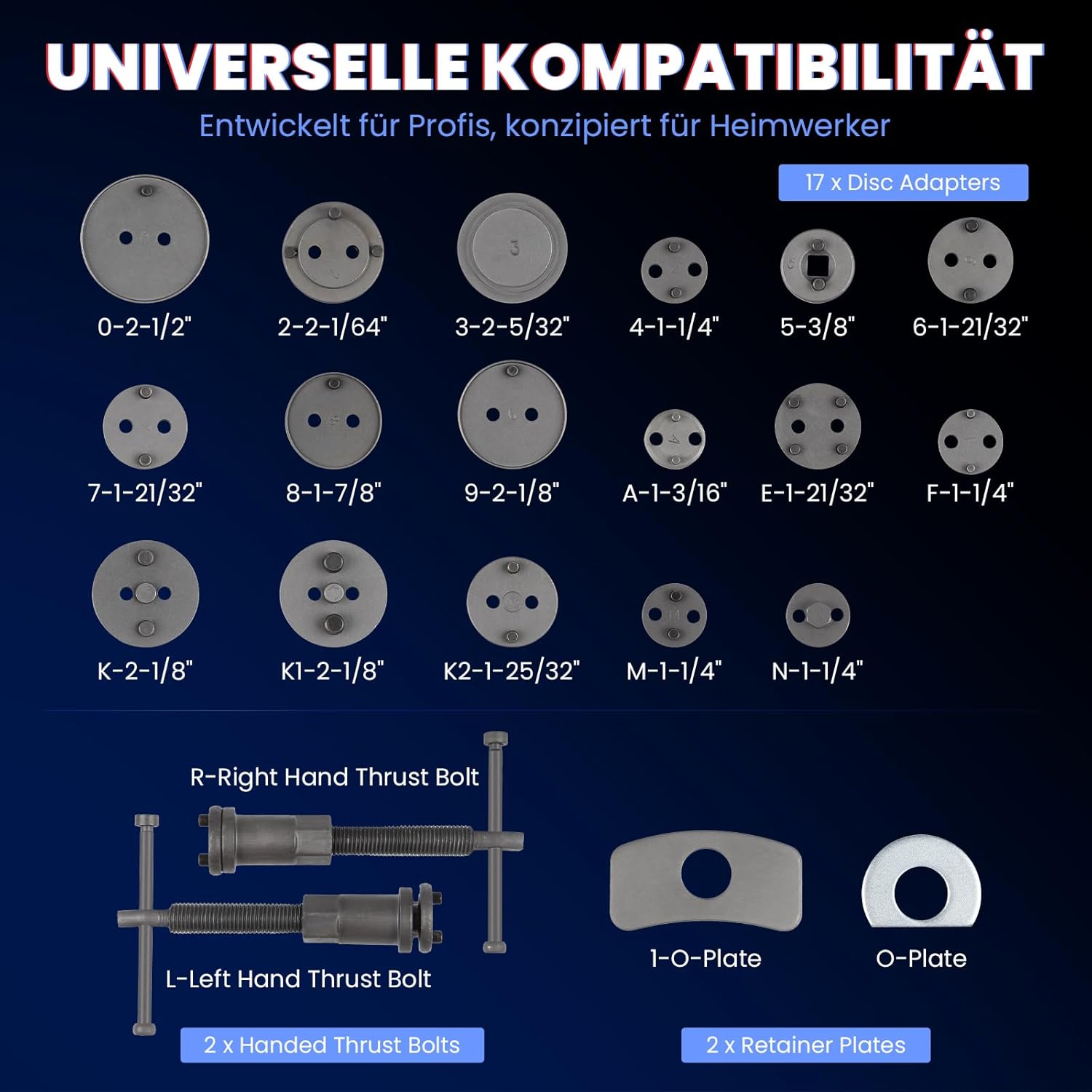 ideal for retracting pistons, adjusting the brake pump, and changing brake pads. The 21-piece set offers universal compatibility: It includes two retaining plates, pressure bolts (left/right), and 17 disc adapters.