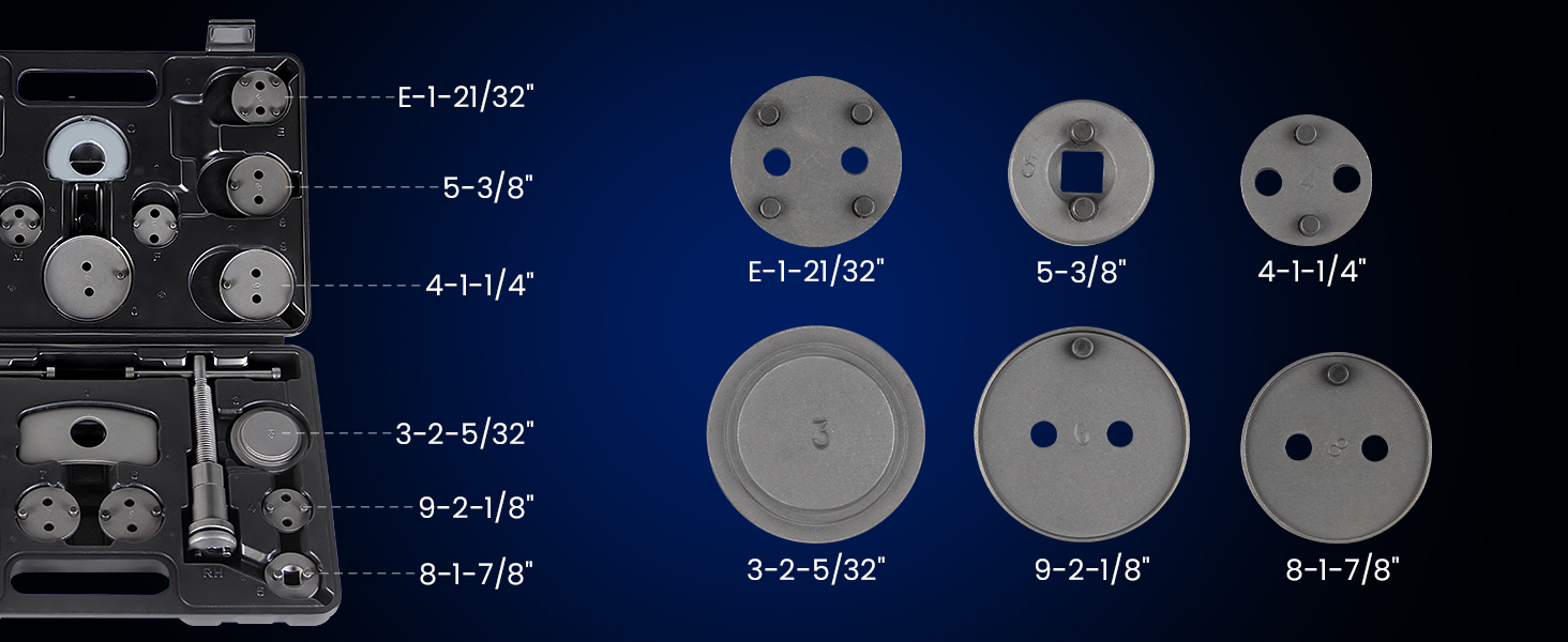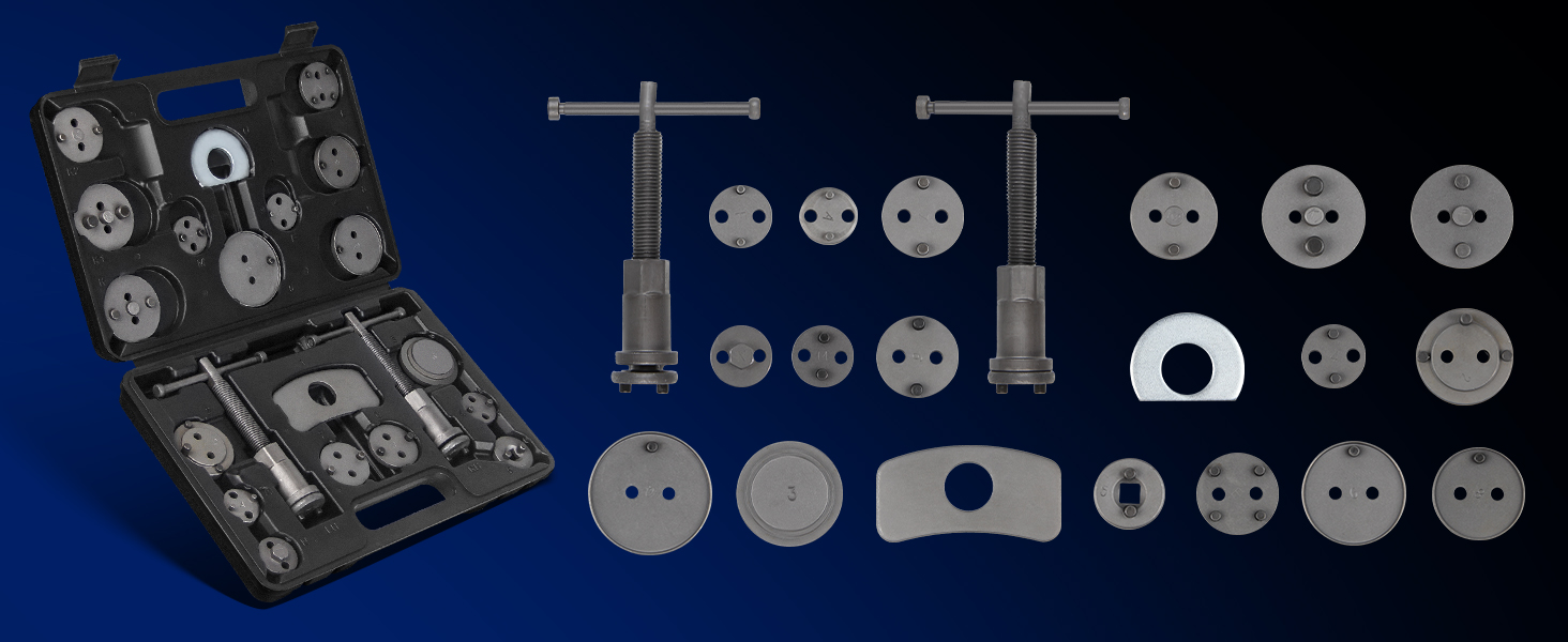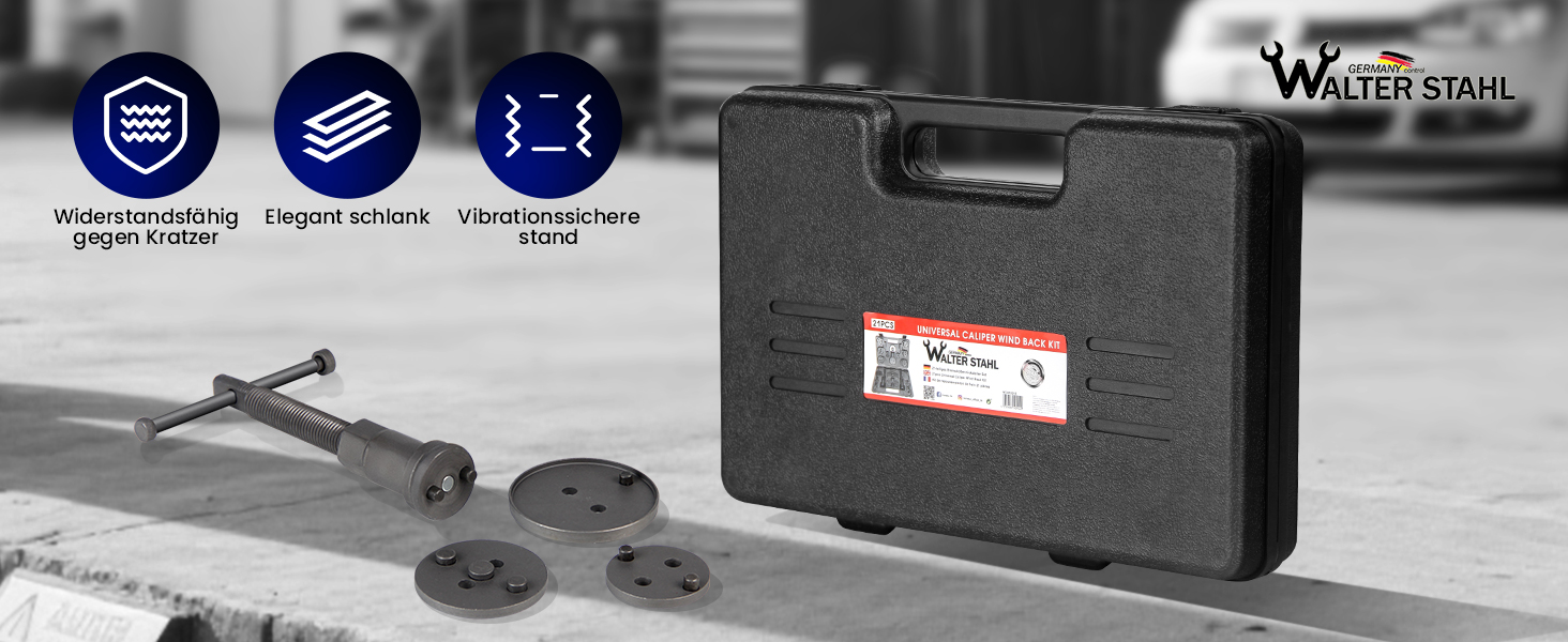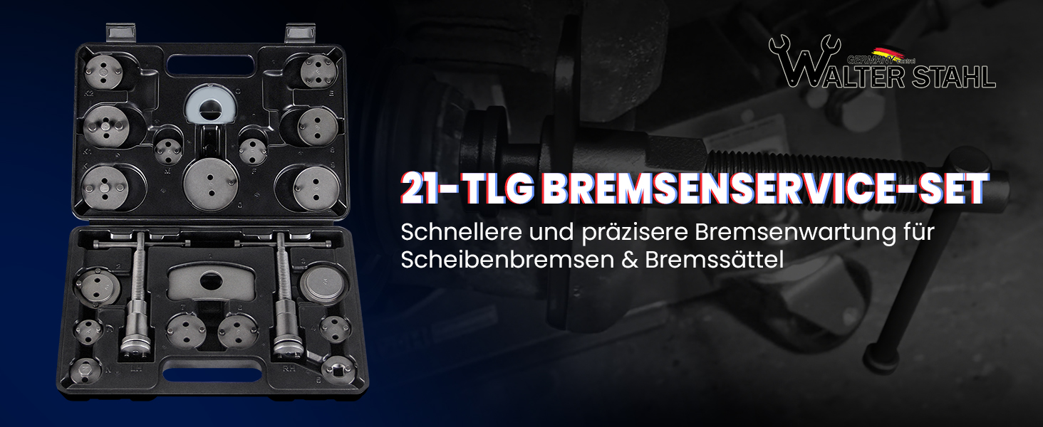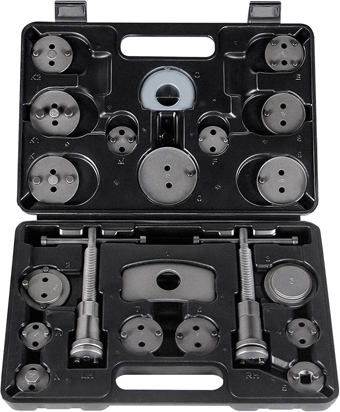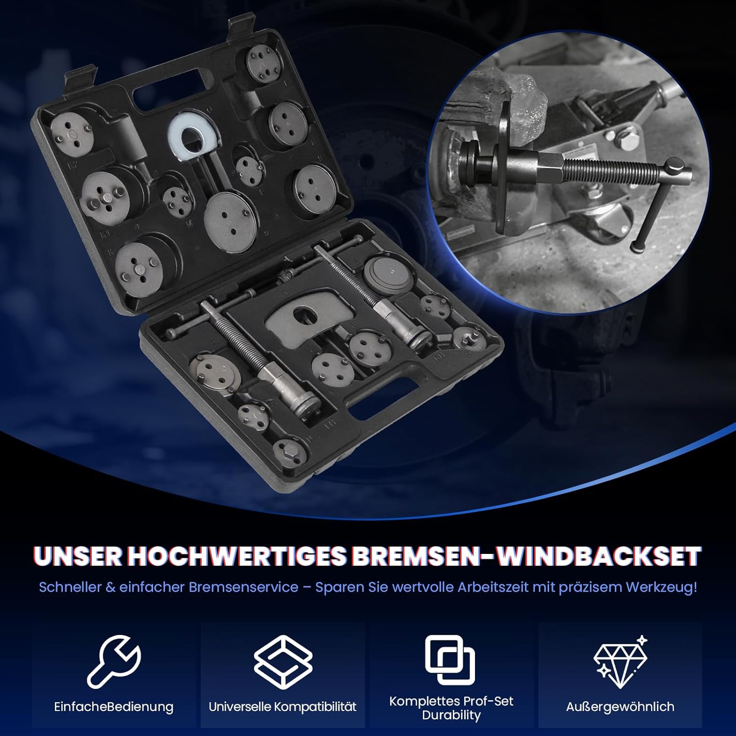 ideal for retracting pistons, adjusting the brake pump, and changing brake pads. The 21-piece set offers universal compatibility: It includes two retaining plates, pressure bolts (left/right), and 17 disc adapters.