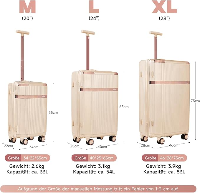 M size suitcase (H x W x D) - 55 x 34 x 24 cm, L size suitcase - 65 x 40 x 27 cm, XL size suitcase - 75 x 46 x 30 cm. (Please allow 1-2 cm error due to manual measurement.)