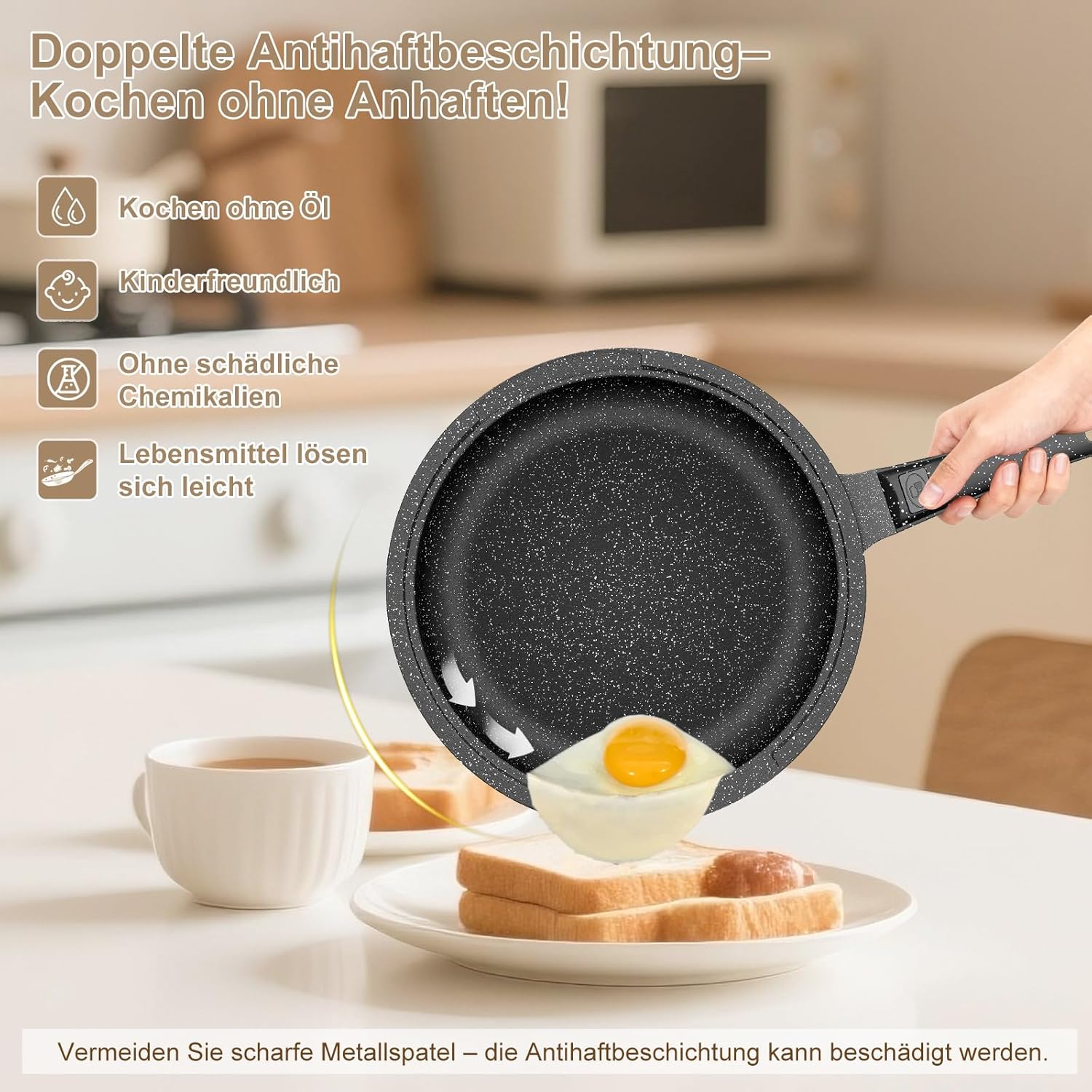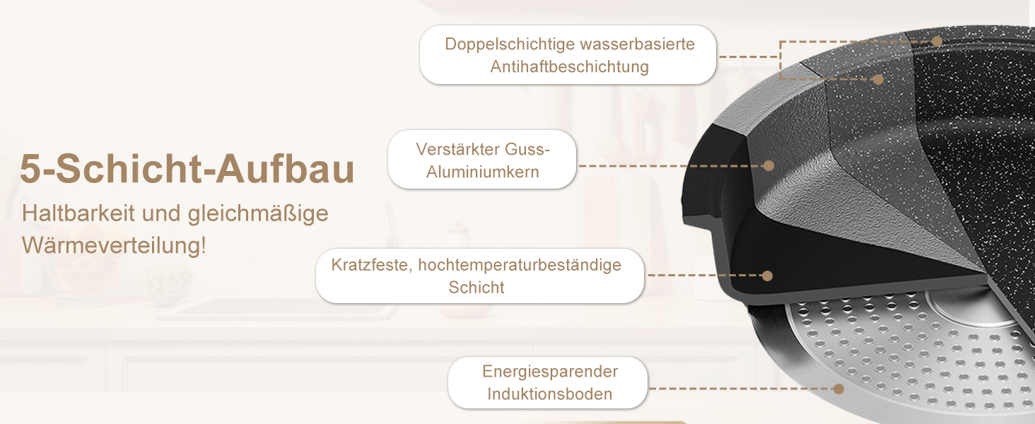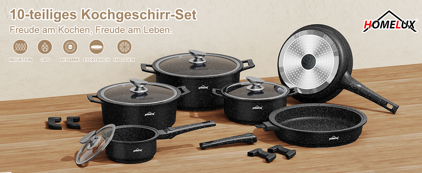 The cast aluminum cookware set features a double water-based non-stick coating, a heat-resistant and scratch-resistant protective layer and a powerful induction base. The optimized heat conduction structure ensures quick and even heat distribution and enables the best cooking results with minimal energy consumption.