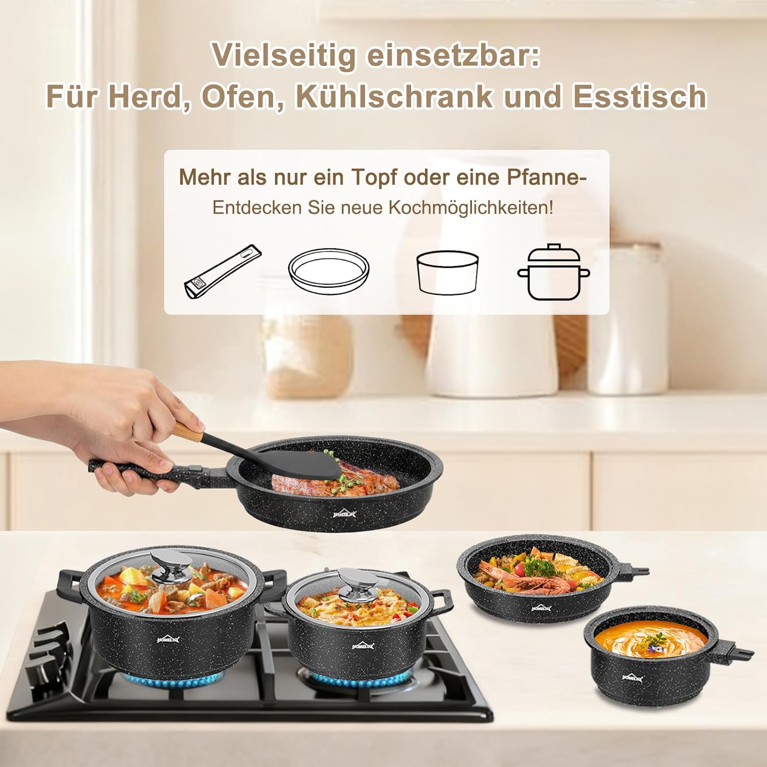 It contains 24cm frying pan, 28cm frying pan, 16cm/1.2L milk casserole with lid, 20/24/28 cm cooking pots with lid, 2 pairs of silicone protective covers and 3 removable pot handles for safe stacking. Ideal for frying, cooking, steaming and baking in one space-saving set.