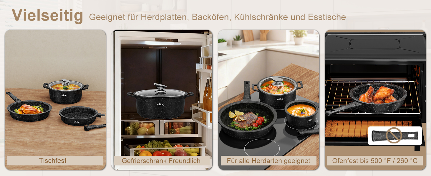 compatible with gas, induction, halogen, electric and ceramic stoves. Without silicone handles or with removable handles that are oven safe up to 260°C (500°F). Use in different scenarios, more versatile.