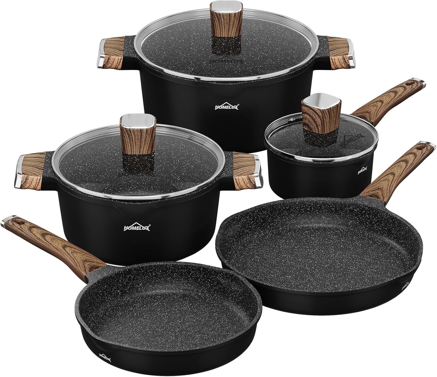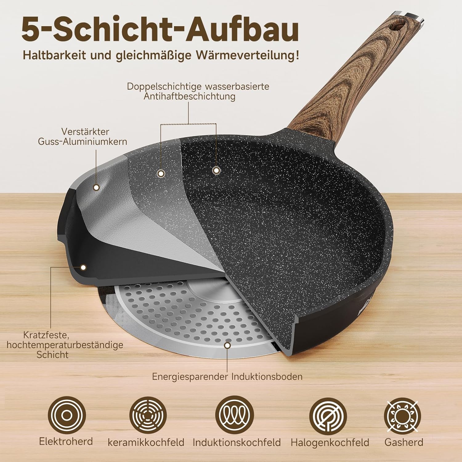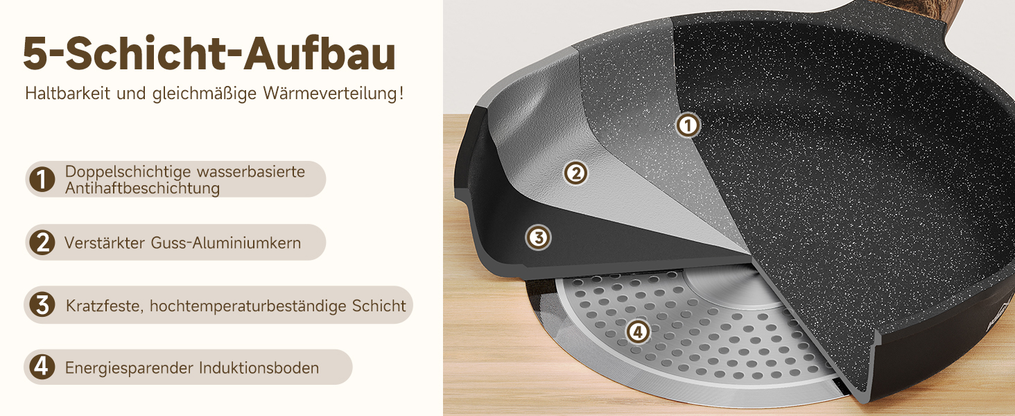 This cast aluminum cookware set features a double water-based non-stick coating, a heat-resistant and scratch-resistant protective layer, and a high-performance induction base. The optimized heat conduction design ensures rapid and even heat distribution, enabling optimal cooking results with minimal energy consumption.
