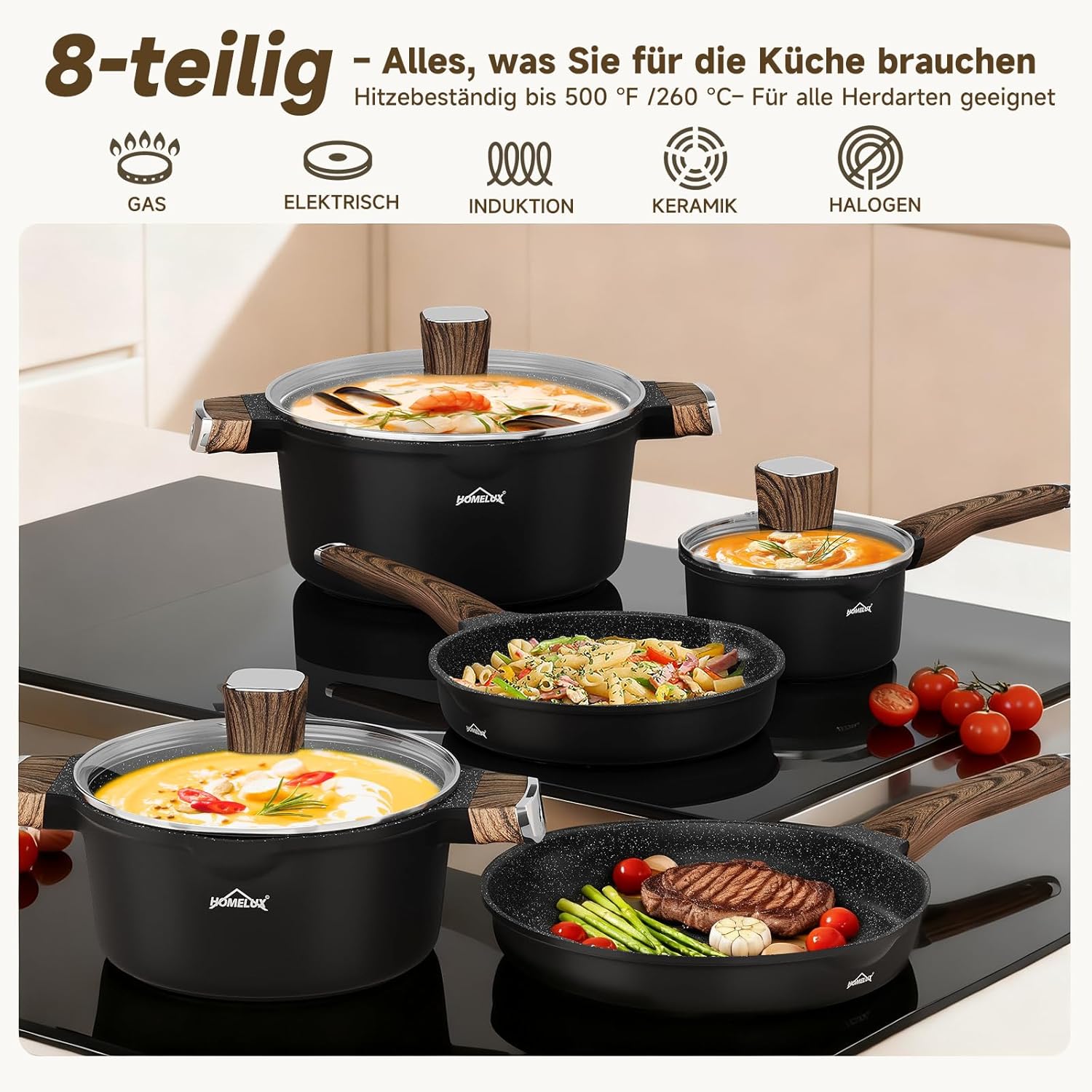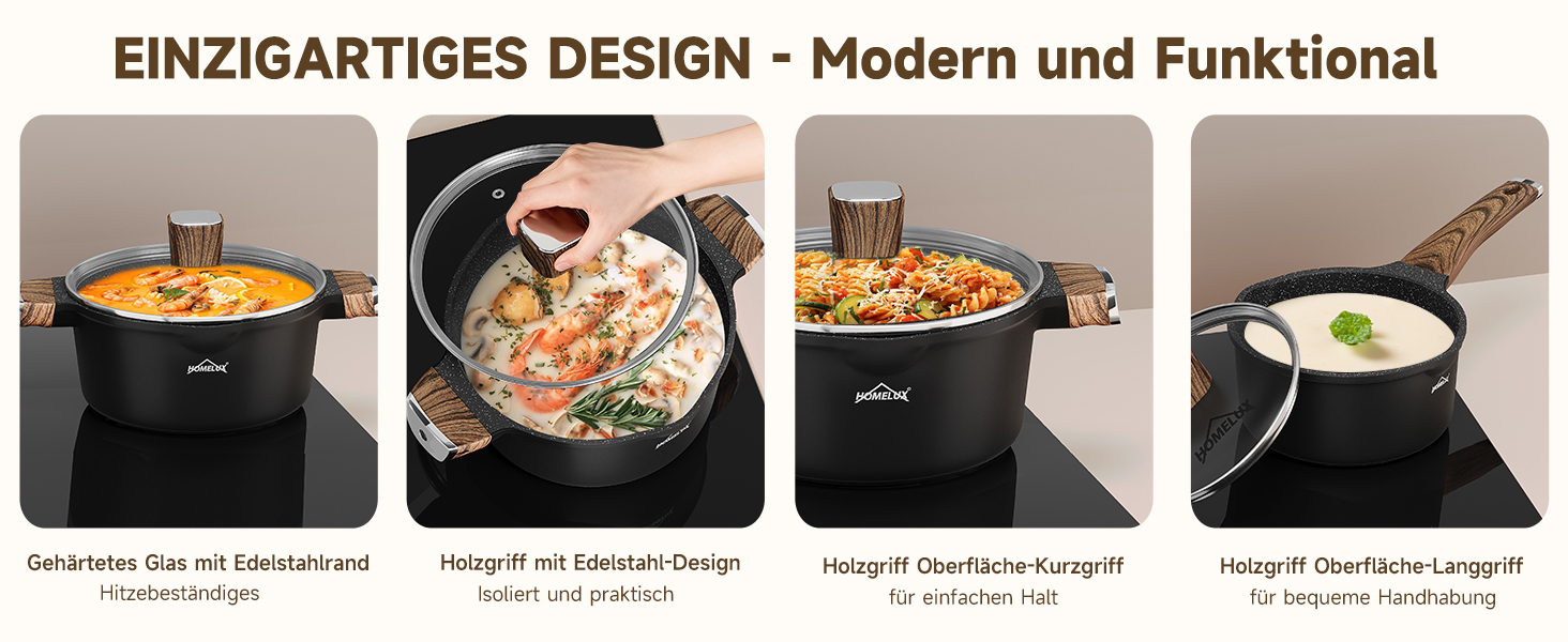 Our saucepans and milk jug come with heat-resistant glass lids and ergonomic Bakelite handles – safe, comfortable, and easy to use. The elegant wood grain brings a touch of nature and style to your kitchen. Because kitchen utensils don't have to be boring.