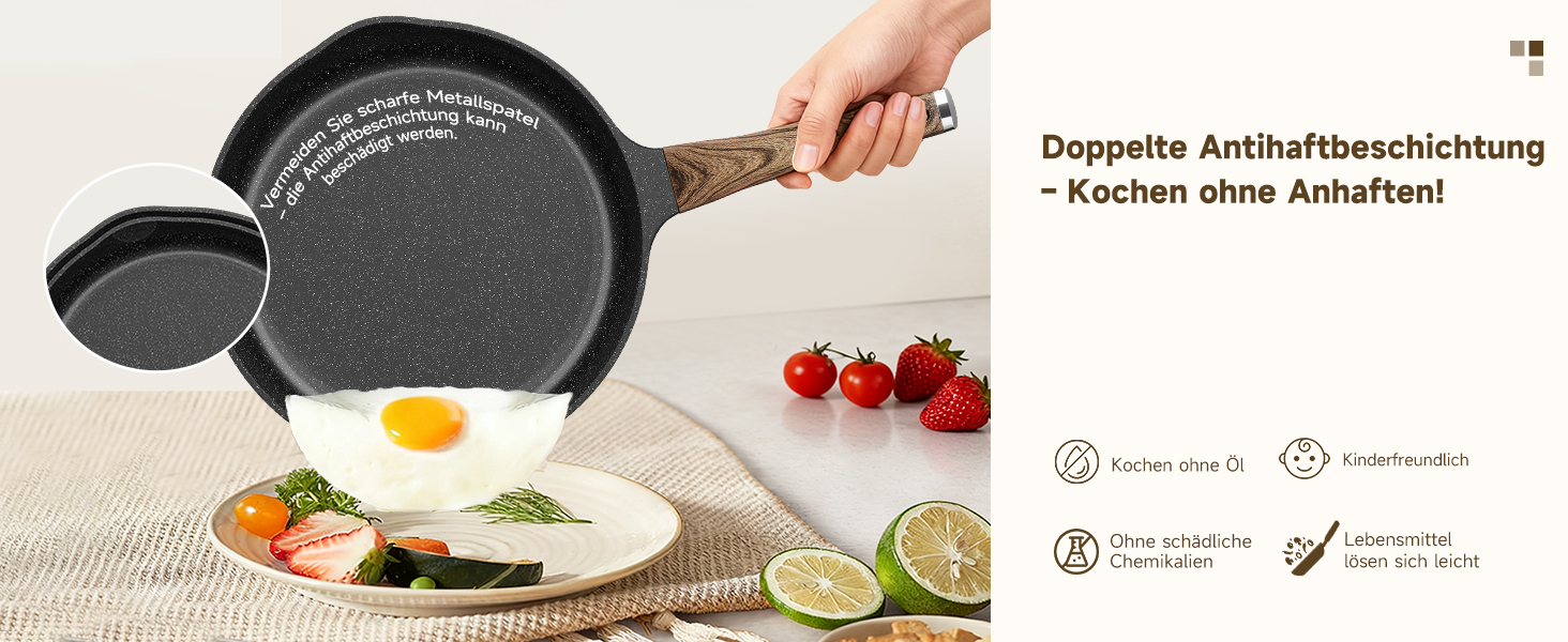 The two-layer non-stick design allows for oil-free cooking without sticking. Free from harmful chemicals. Easy to clean – hand washing with mild detergent is recommended; dishwasher safe if needed. Avoid using sharp metal utensils to prevent damage to the coating.