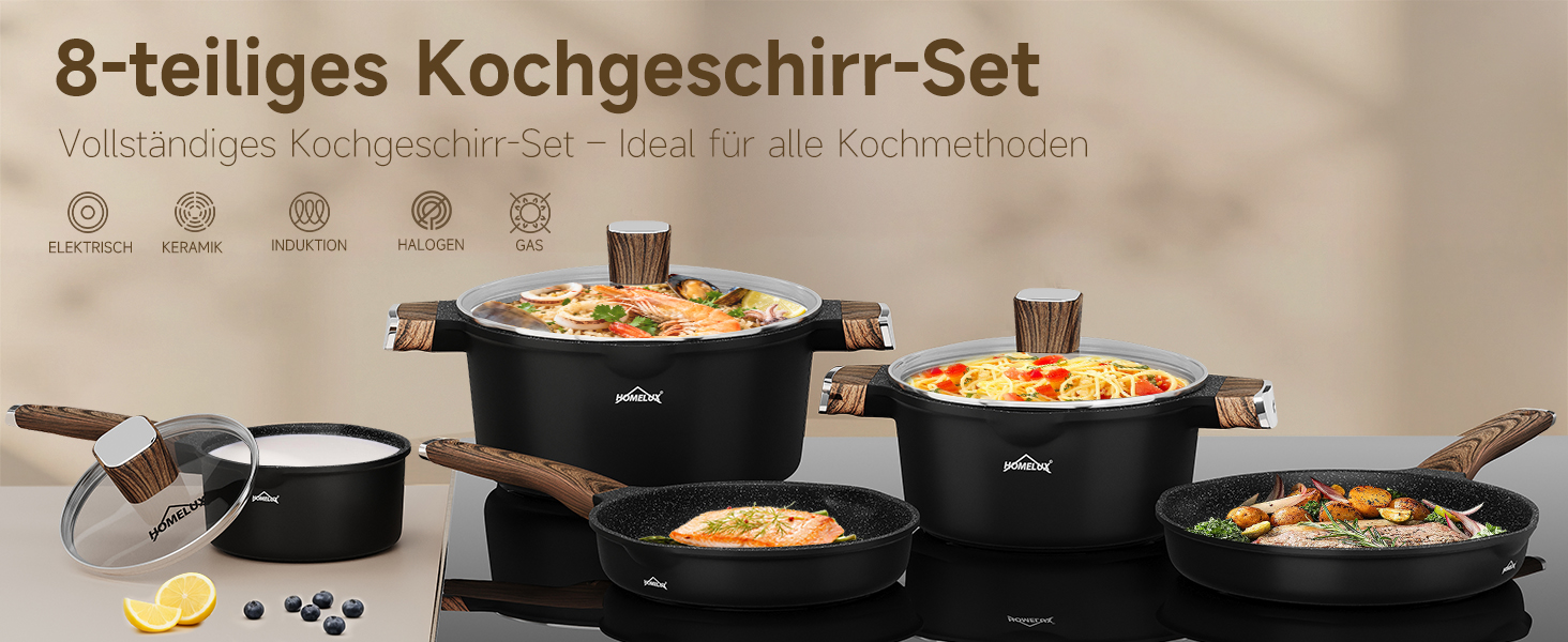 Milk saucepan 16 x 8 cm/1.3 l + glass lid, saucepan 24 x 11.5 cm/4 l + glass lid, saucepan 28 x 13.5 cm/6.5 l + glass lid, frying pan 24 x 5.2 cm, frying pan 28 x 6 cm. Ideal for everyday cooking, frying and braising.