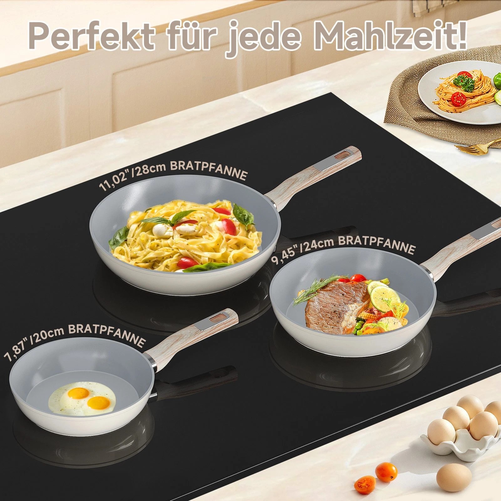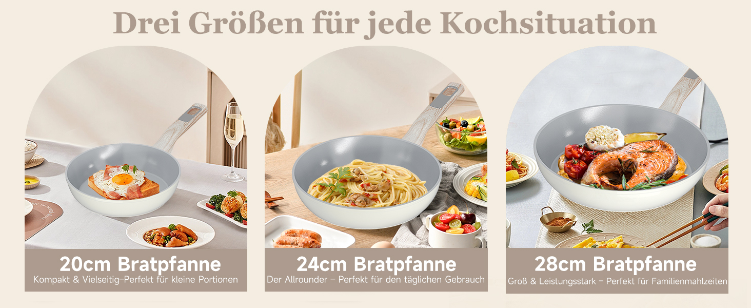 Enthält drei Pfannen (Ø 20 cm, 24 cm, 28 cm) für vielseitige Einsatzmöglichkeiten. Ob ein schnelles Frühstück, eine ausgewogene Mahlzeit oder ein ausgiebiges Familienessen – für jede Gelegenheit bestens ausgestattet.