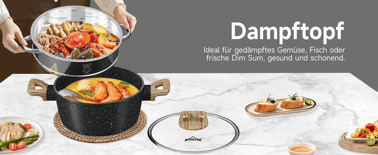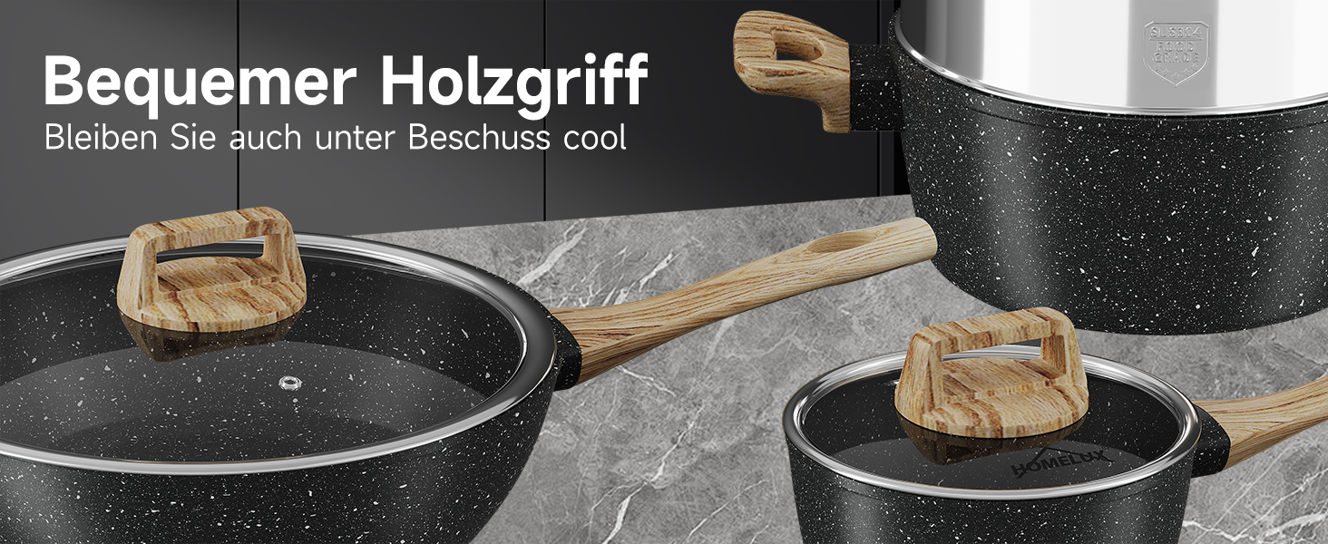 Unsere Töpfe und Pfannen sind mit PFOS/PFOA-freiem Antihaftmaterial versehen und lassen sich sicher und gesund kochen. Durch die Antihaftbeschichtungstechnologie wird außerdem weniger Öl benötigt und es entsteht weniger Rauch, was zu gesünderen und köstlicheren Mahlzeiten führt. Geeignet für alle Herdarten: Dank der stark magnetisch leitenden Edelstahlbasis ist unser Kochgeschirr-Set mit allen Herdarten kompatibel, einschließlich Induktion, Gas, Elektroherd usw.