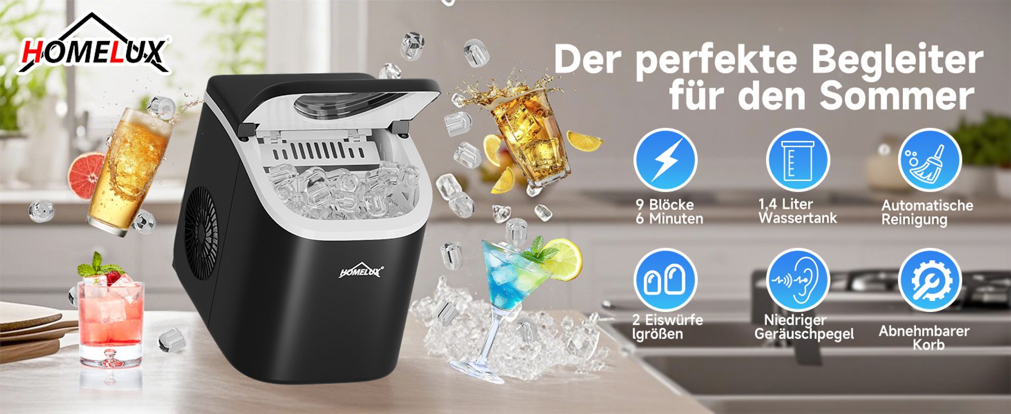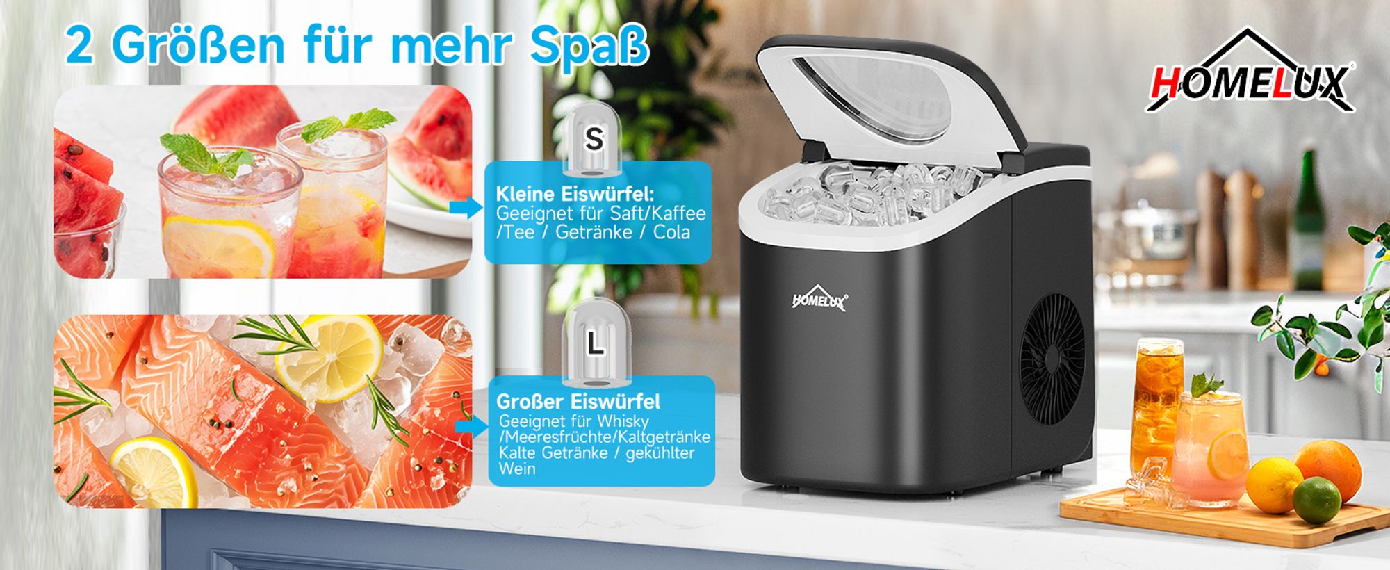 Die tragbare Eiswürfelmaschine von Homelux präsentiert sich in einem vielseitigen und kompakten Design mit den Maßen 26(T)*22(B)*28,5(H) cm. Der stabile Griff ermöglicht mühelosen Transport mit nur einer Hand. Ideal für verschiedene Anlässe, wie Küchengebrauch, zu Hause, beim Campen, auf Wohnmobilreisen und bei Partys, bietet dieser Eiswürfelbereiter jederzeit und überall Eisgenuss.