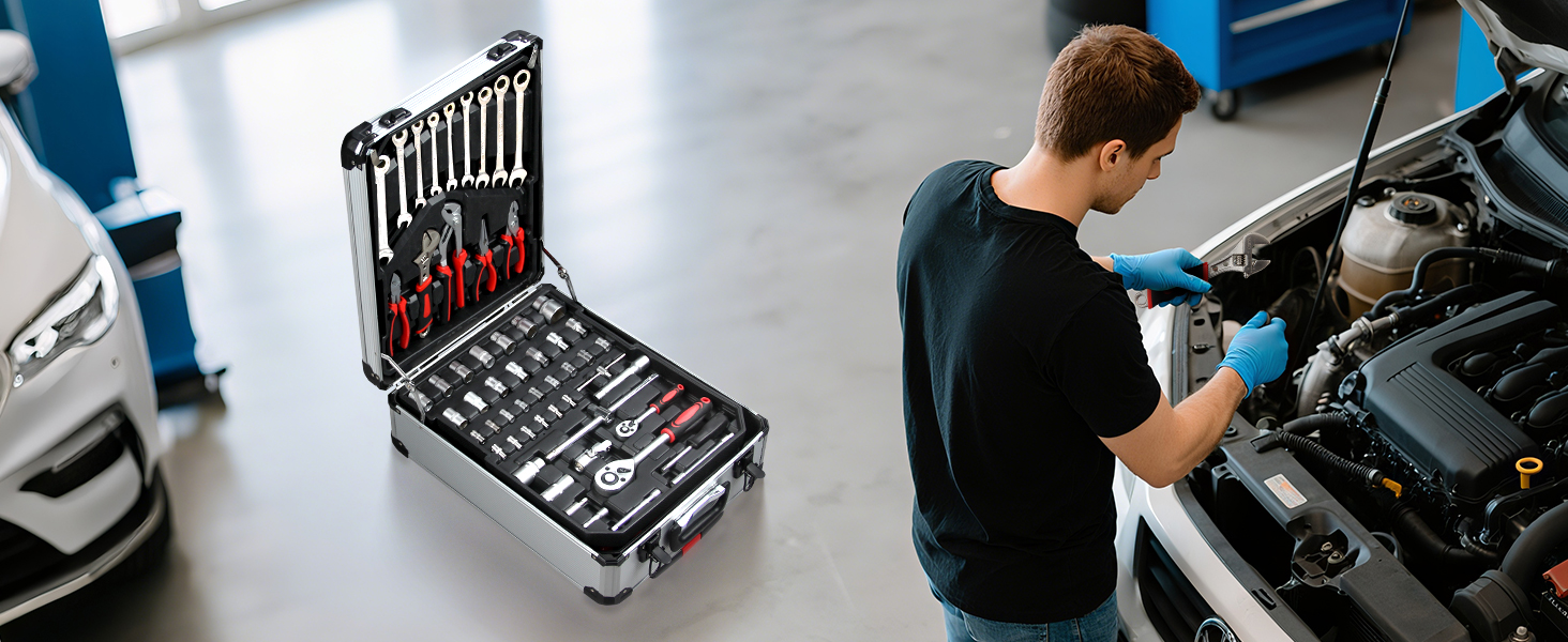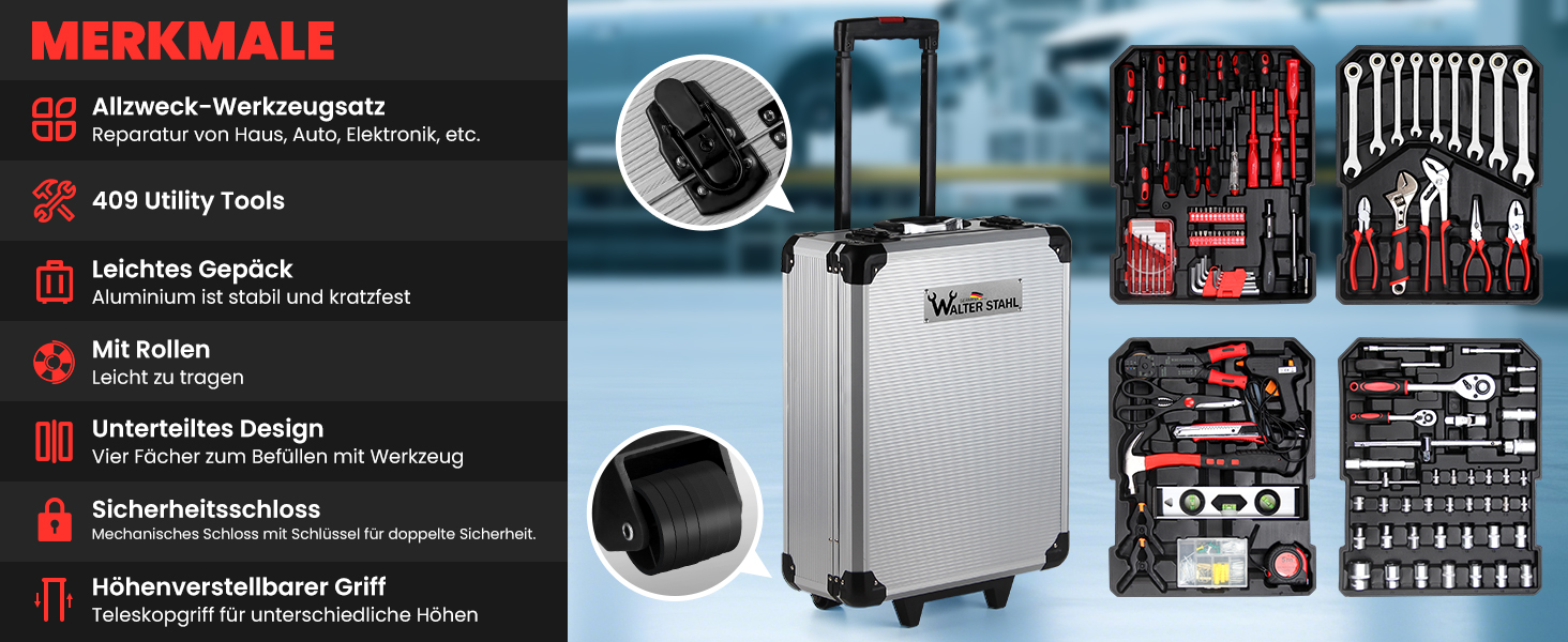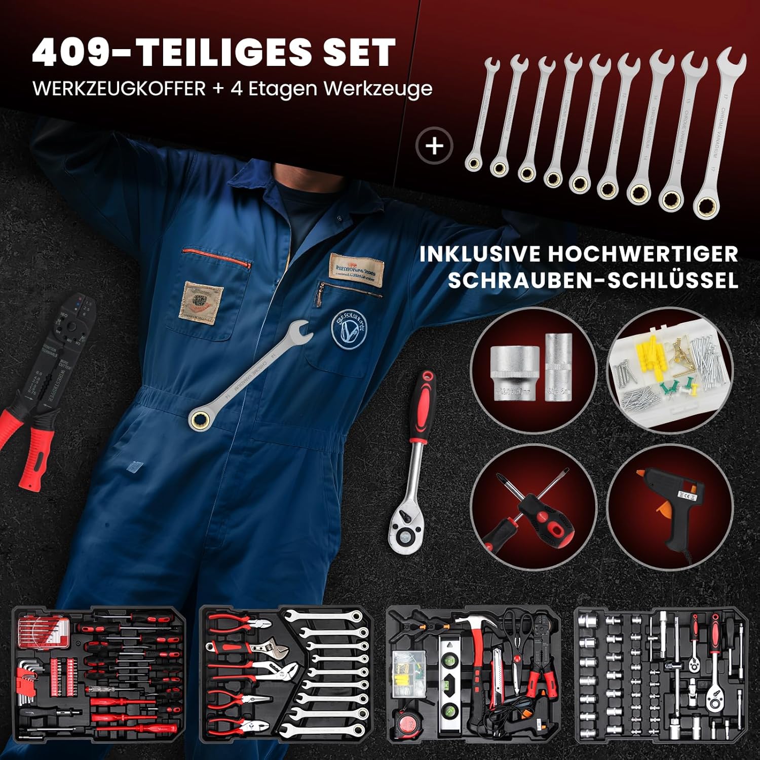 Unser Aluminium Werkzeugtrolley ist mit insgesamt 409 hochwertigen Werkzeugteilen ausgestattet, darunter Ratschen Schraubendreher, Ringschlüssel, und vieles mehr! Ob Du Profi Handwerker oder Heimwerker bist, dieses Set bietet Dir eine breite Palette an Werkzeugen für alle Aufgaben.