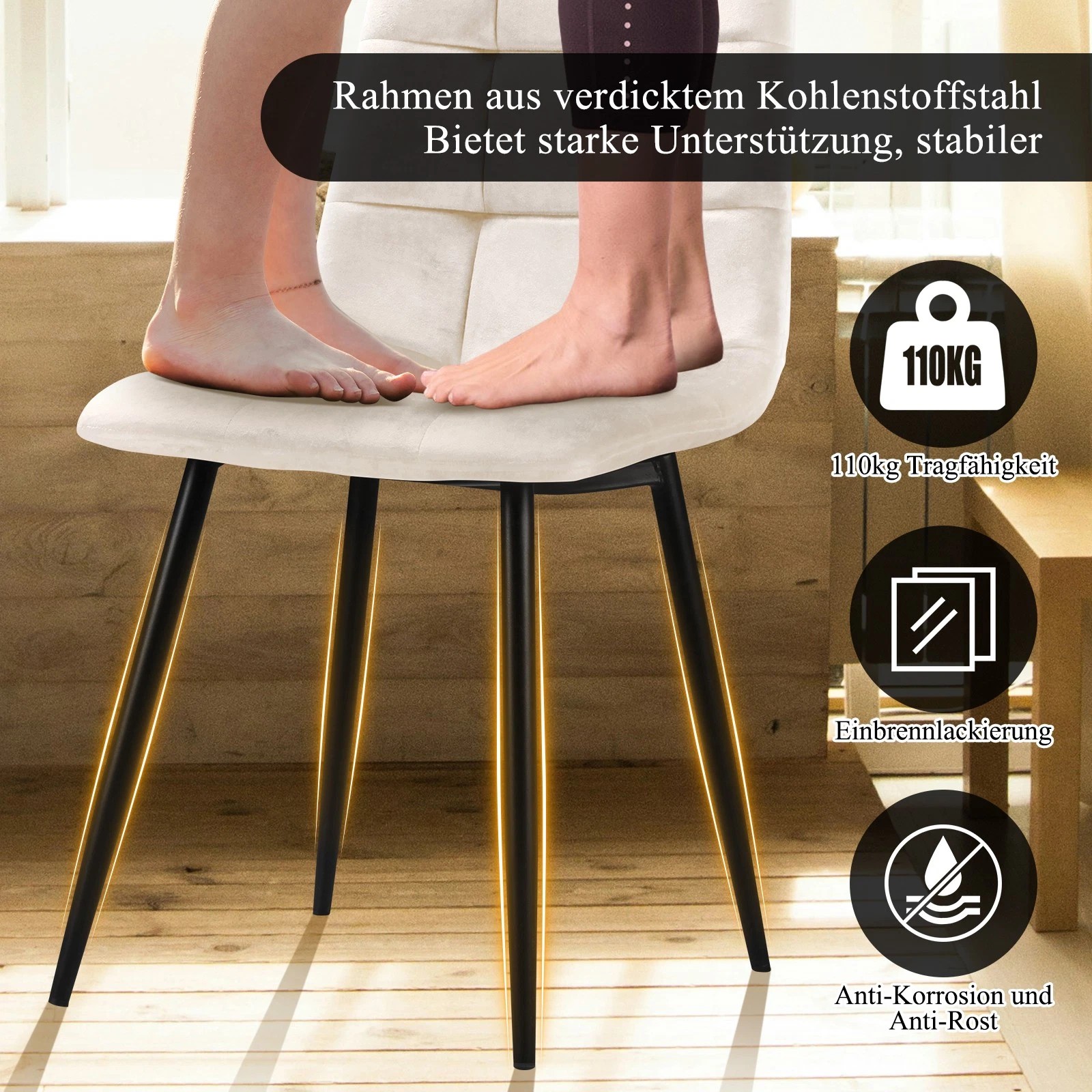 Die Beine dieses Esszimmerstuhls sind aus hochwertigem Metall gefertigt. Die gekreuzten Metallbeine und das dicke Rahmen machen den Küchenstuhl sehr stabil und langlebig. Der Stuhl hat eine statische Tragkraft von 110 kg. Die Unterseite der Stuhlbeine ist mit dicken Anti-Kratz-Füßen ausgestattet. Die abgerundeten Ecken des Stuhls haben ein glattes Design, um versehentliche Kollisionen während des Gebrauchs zu verhindern.
