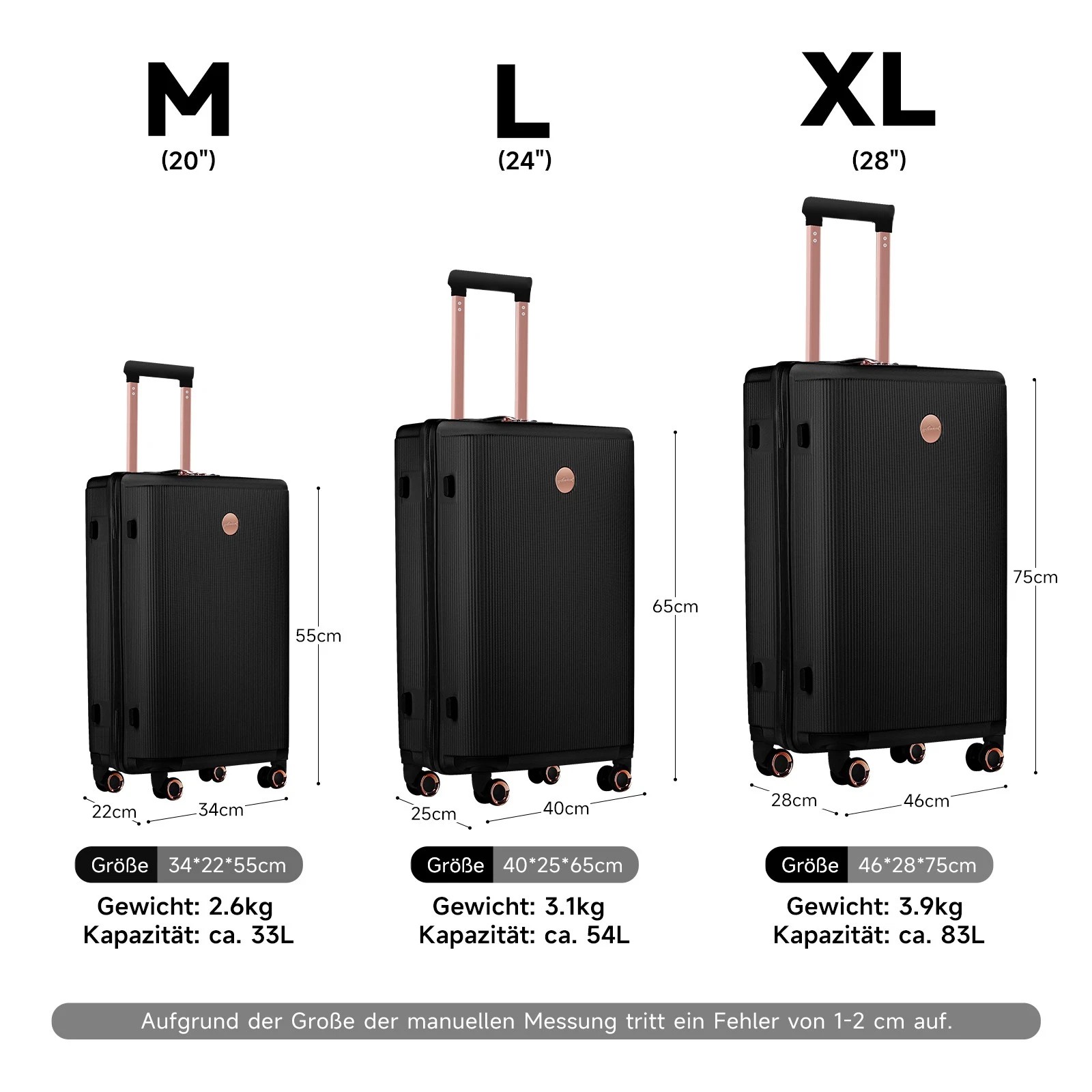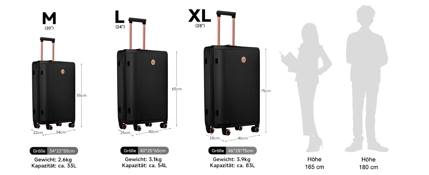 (Griff eingefahren, inkl. Rollen und Griffe): M größe Koffer (H x B xT) - 55x34x24cm, L größe Koffer -65x40x27cm, XL größe Koffer -75x46x30cm. (Aufgrund der Größe der manuellen Messung tritt ein Fehler von 1-2 cm auf.)