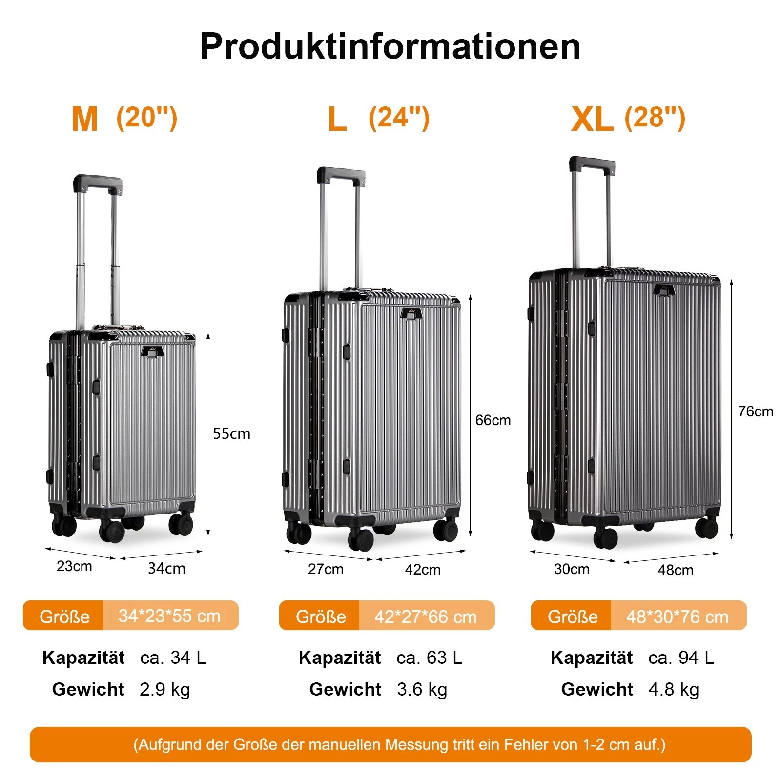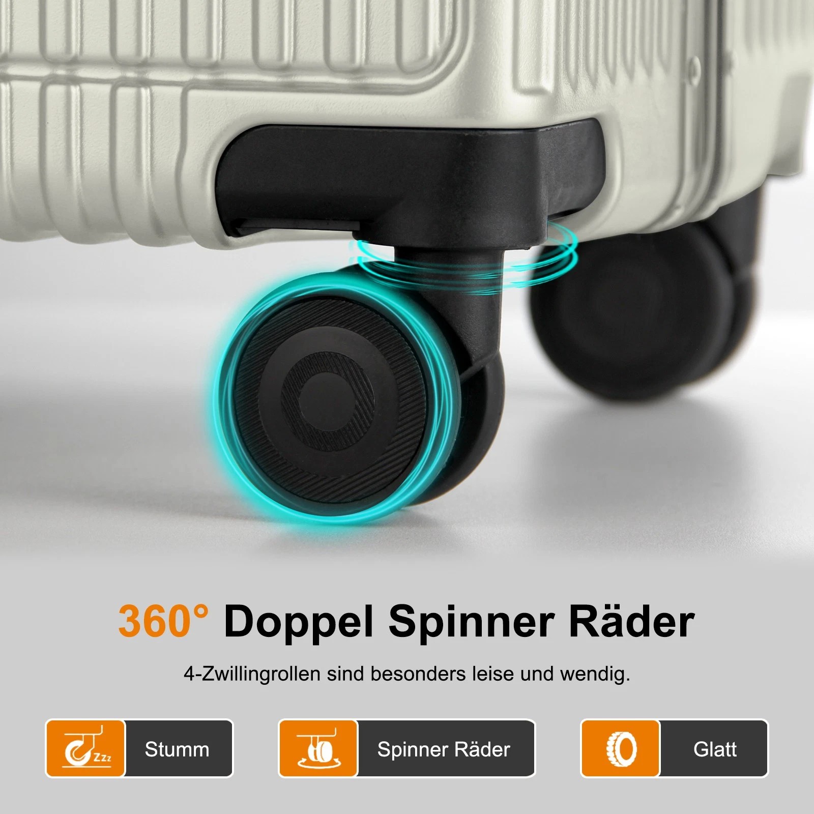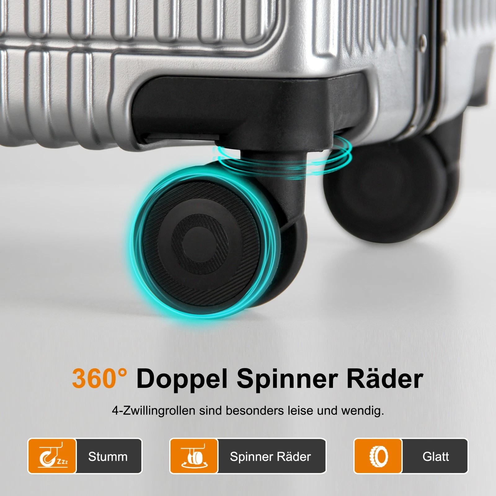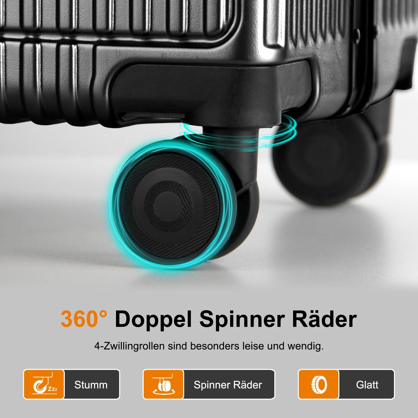 Dank der leichtgängigen und geräuscharmen 360-Grad-Drehrollen lässt sich der Koffer mühelos in jede Richtung bewegen. Der verstellbare 3-stufige Teleskopgriff aus Aluminium und die Griffe an beiden Seiten des Koffers ermöglichen es Ihnen, ihn auf die bequemste Weise zu tragen, entweder vertikal oder horizontal.