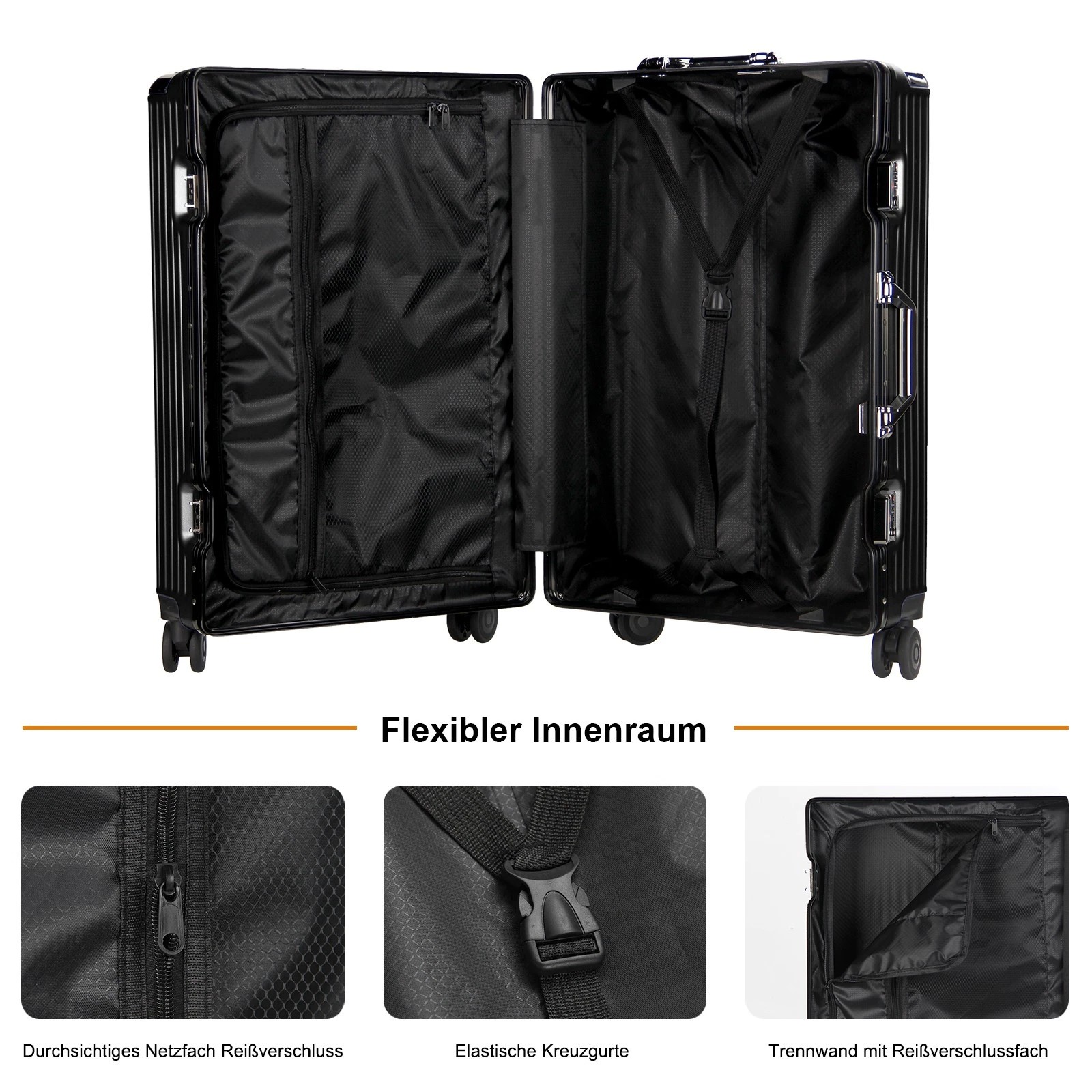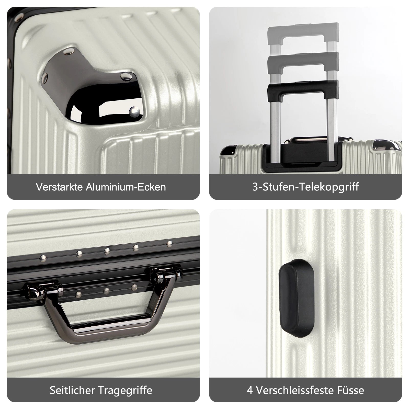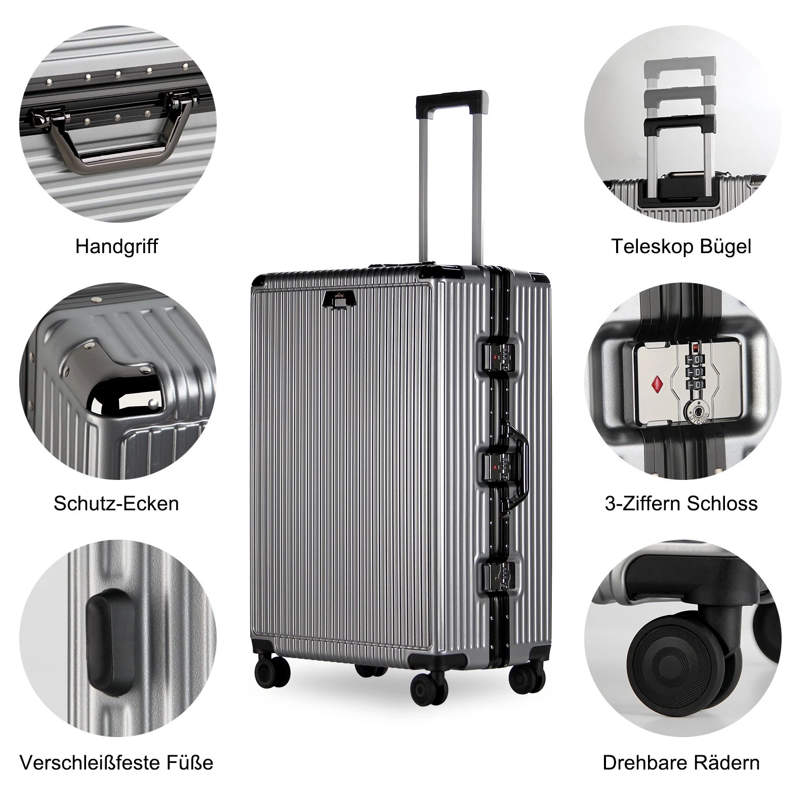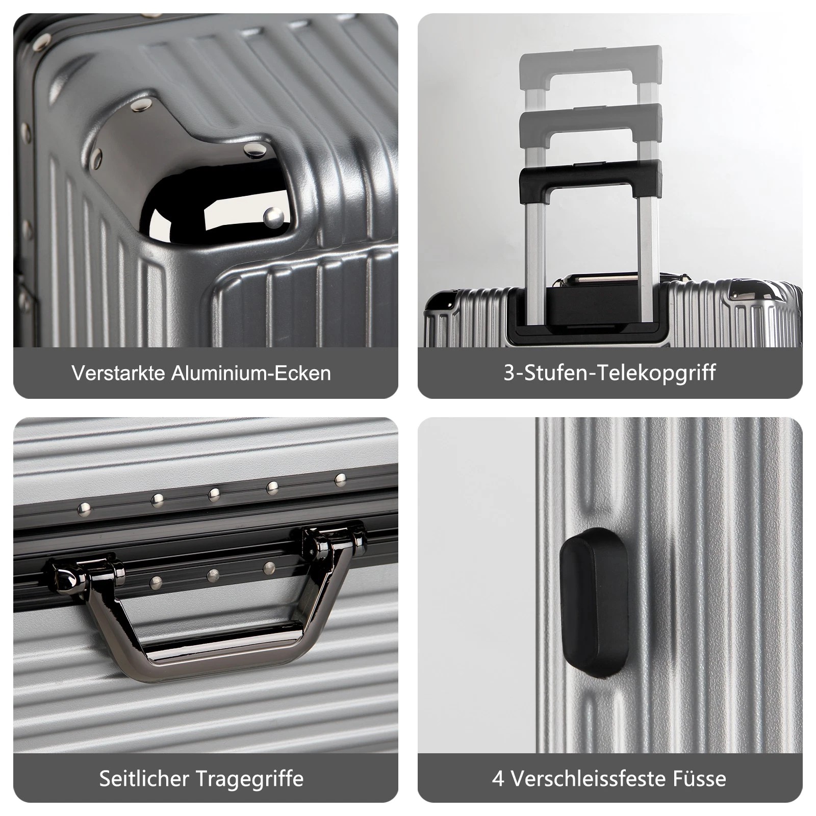 Jeder Koffer ist mit vier robusten Aluminium-Eckrahmen ausgestattet, die Ihren Habseligkeiten zusätzlichen Schutz bieten. Diese Eckprotektoren absorbieren Stöße und sorgen dafür, dass Ihr Gepäck während des Transports unversehrt bleibt.