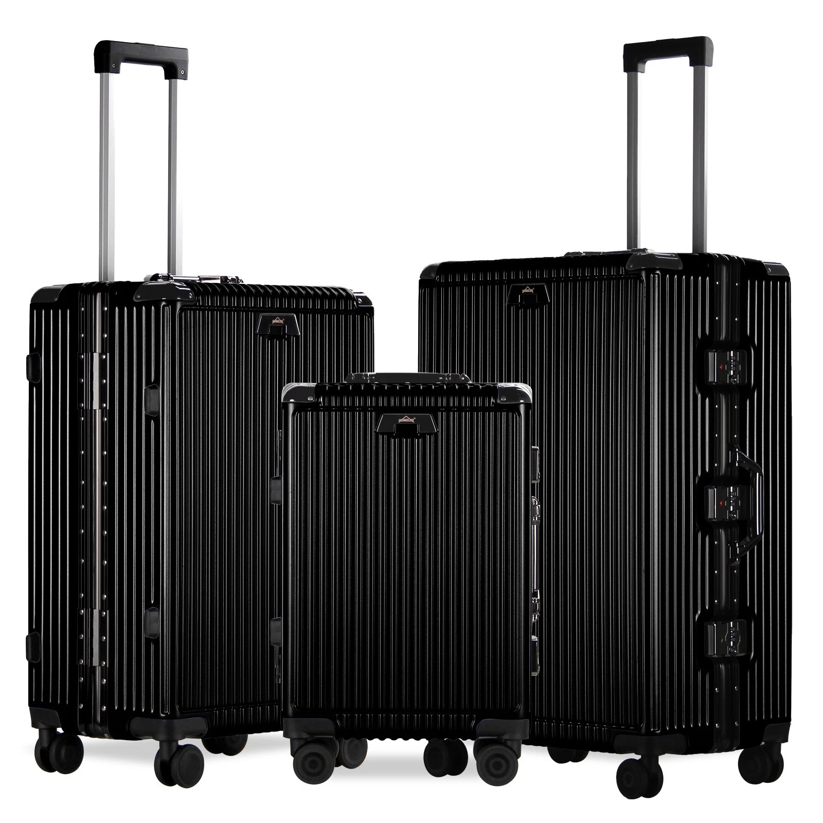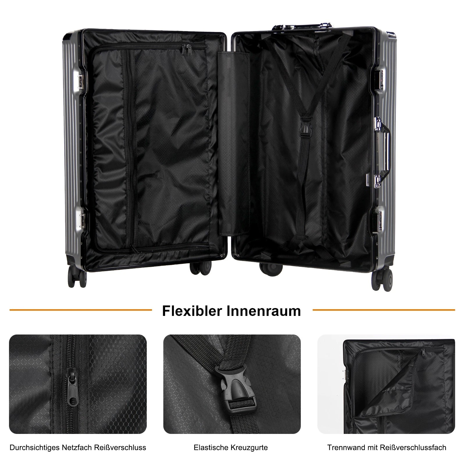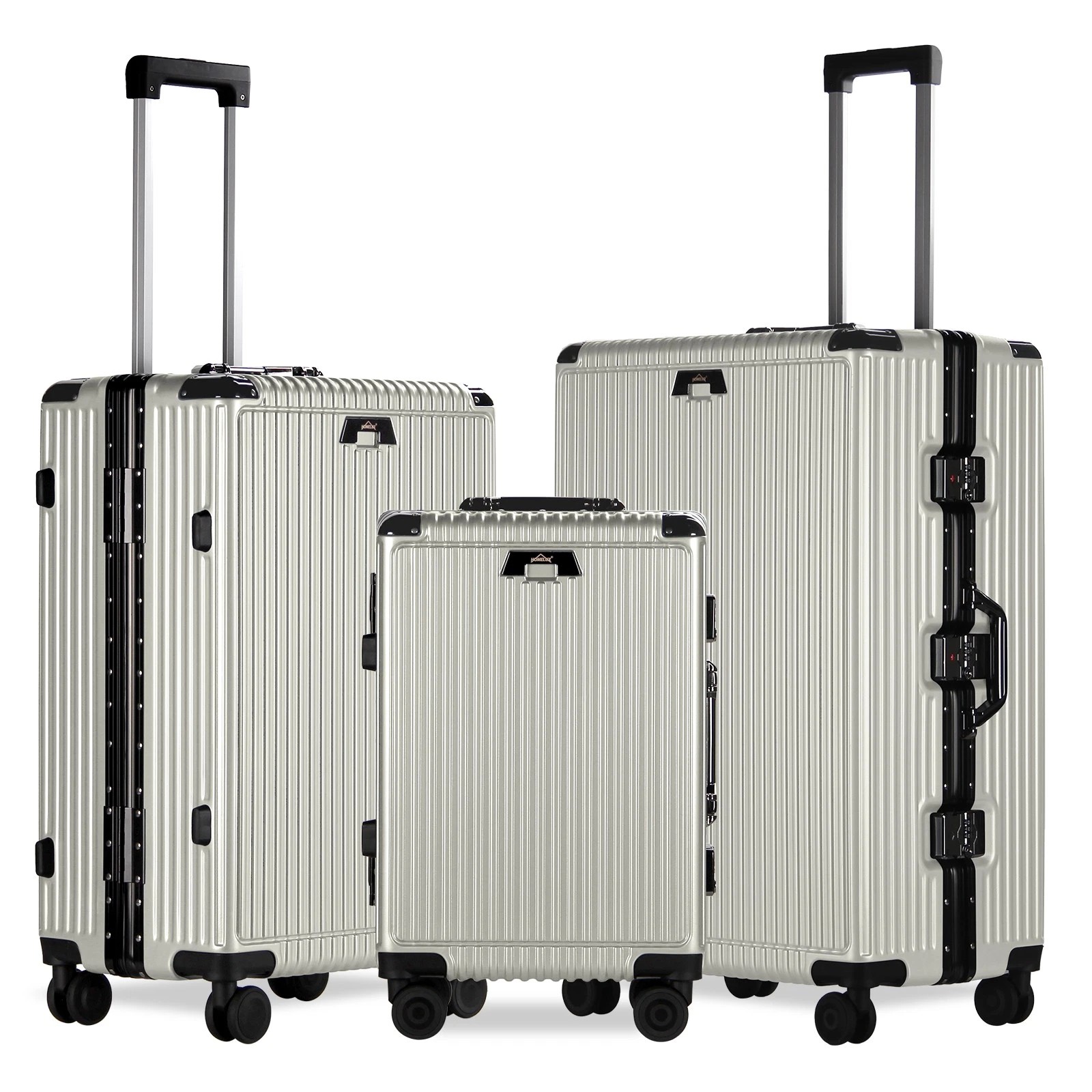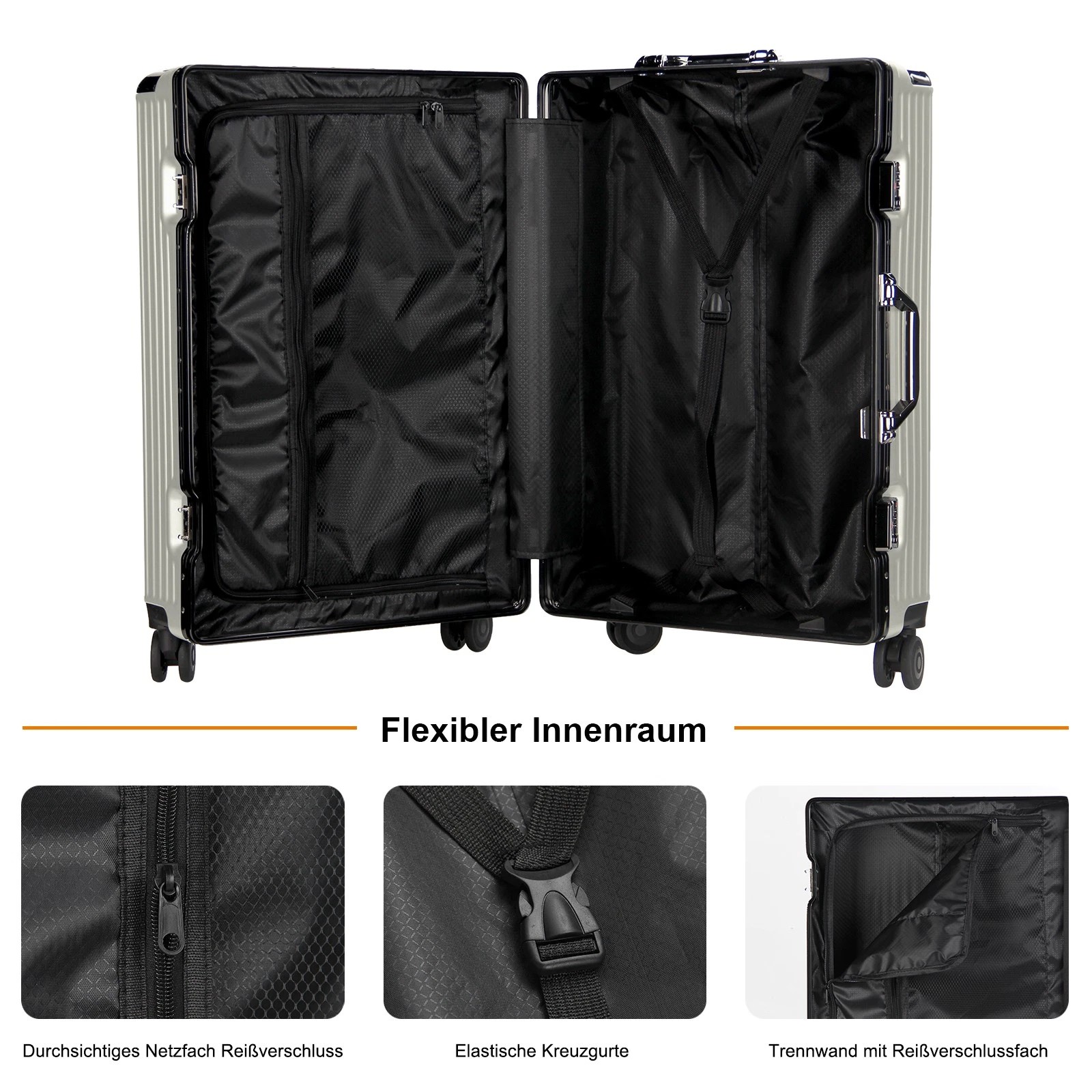 Jeder Koffer ist mit vier robusten Aluminium-Eckrahmen ausgestattet, die Ihren Habseligkeiten zusätzlichen Schutz bieten. Diese Eckprotektoren absorbieren Stöße und sorgen dafür, dass Ihr Gepäck während des Transports unversehrt bleibt.