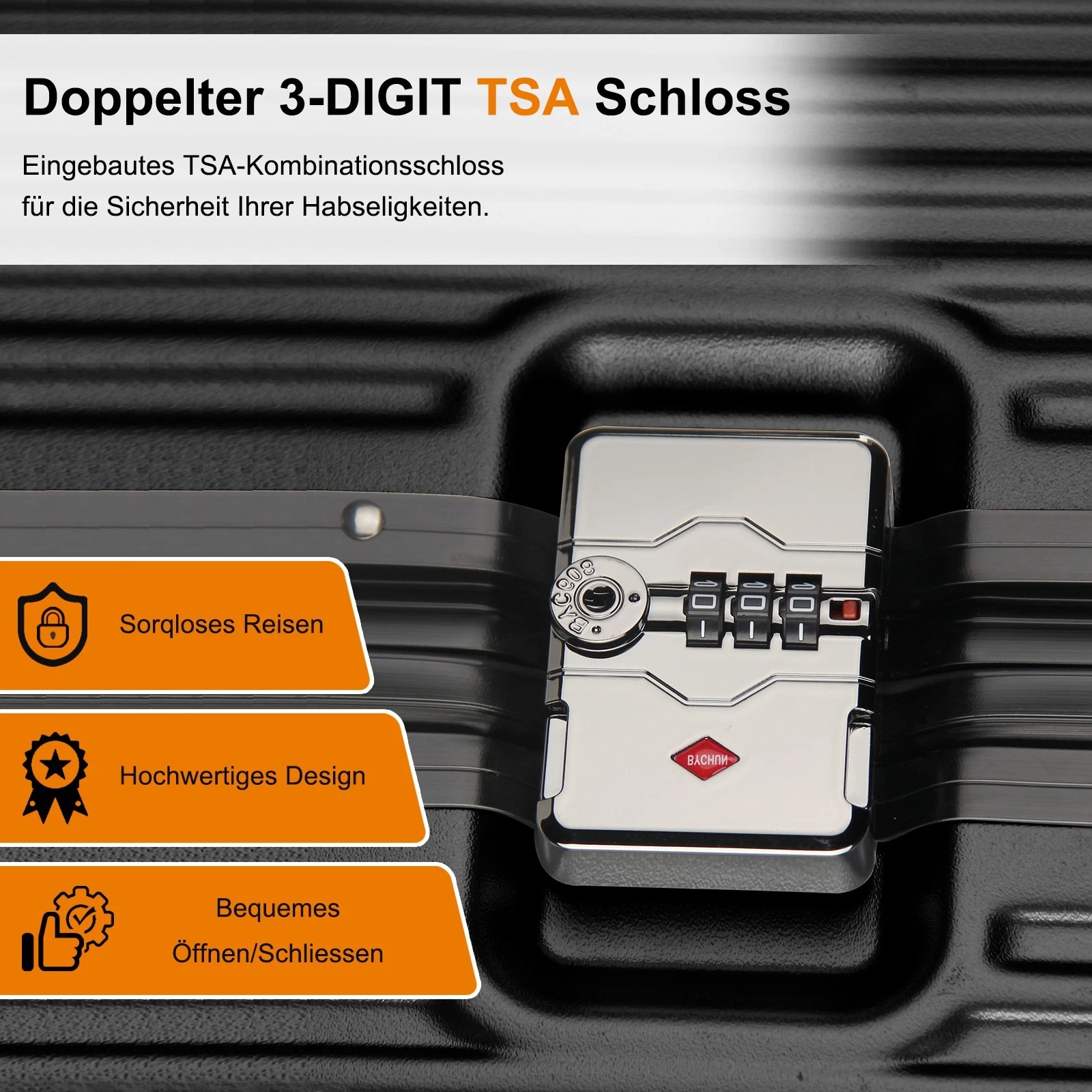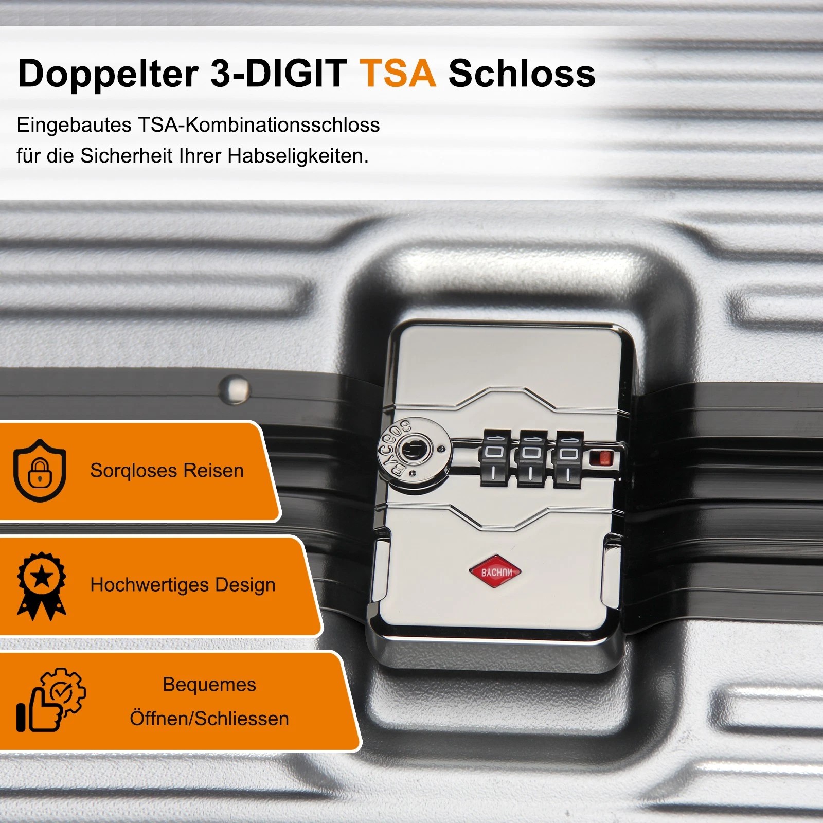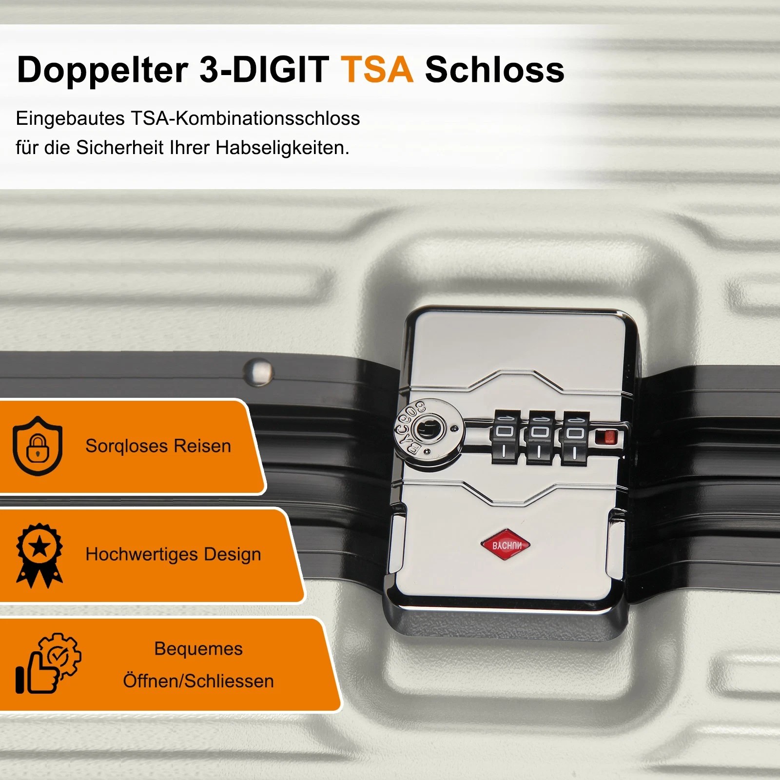 Es handelt sich um ein weltweit universelles Schloss. Das Schlüsselloch ist so konzipiert, dass Zollbeamte das Gepäck mit ihrem Hauptschlüssel schnell öffnen können. Käufer benötigen keinen Schlüssel, sondern müssen lediglich ein Passwort festlegen.