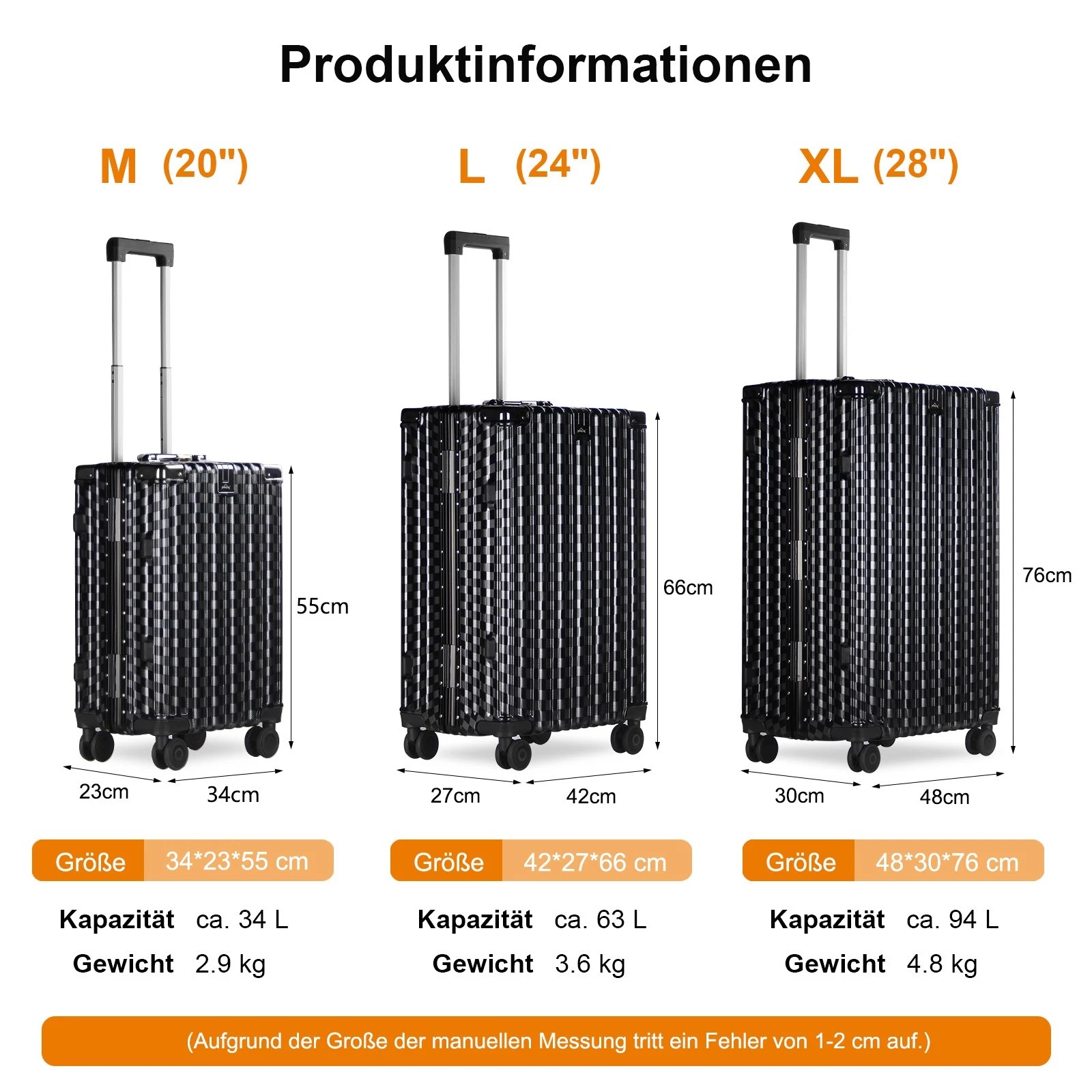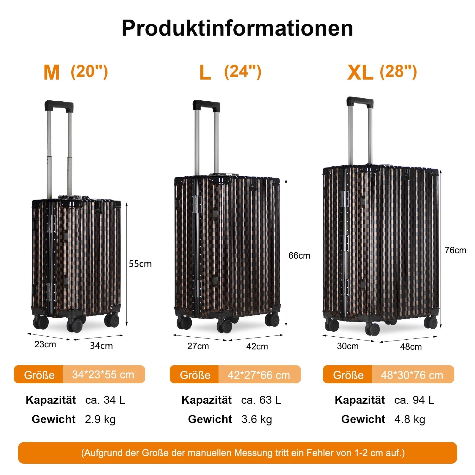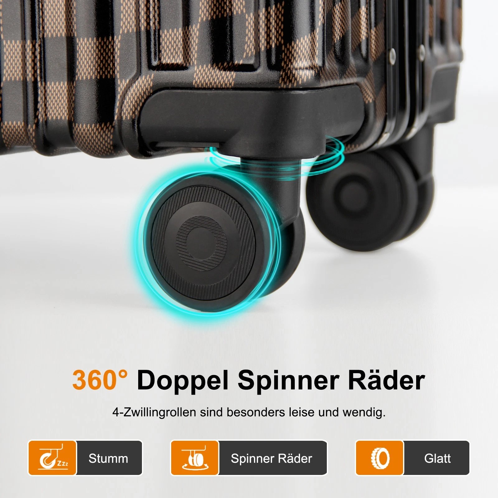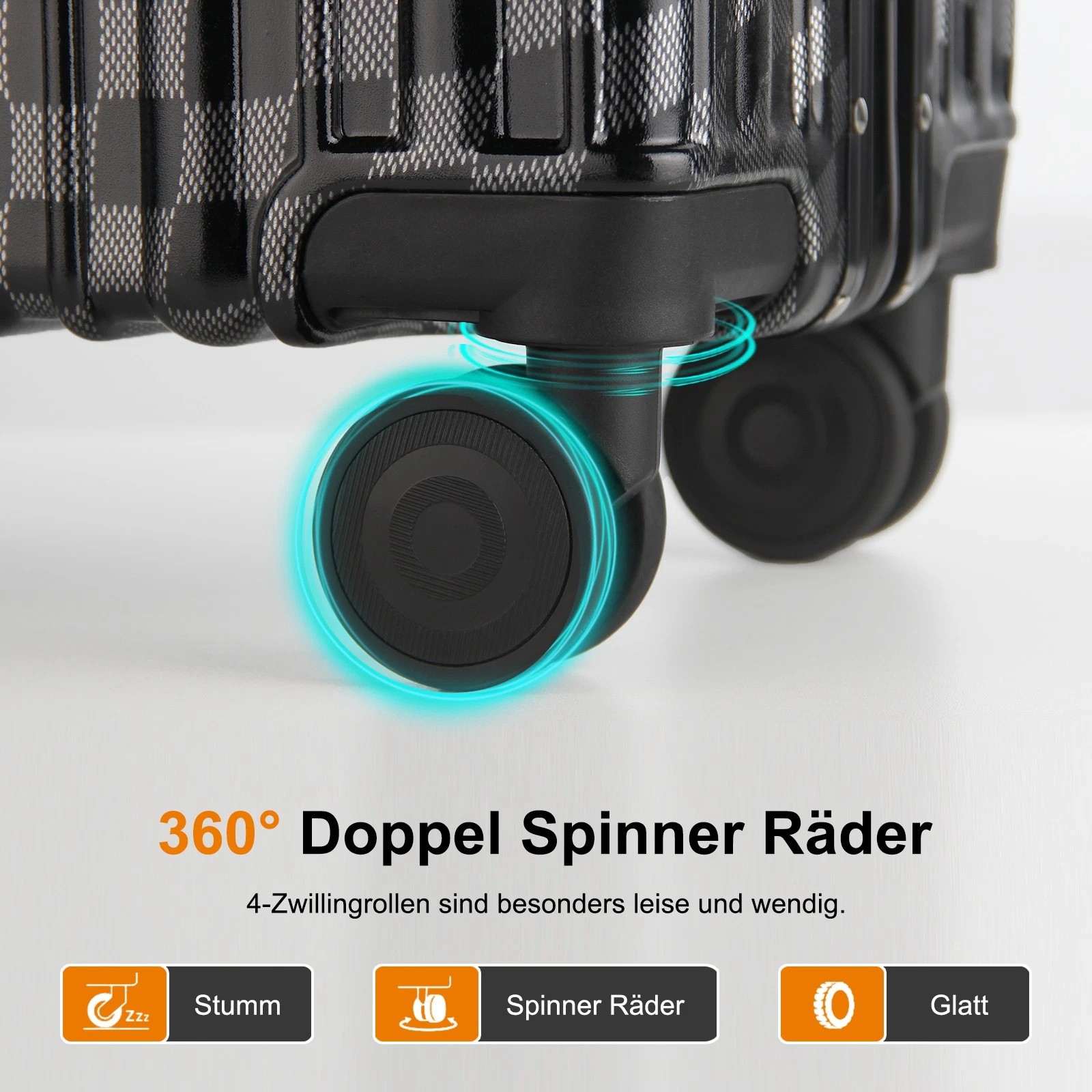 Dank der leichtgängigen und geräuscharmen 360-Grad-Drehrollen lässt sich der Koffer mühelos in jede Richtung bewegen. Der verstellbare 3-stufige Teleskopgriff aus Aluminium und die Griffe an beiden Seiten des Koffers ermöglichen es Ihnen, ihn auf die bequemste Weise zu tragen, entweder vertikal oder horizontal.