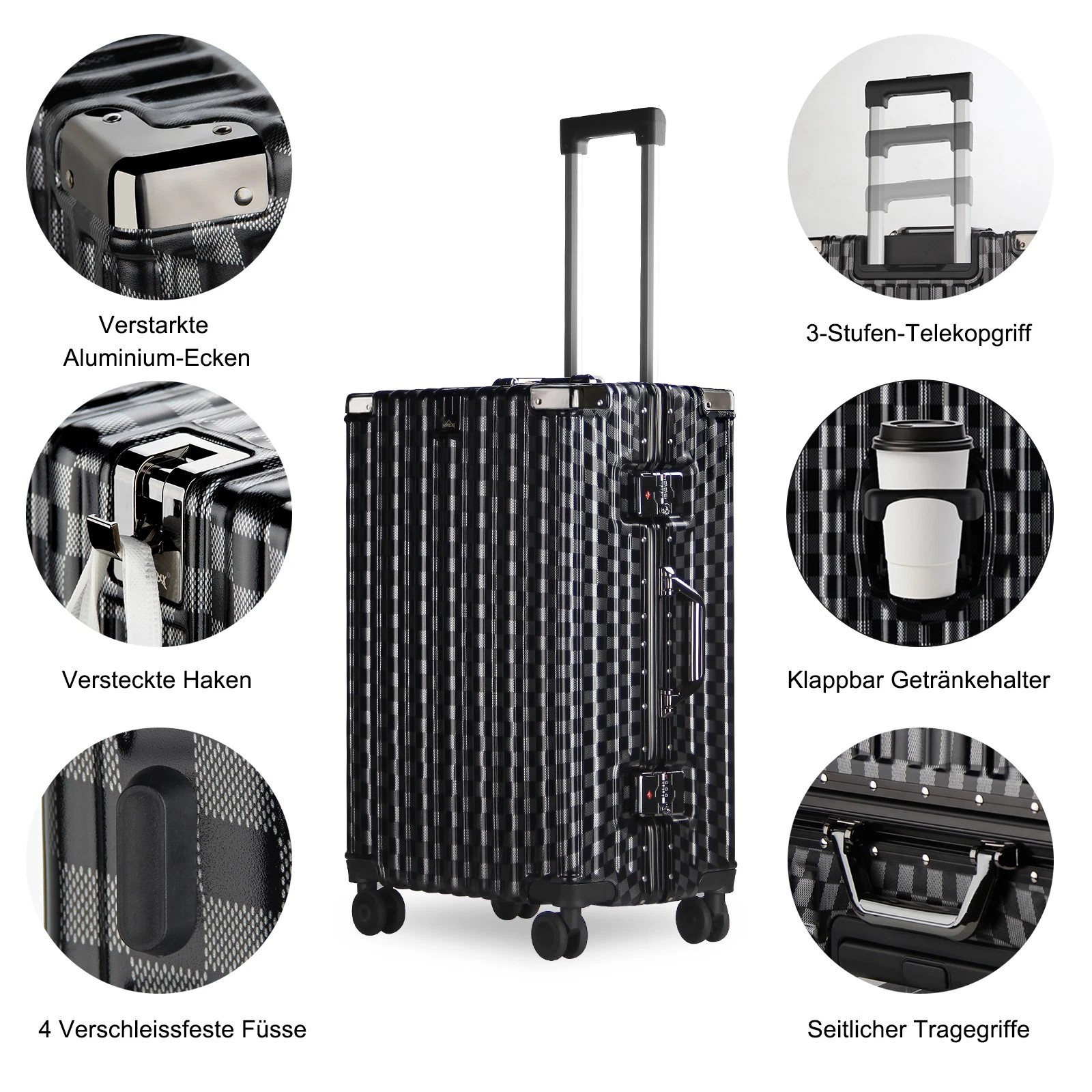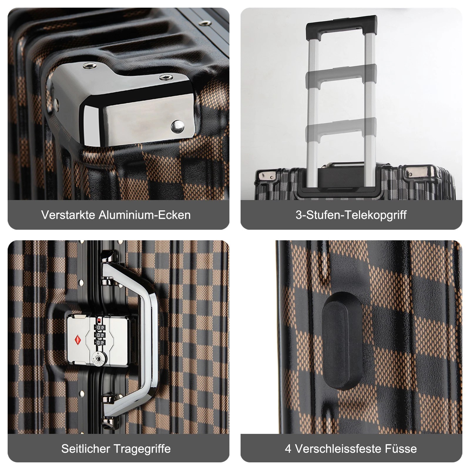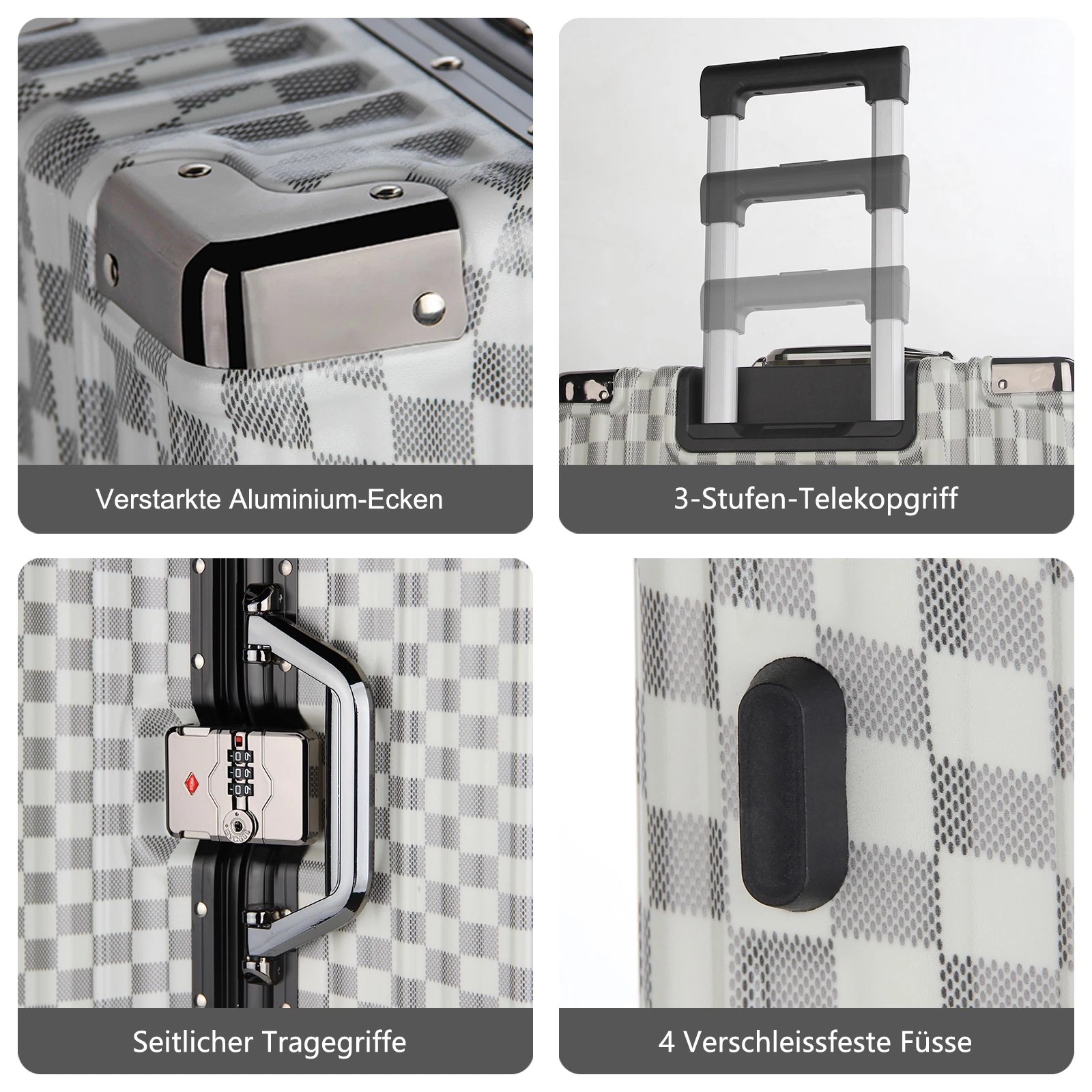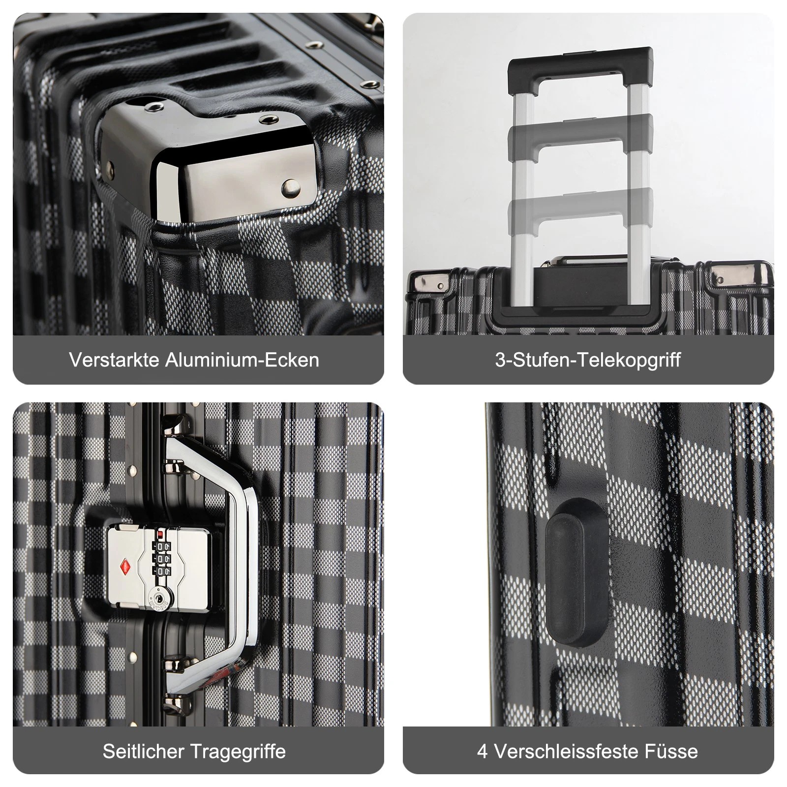 Jeder Koffer ist mit vier robusten Aluminium-Eckrahmen ausgestattet, die Ihren Habseligkeiten zusätzlichen Schutz bieten. Diese Eckprotektoren absorbieren Stöße und sorgen dafür, dass Ihr Gepäck während des Transports unversehrt bleibt.