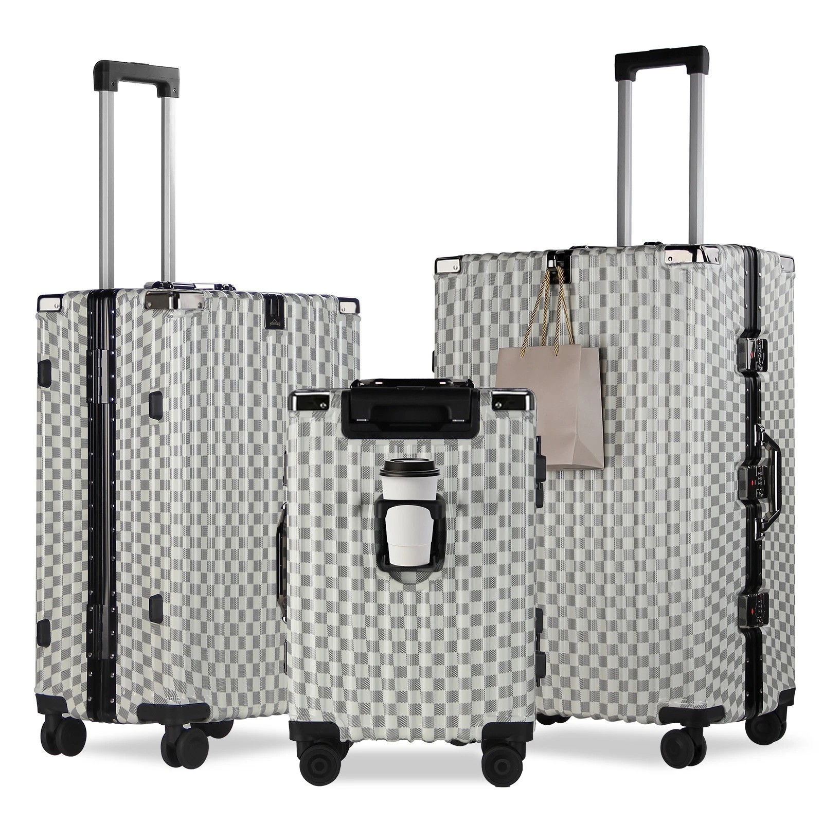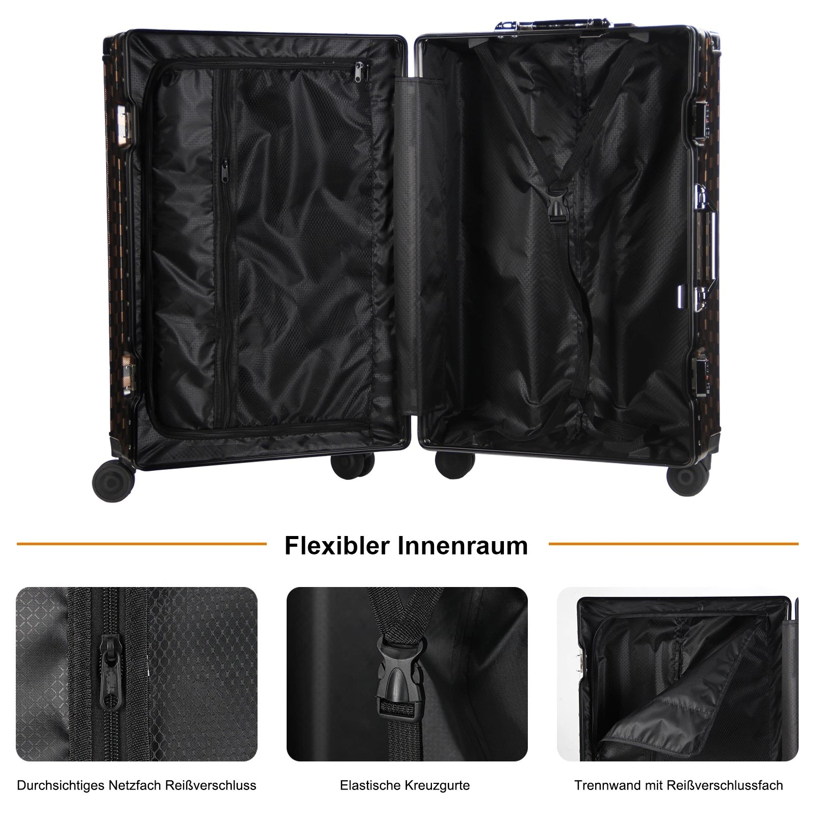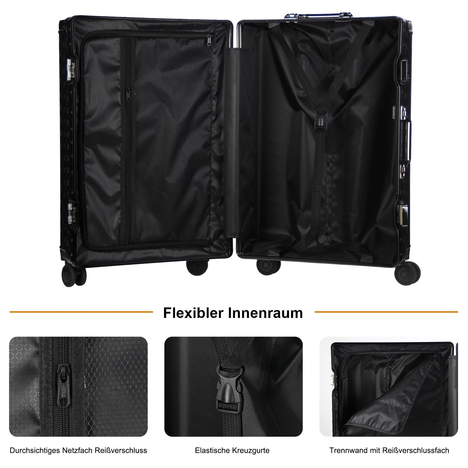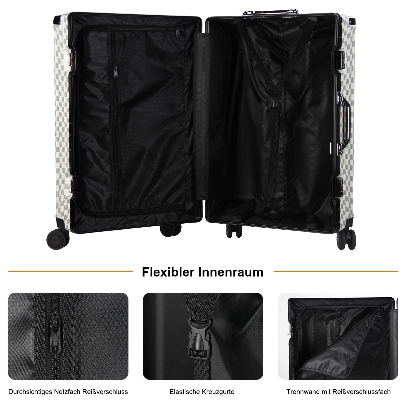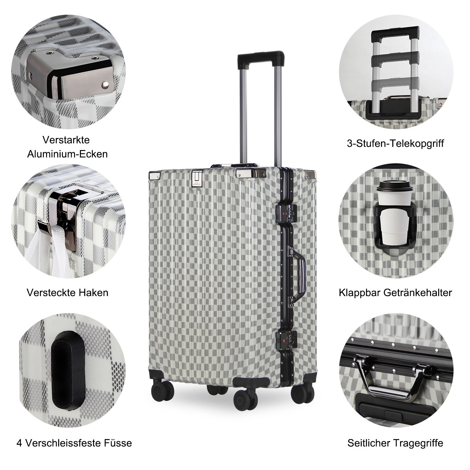 Jeder Koffer ist mit vier robusten Aluminium-Eckrahmen ausgestattet, die Ihren Habseligkeiten zusätzlichen Schutz bieten. Diese Eckprotektoren absorbieren Stöße und sorgen dafür, dass Ihr Gepäck während des Transports unversehrt bleibt.