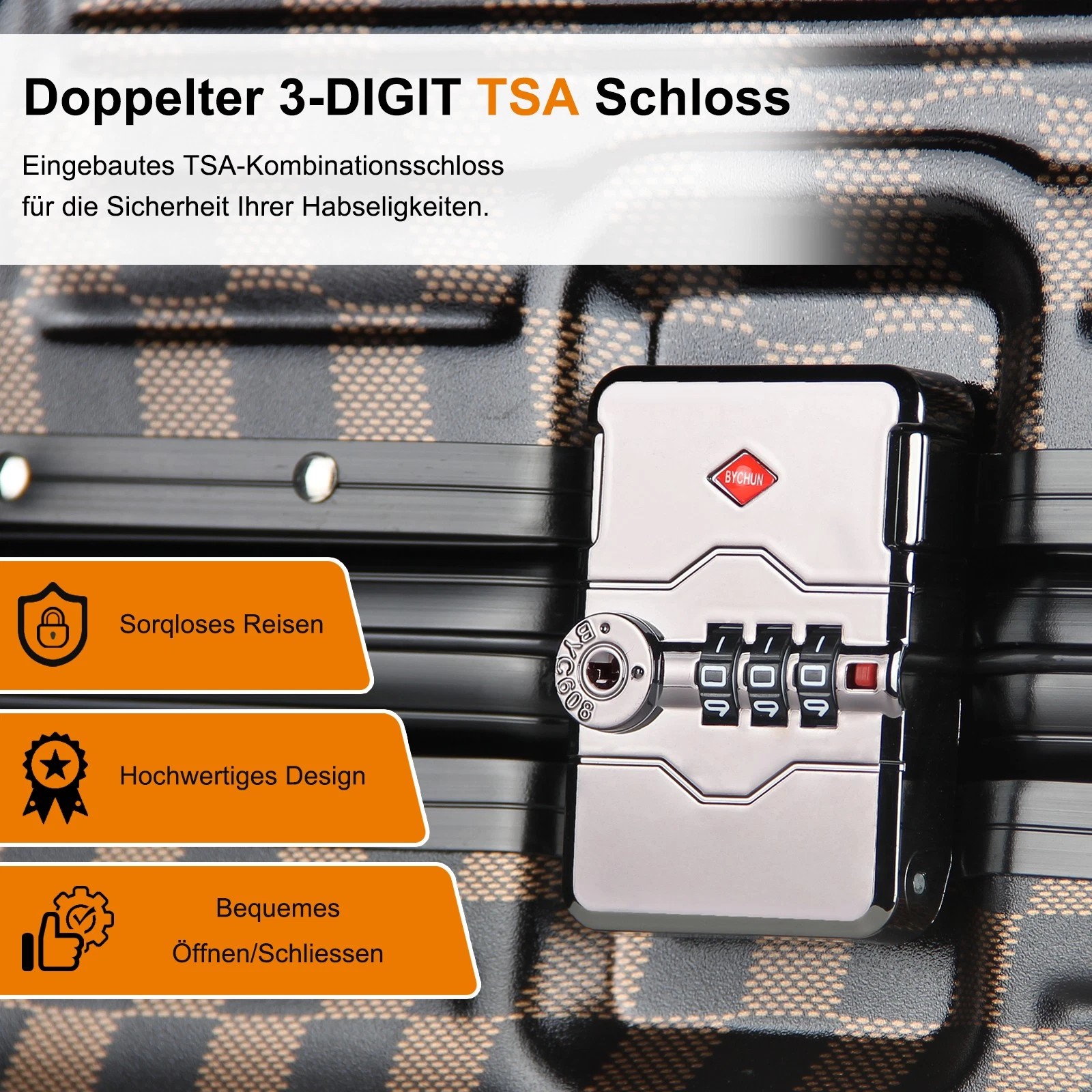 Es handelt sich um ein weltweit universelles Schloss. Das Schlüsselloch ist so konzipiert, dass Zollbeamte das Gepäck mit ihrem Hauptschlüssel schnell öffnen können. Käufer benötigen keinen Schlüssel, sondern müssen lediglich ein Passwort festlegen.