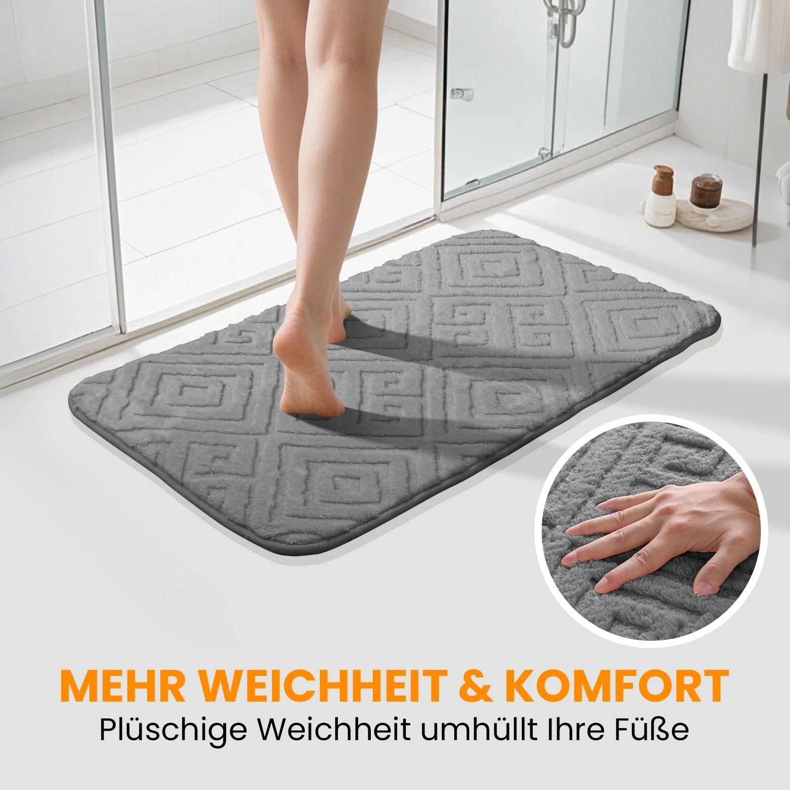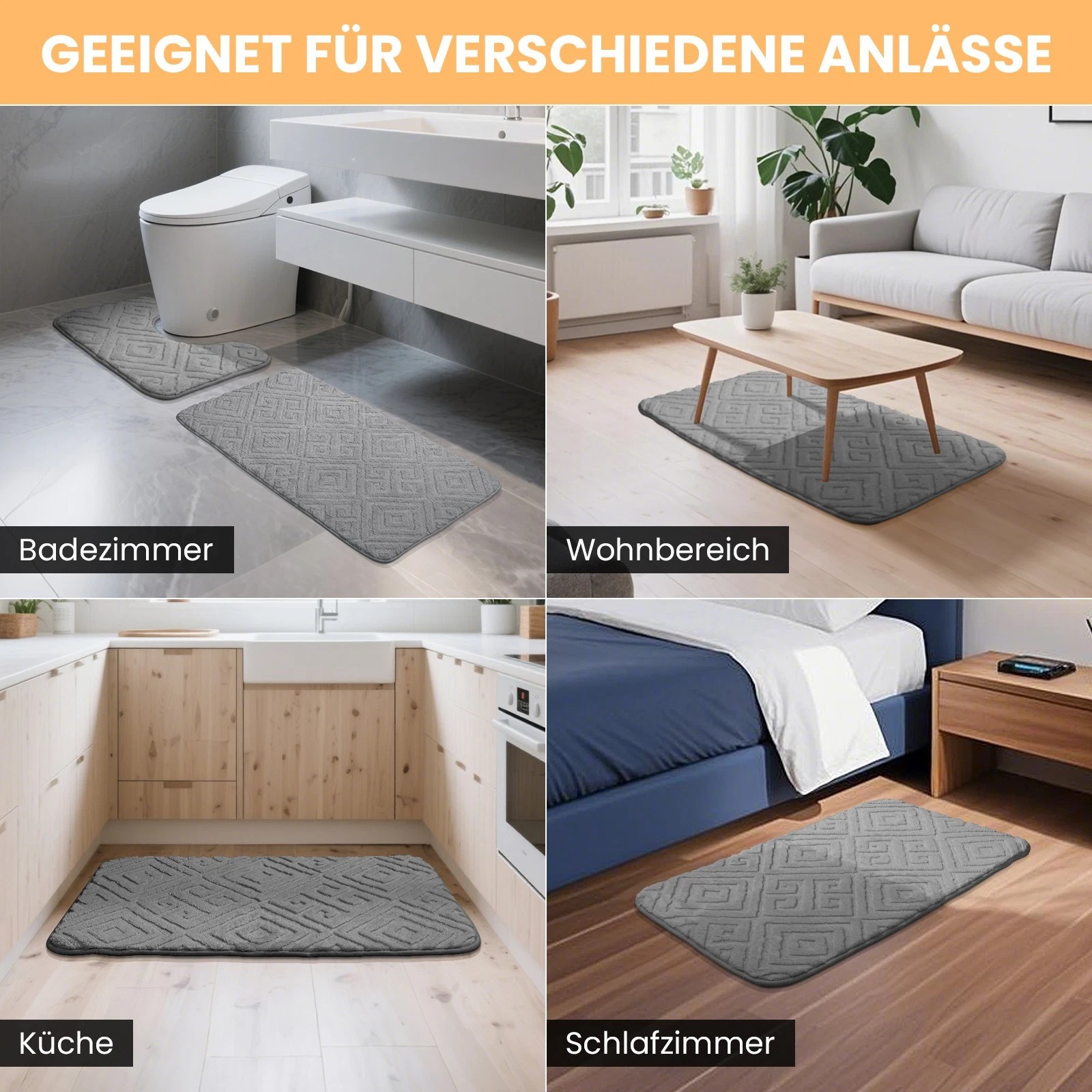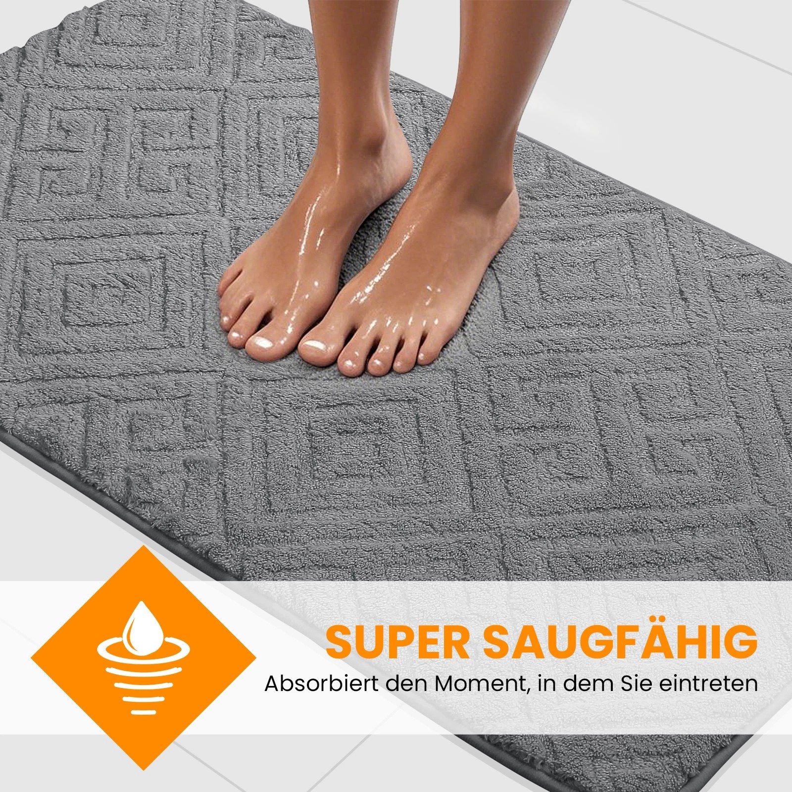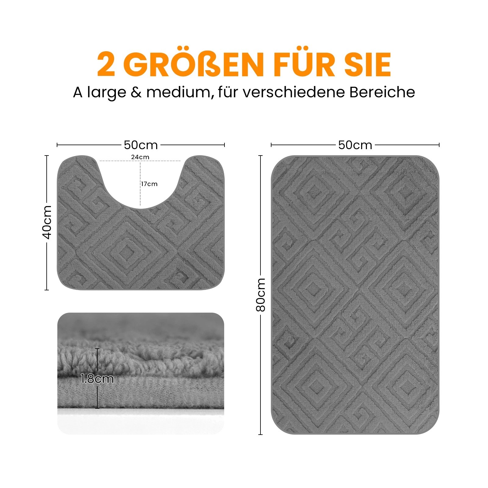 Verfügbar in vier eleganten Farben (Cream, Grau, Silber, Beige) und mit der Wahl zwischen zwei ansprechenden Mustern (Griechischen Stil und Geometrisch Streifen), lässt sich das Set perfekt an Ihren persönlichen Einrichtungsstil anpassen. Darüber hinaus können Sie zwischen zwei Größenvarianten wählen: • Kleine Ausführung (50x80 cm & 50x40 cm): ideal für kompakte Bäder • Große Ausführung (60x100 cm & 60x50 cm): mehr Fläche, maximaler Komfort nach dem Duschen