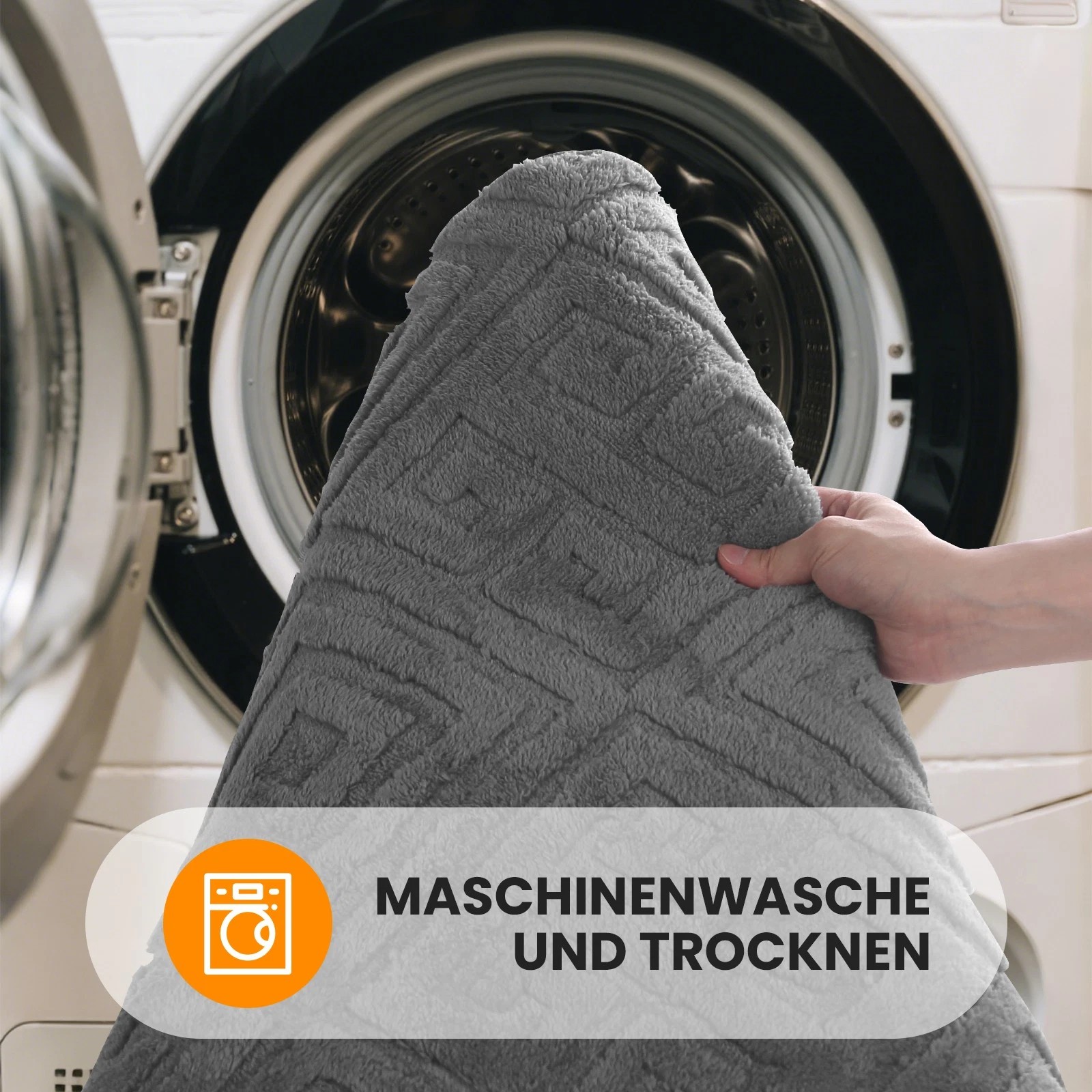 Mit der fortschrittlichen Faserverriegelungstechnologie ist jede Faser fest mit der Rückseite verbunden, so dass das Badteppichset immer wieder gewaschen werden kann, ohne zu vergießen. Einfach in der Waschmaschine in kaltem Wasser waschen, im Wäschetrockner auf niedriger Stufe oder an der Luft trocknen. Nicht bleichen.