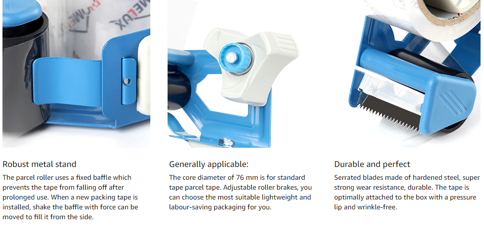 Ergonomic adhesive strip dispenser sits comfortably in the hand and allows a comfortable grip when gluing with packing tape; serrated cutting blades are positioned at an optimal angle to ensure precise cuts and unrolling for every application; adjustable roller brakes, no more loose adhesive strips.