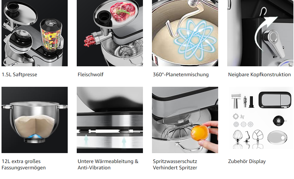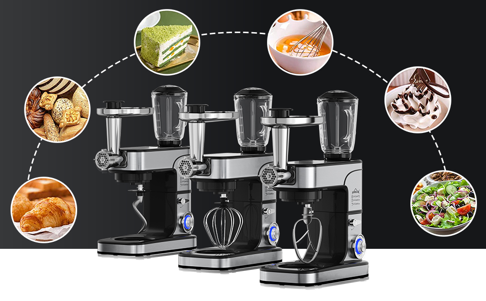 the fully tilting motor head makes it easy to remove the mixing bowl and eject the whisk or dough hook. No more mess. 6 non-slip suction feet keep the electric mixer stable even during heavy mixing operation. Stronger motor, but lower operating noise ≤ 75dB. With multiple safety protection systems, the stand mixer provides a safer and quieter cooking and baking environment.