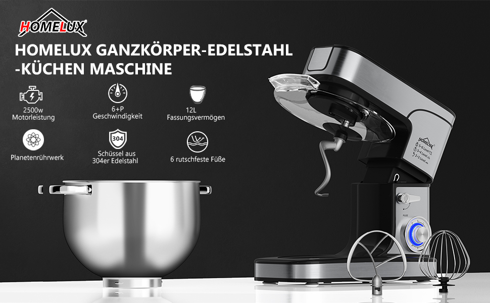 the housing of the Homelux electric stand mixer is made of stainless steel, with good heat dissipation and corrosion resistance, and 80% higher stability than other mixers with ABS housing, ensuring long-lasting use. Built by integrated die-casting process, with a tapered line design and internal high-density structure, makes it more exquisite and stronger load resistance.