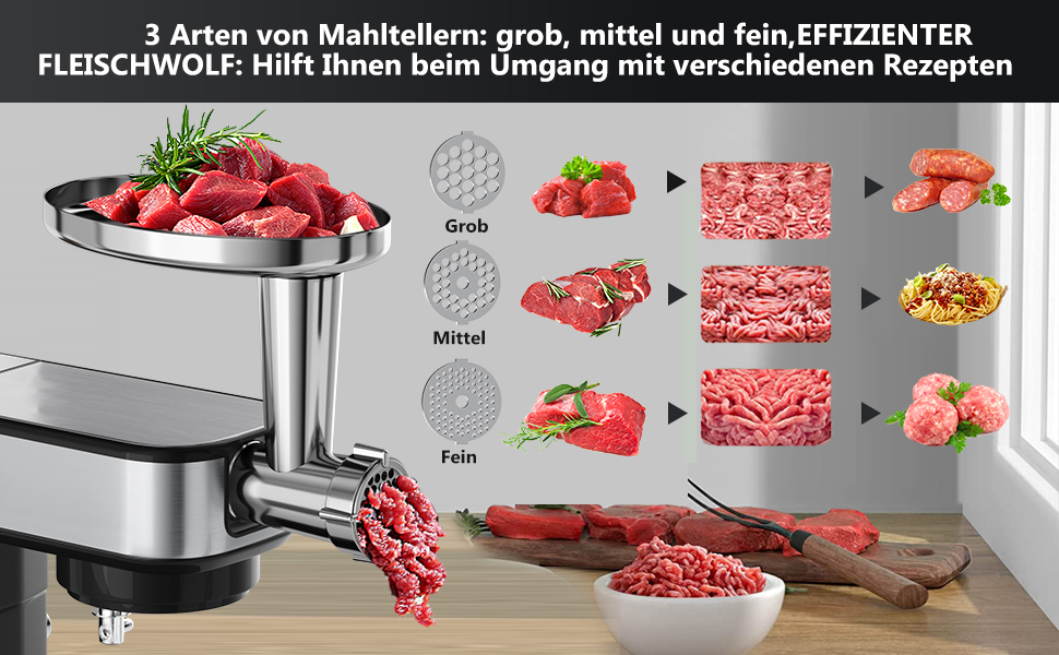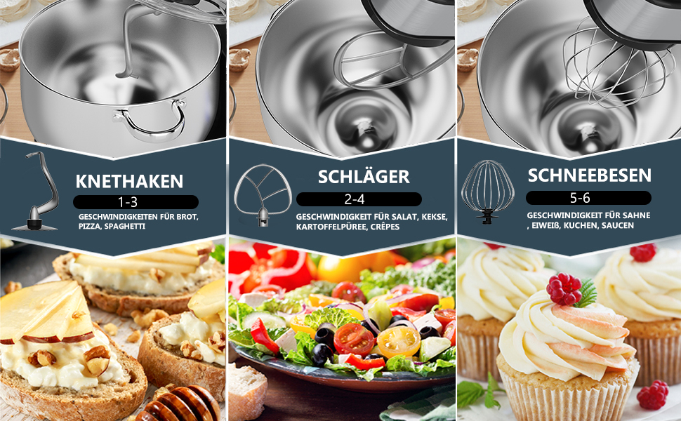The kitchen mixer comes with three mixing accessories: whisk, dough hook, whisk, whisk, so you can create a variety of cooking recipes to surprise your family and friends. The splash guard with access flap helps you fill ingredients without mess and gives your kitchen a shiny and tidy look. All accessories are easily removable and clean. (Note: The attachments are not dishwasher safe)