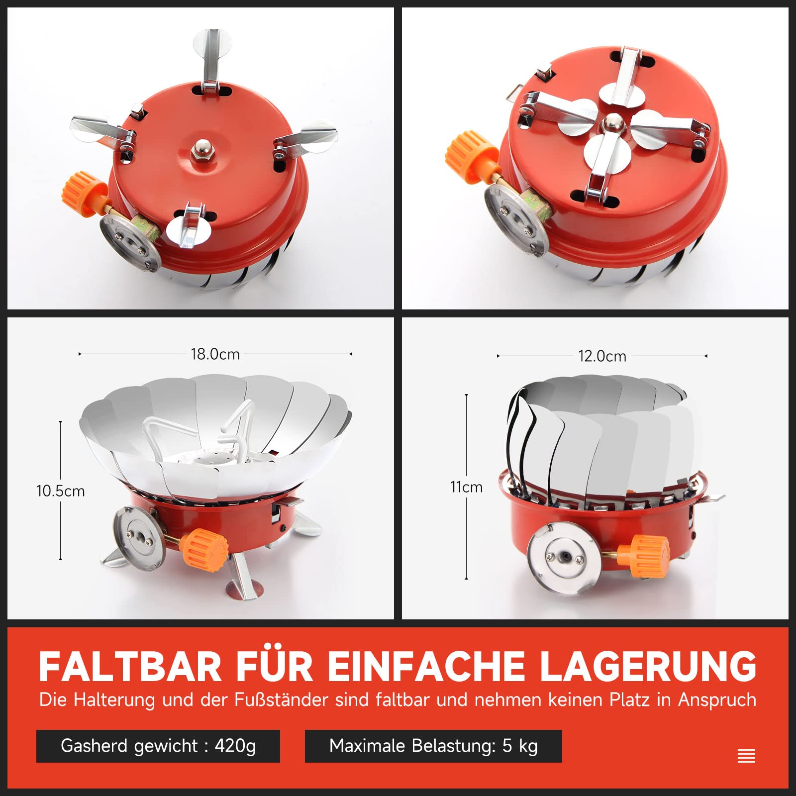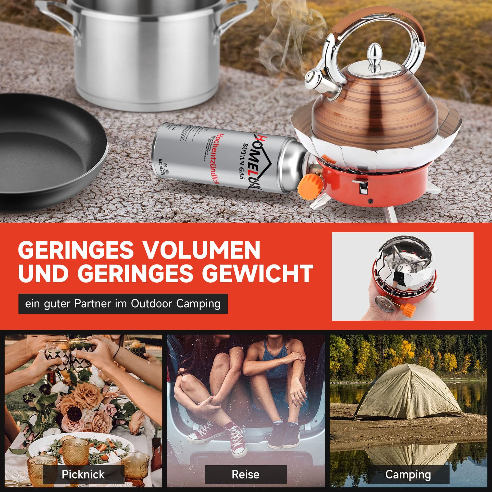the mini gas stove from Homelux is compact and lightweight and weighs only 420 g. The foldable design takes up little space. No connecting pipes or adapters are required, it can be connected directly to the flat gas tank for use, and the operation is quick and easy.