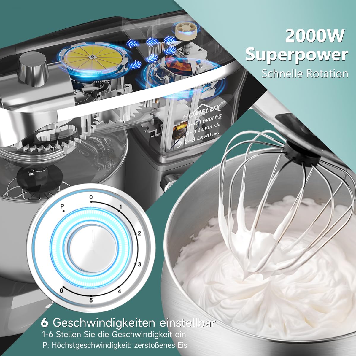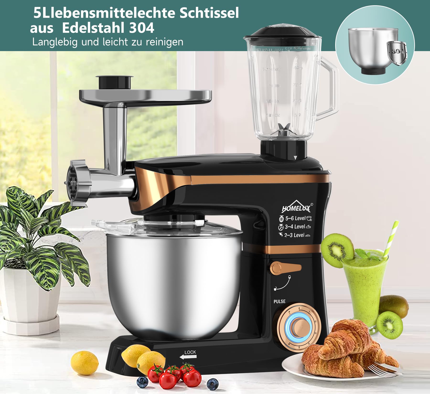 Our HOMELUX food processor impresses with a robust ABS housing and a 2000 watt copper motor. With 6 speed settings, it allows a safe, thorough and fast workflow.