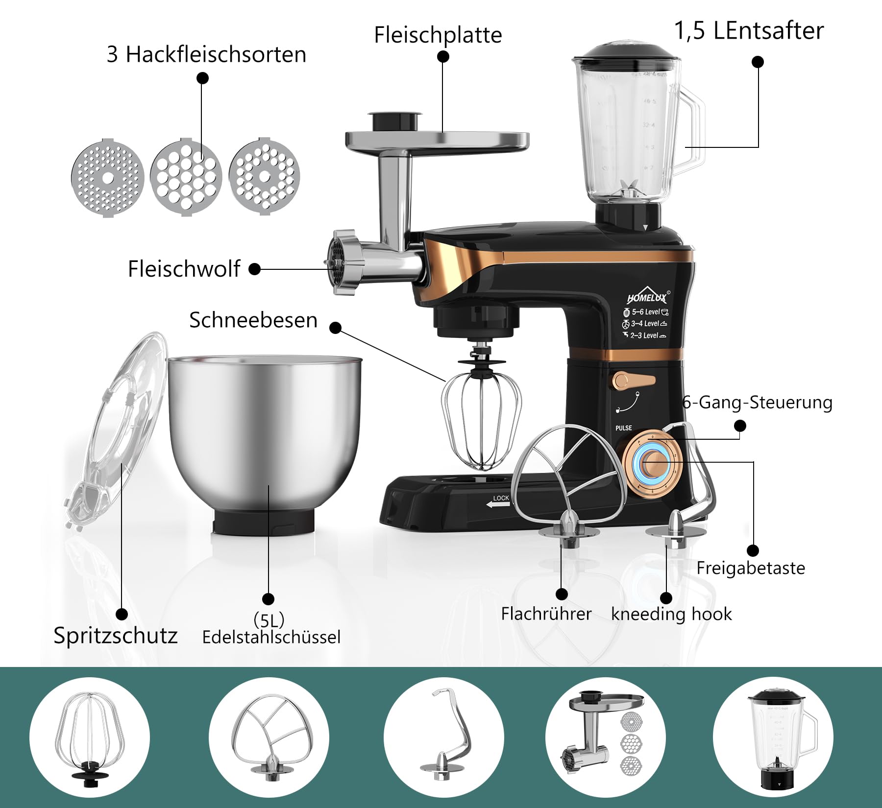 From meat grinder to juicer blender attachment, our food processor is the ideal choice. High quality dough hooks, quick beater and whisk make every cooking experience a pleasure.