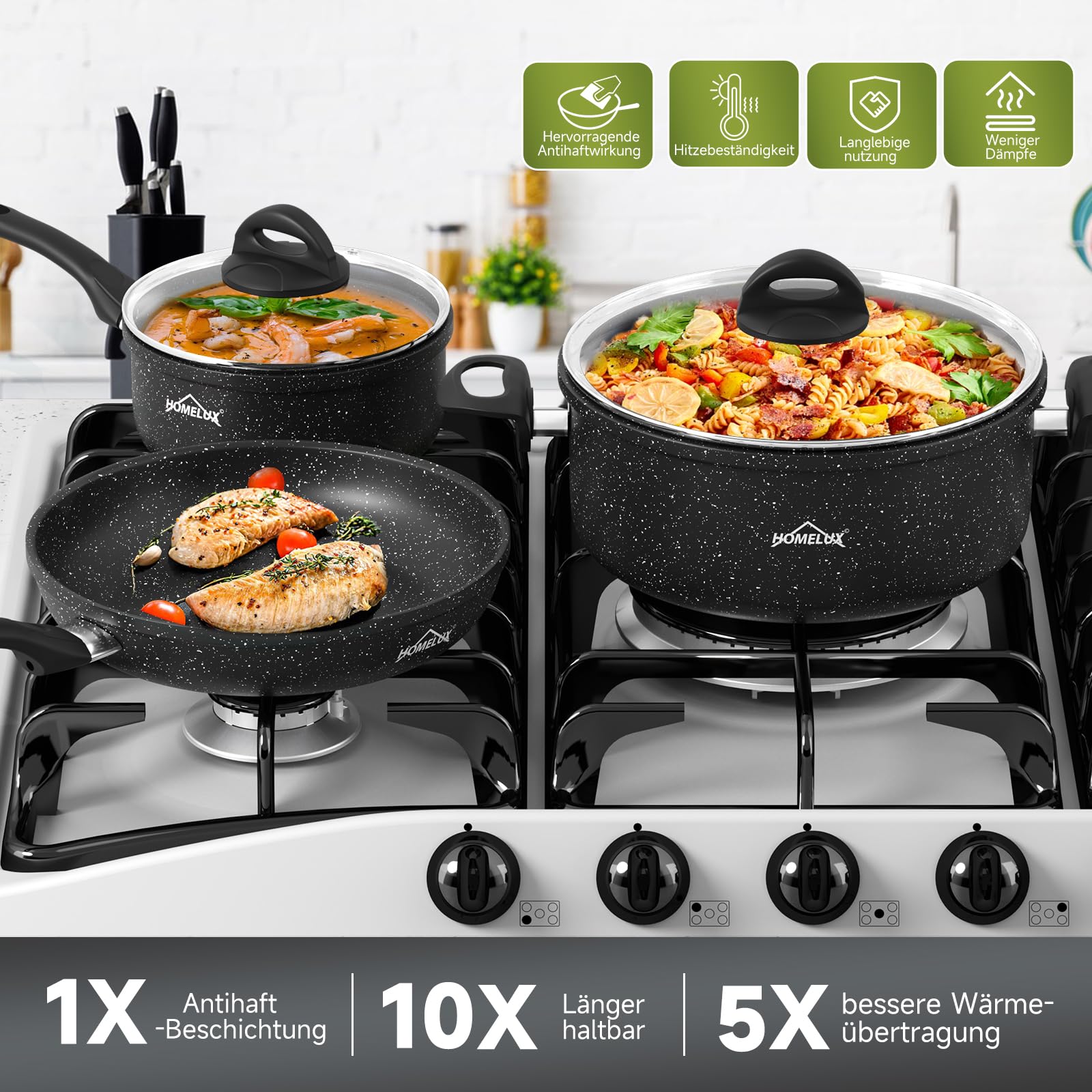the cookware set has a robust aluminium body. Durable and torsion-resistant, with a three-layer composite base that heats up quickly and distributes heat evenly for excellent cooking results. It is compatible with gas, electric, ceramic, glass, stove, induction hobs and more.