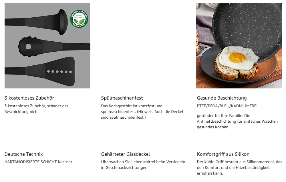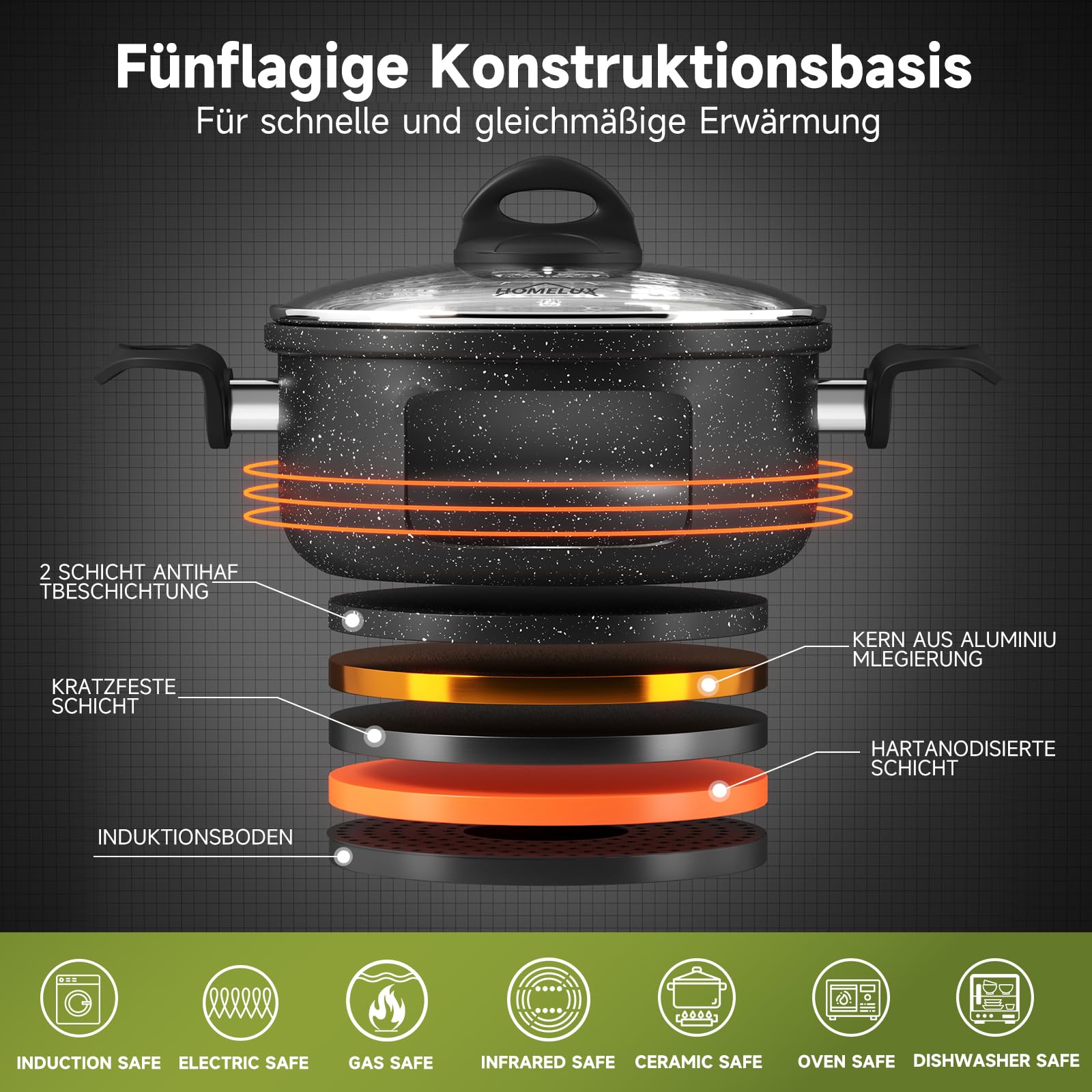 the cookware set has a robust aluminium body. Durable and torsion-resistant, with a three-layer composite base that heats up quickly and distributes heat evenly for excellent cooking results. It is compatible with gas, electric, ceramic, glass, stove, induction hobs and more.