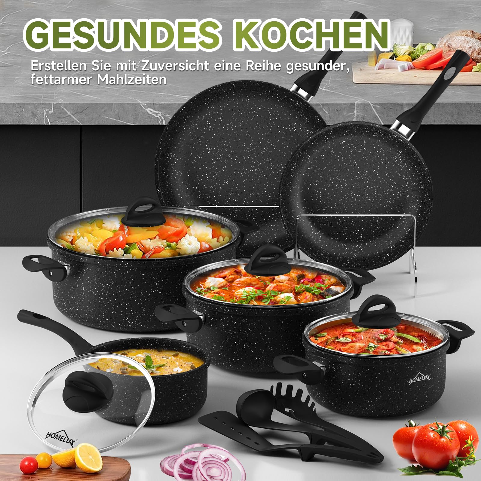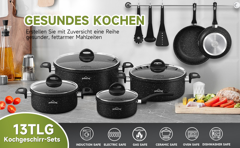 this stylish 13-piece cookware set from Homelux contains everything you need for daily cooking: 16 x 7 cm sauce pan with lid, 20 x 9 cm casserole with lid, 24 x 10 cm casserole with lid, 28 x 12 cm casserole with lid. 24x5cm Frying pan; 28 x 5.5 cm frying pan; 3 cooking accessories