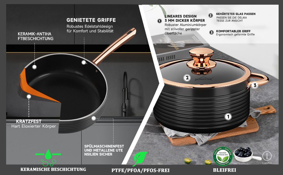 the cookware set has a stylish ribbed surface and a robust aluminium body with a 3 mm thick construction. Durable and torsion-resistant, with a three-layer composite base that heats up quickly and distributes heat evenly for excellent cooking results. It is compatible with gas, electric, ceramic, glass, stove, induction hobs and more.
