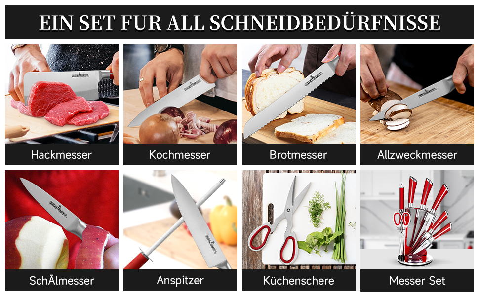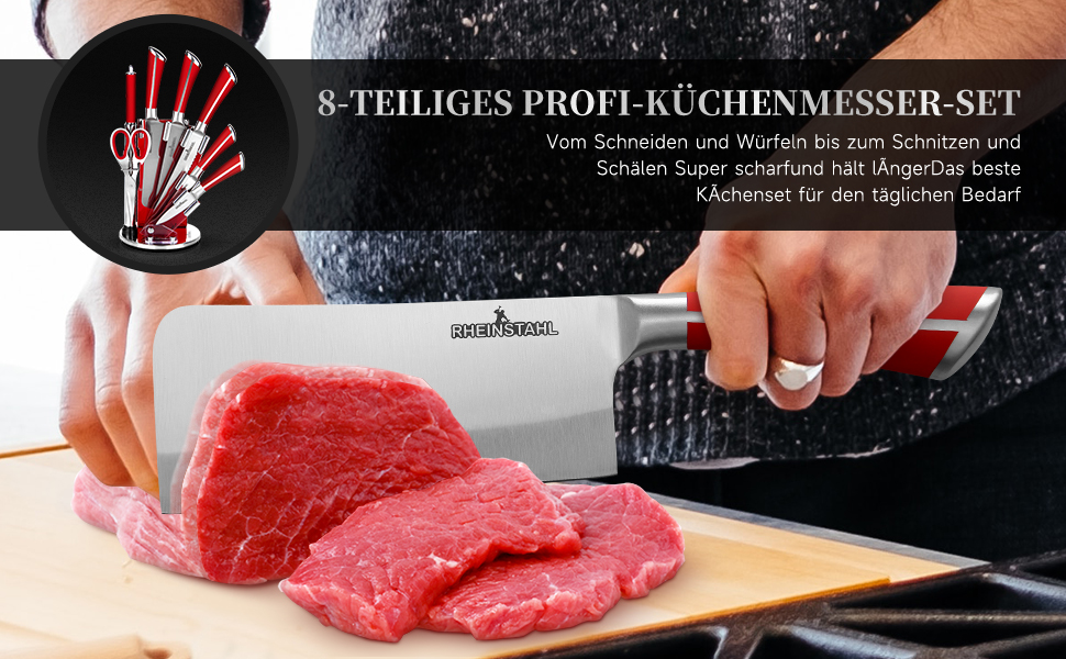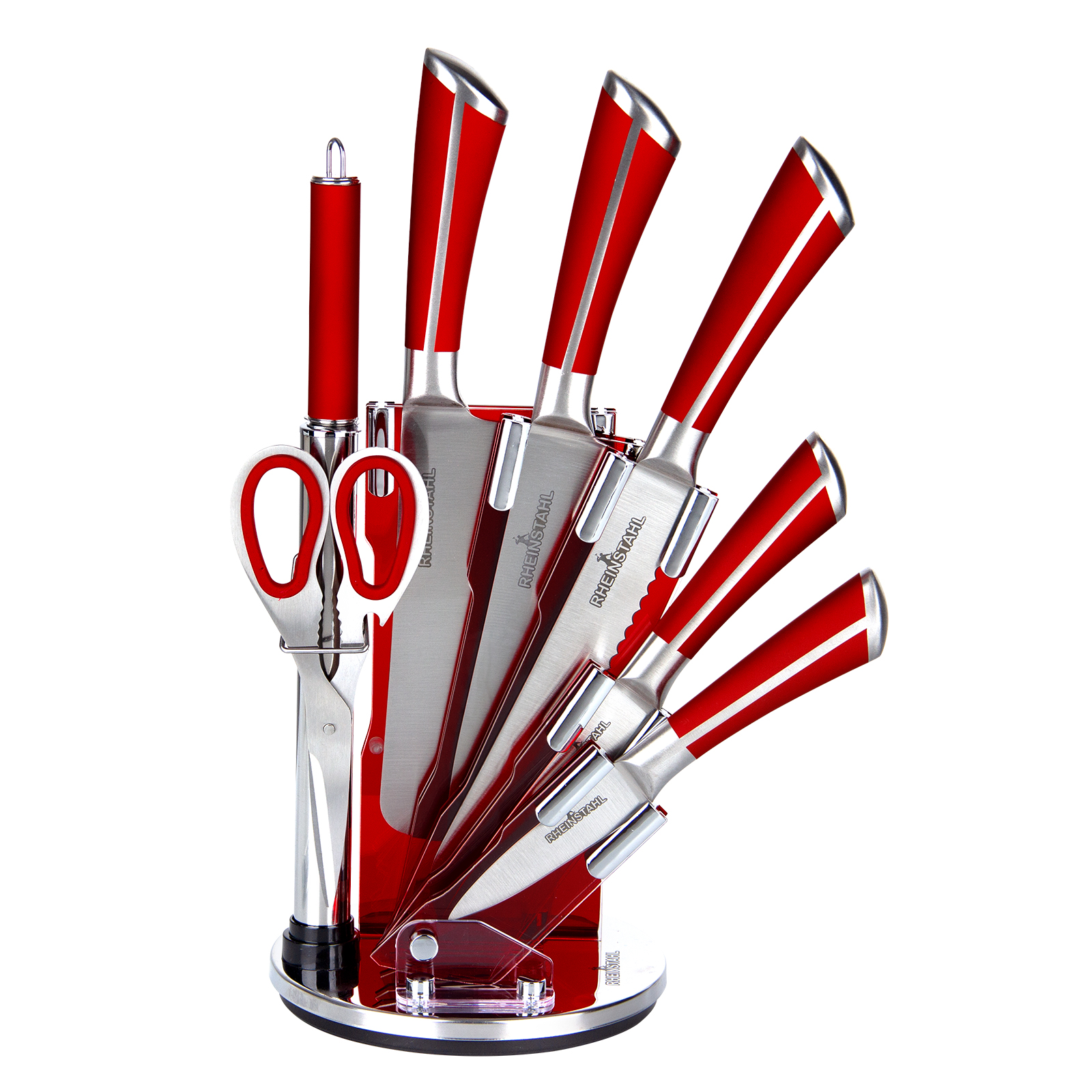 RHEINSTAHL knife block with knives, 9-piece knife set with acrylic block holder, sharp stainless steel kitchen knives, chef's knife set with manual sharpener peeling scissors,RH-8P2KSRS