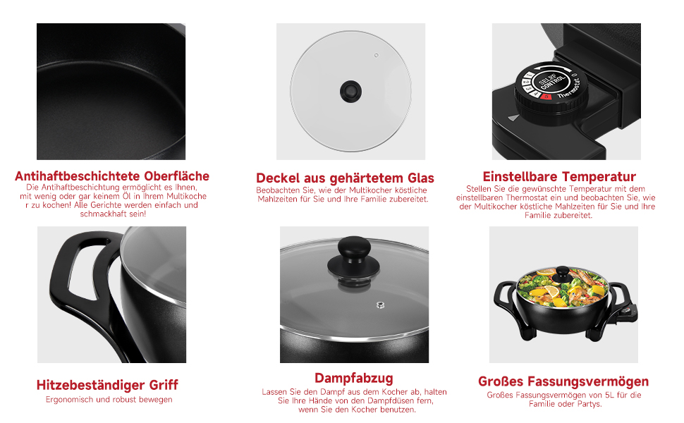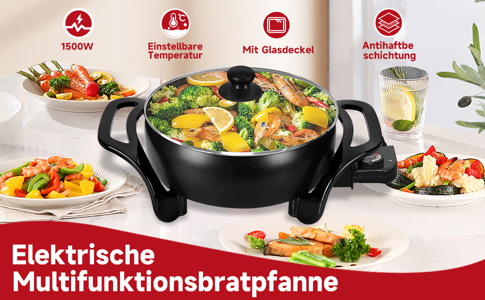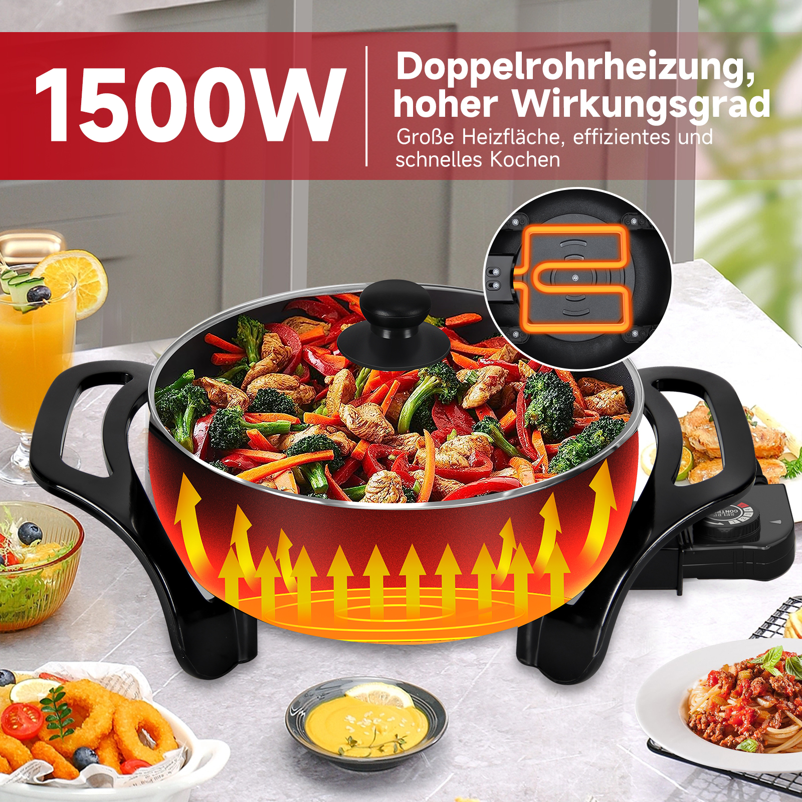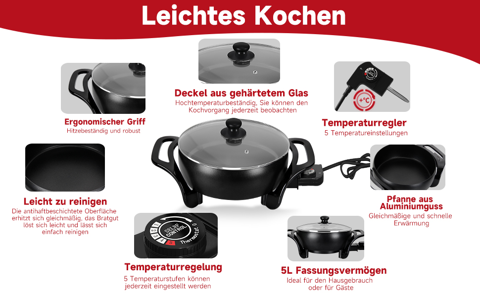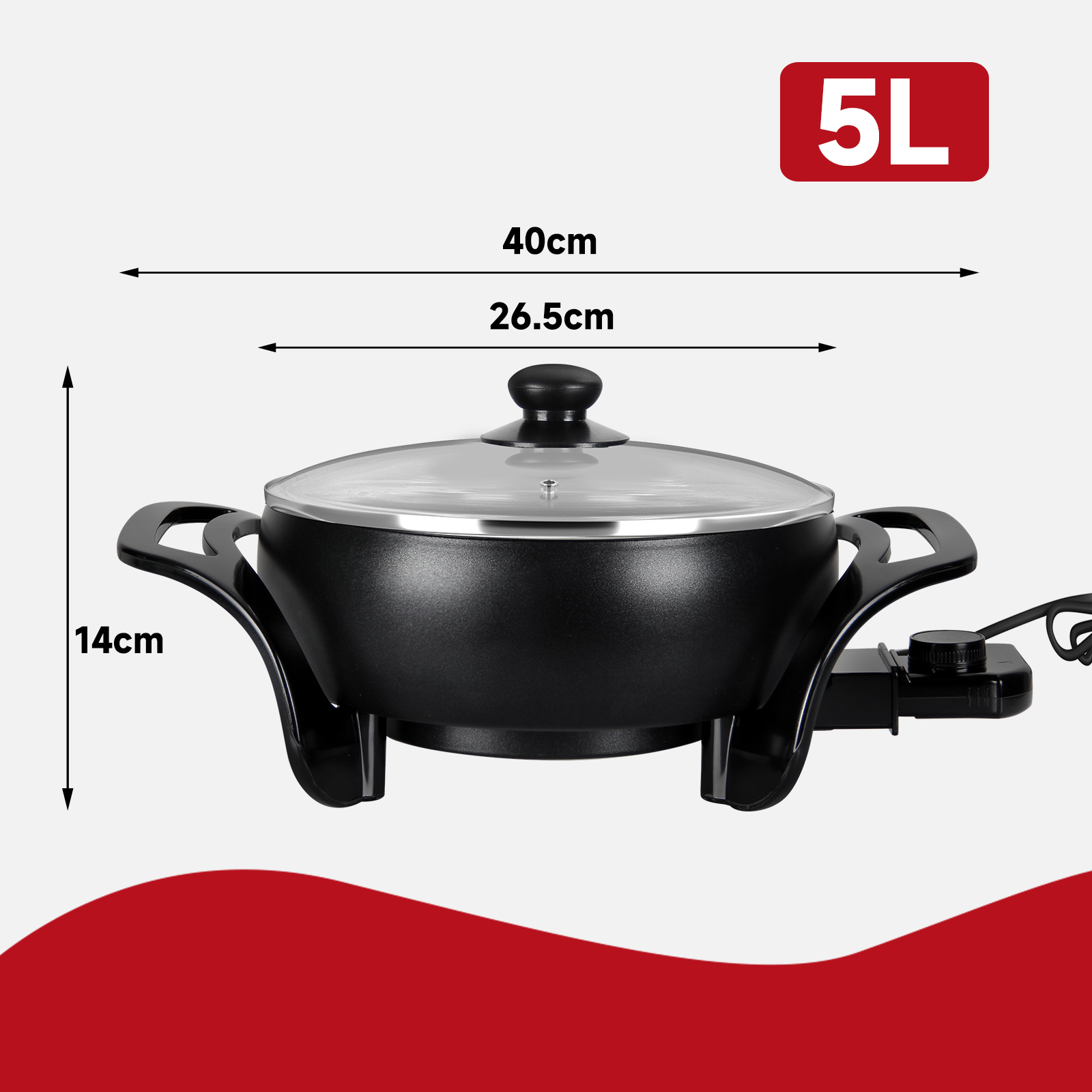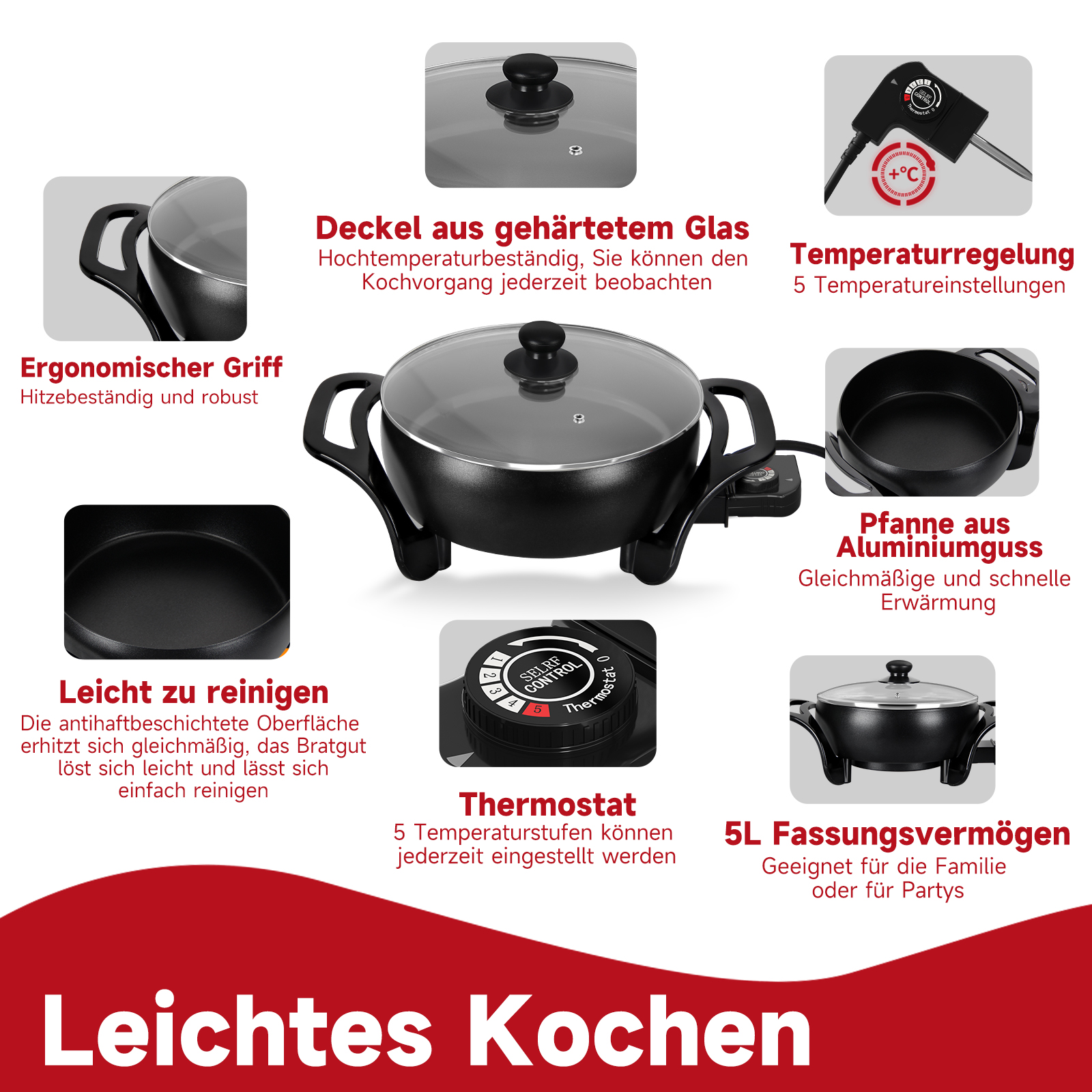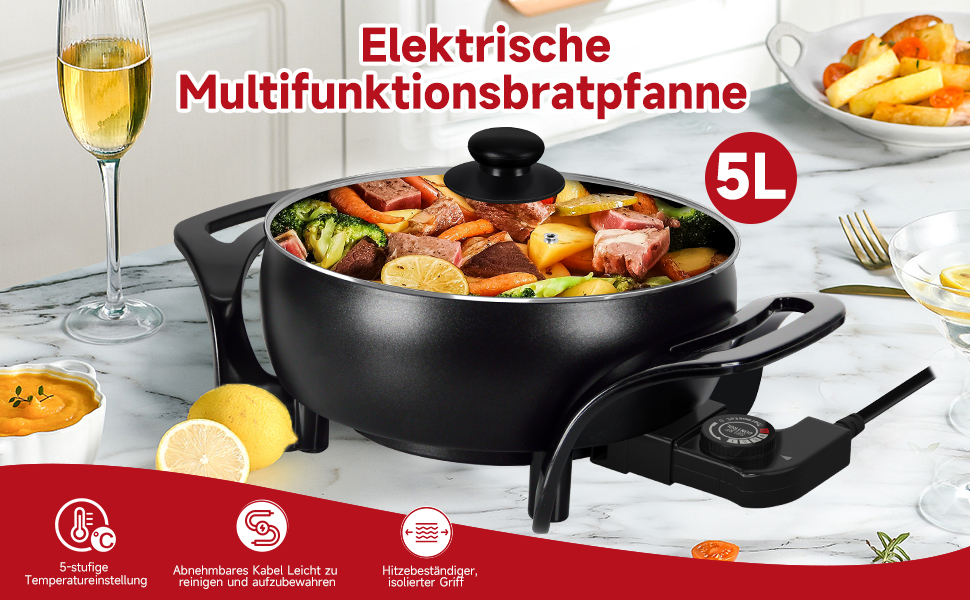 The electric pan with a capacity of 5 liters is ideal for parties, whether for preparing dishes or as a hotpot. If you have any questions, please feel free to contact us.