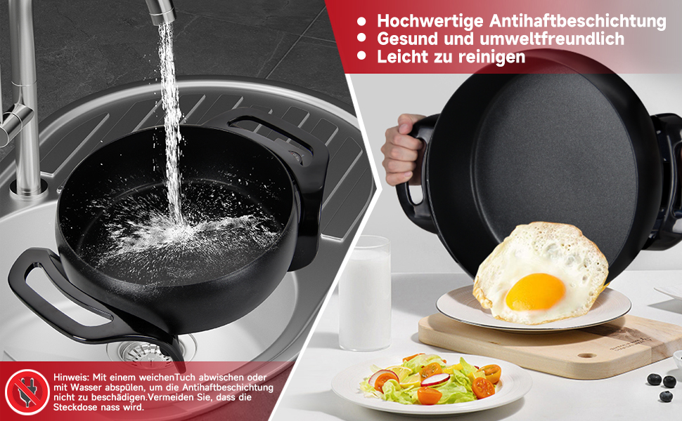 The surface of the electric pan has a non-stick coating, less oil when cooking ensures healthy food and is easy to clean, it is recommended to use a damp cloth to clean it by hand, do not rub the bottom of the pot with sharp objects.