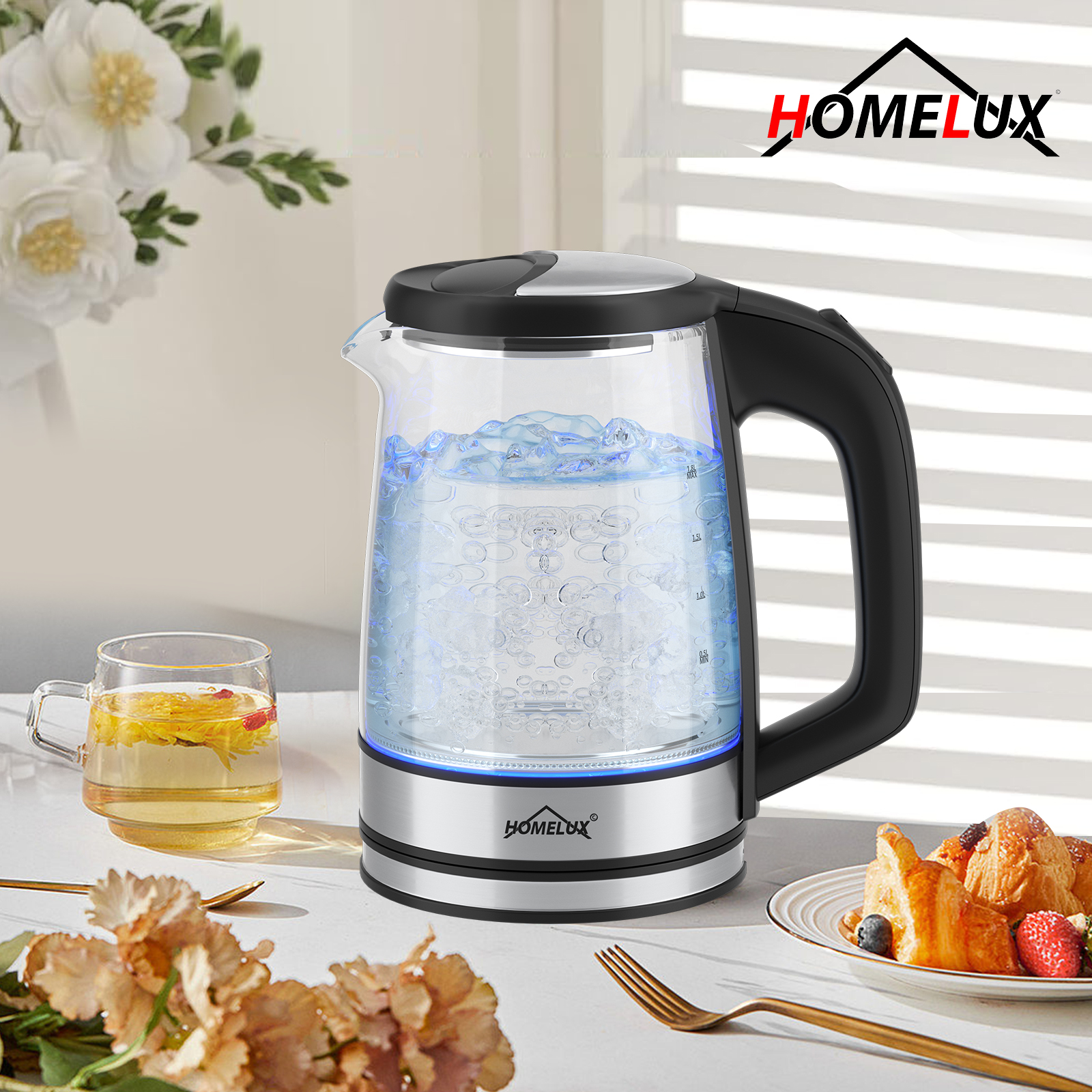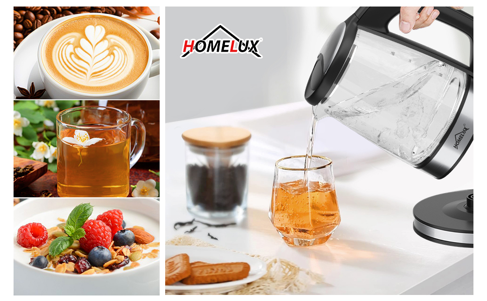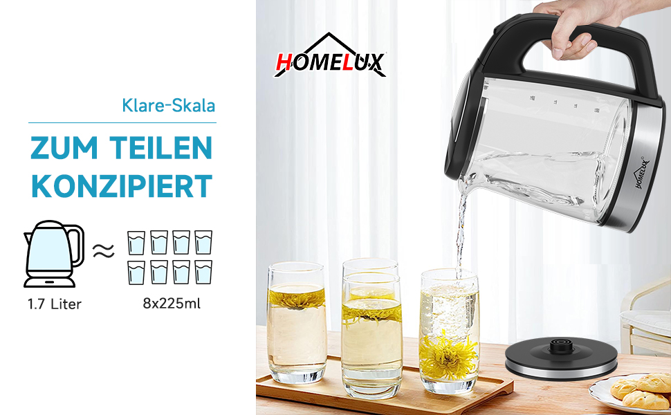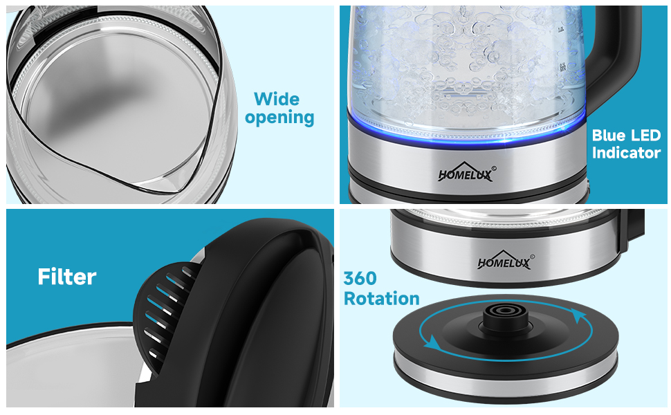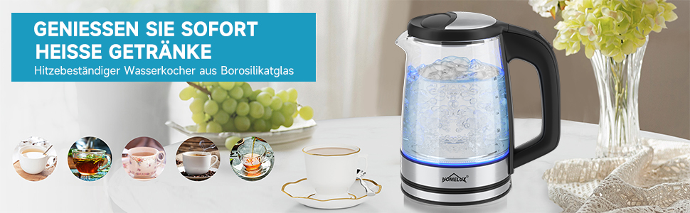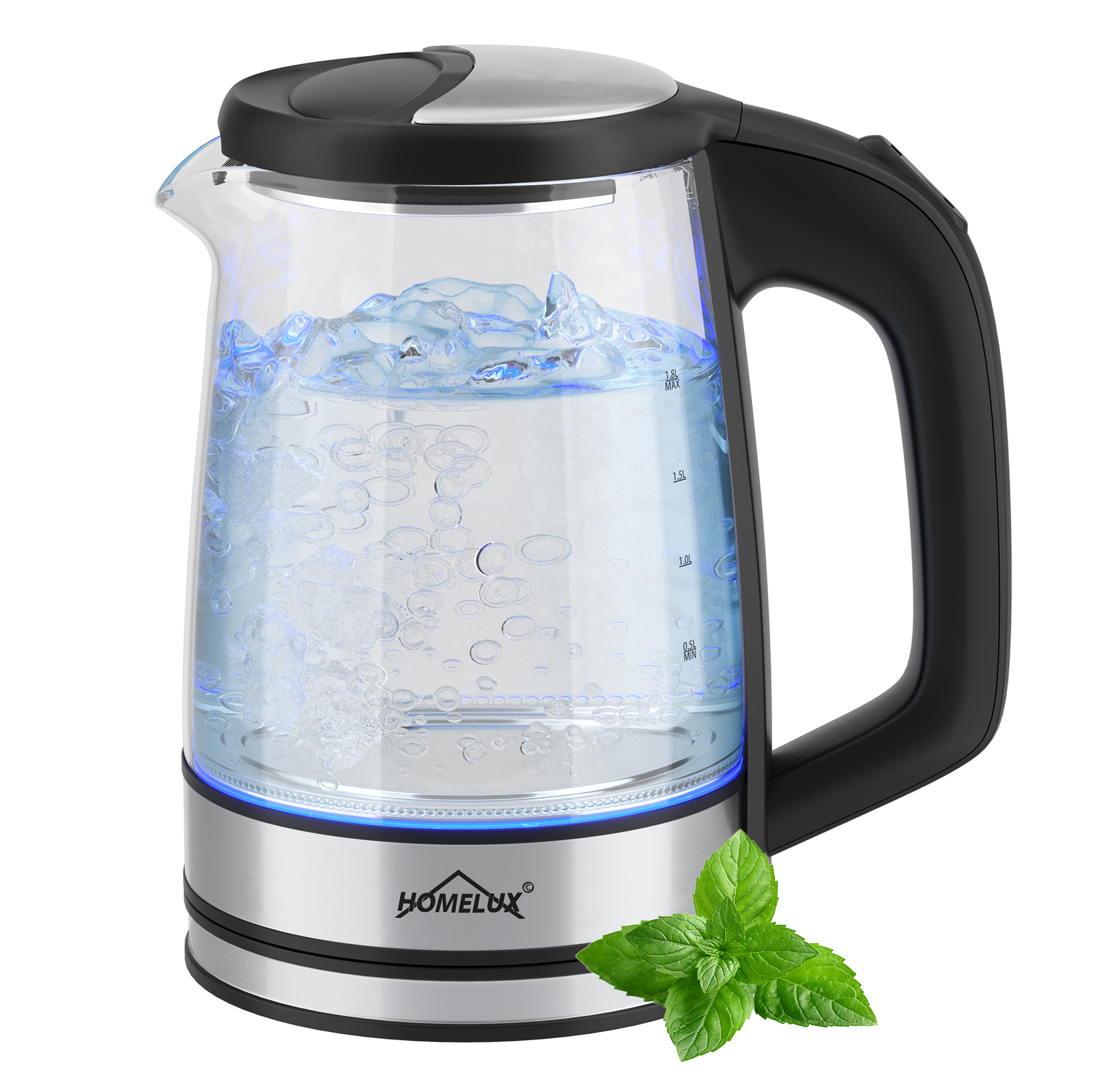 HOMELUX Wasserkocher Wasserkocher Glas 1500 Watt 1,8 L, Electric Kettle Mit Led-Beleuchtung, 1.8 l, 1500,00 W, Glas wasserkocher Edelstahl, Wasser Kocher Bpa Frei, 360° Basis,YQ-309