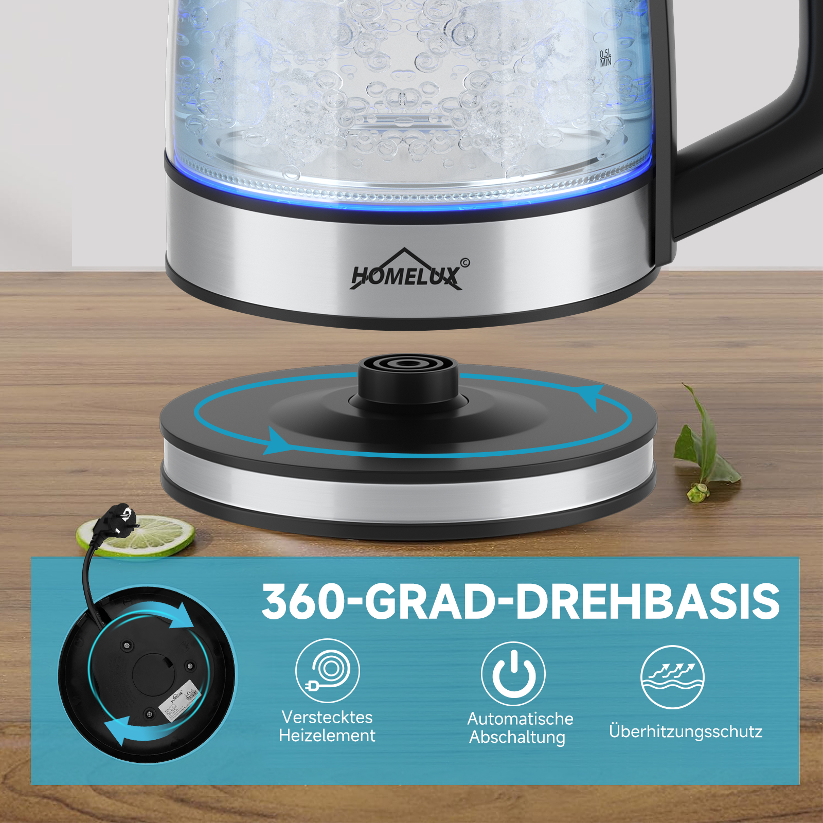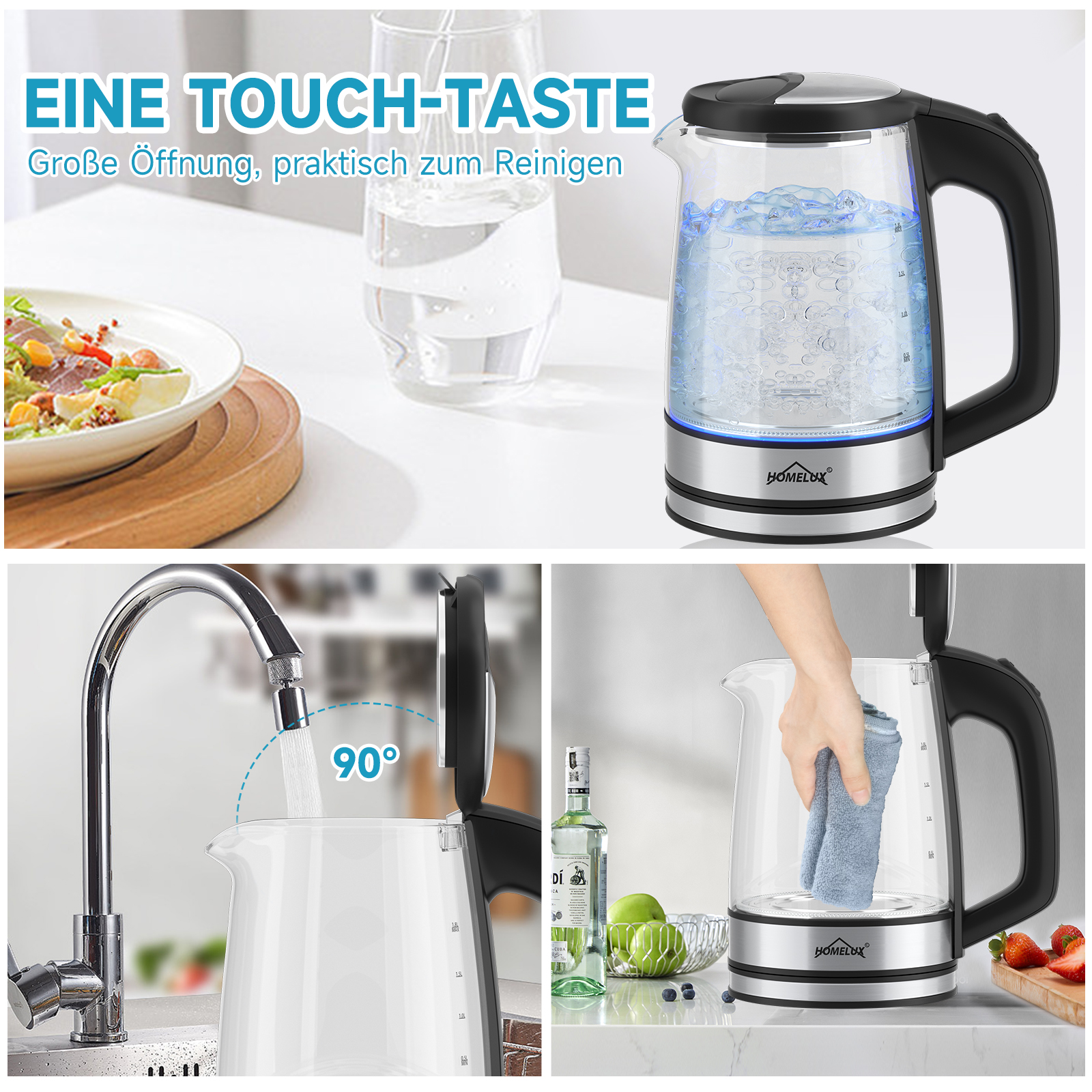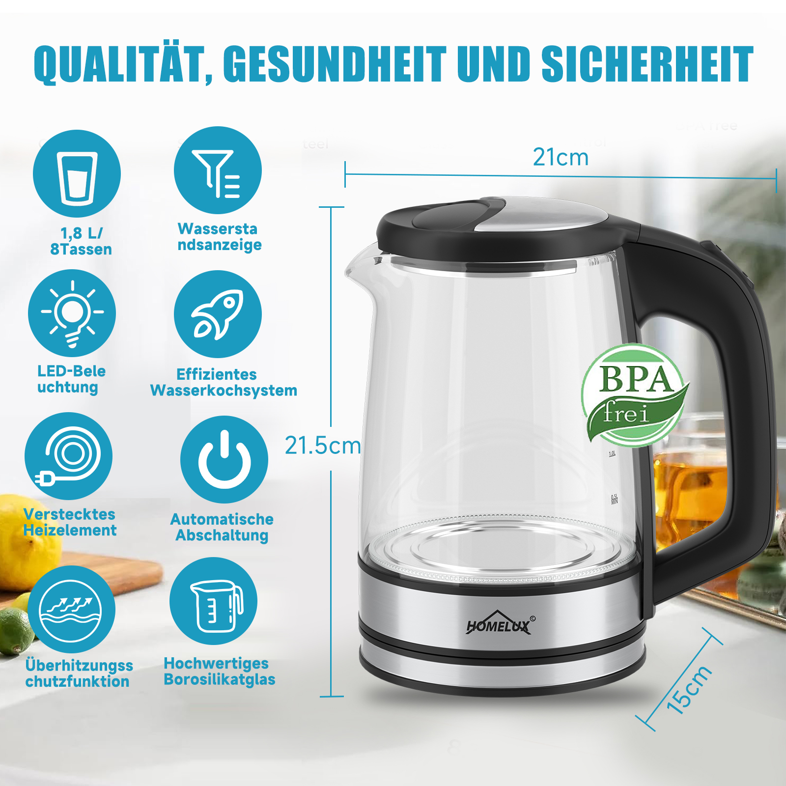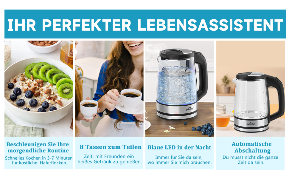 HOMELUX Wasserkocher Wasserkocher Glas 1500 Watt 1,8 L, Electric Kettle Mit Led-Beleuchtung, 1.8 l, 1500,00 W, Glas wasserkocher Edelstahl, Wasser Kocher Bpa Frei, 360° Basis,YQ-309