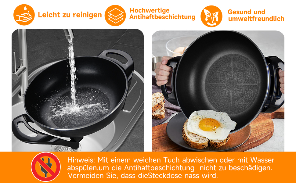 The surface of the electric pan has a non-stick coating, less oil when cooking ensures healthy food and is easy to clean, it is recommended to use a damp cloth to clean it by hand, do not rub the bottom of the pot with sharp objects.